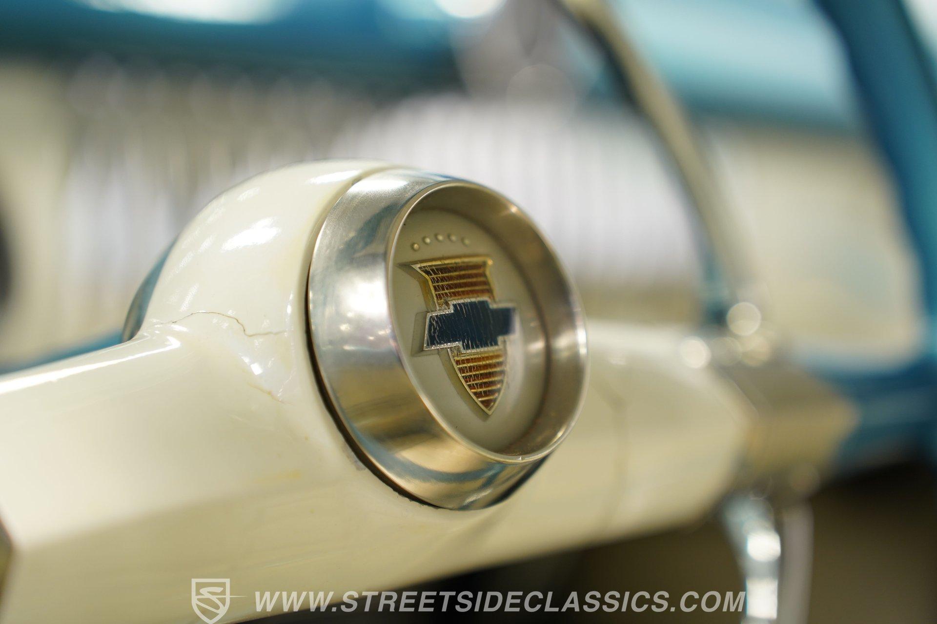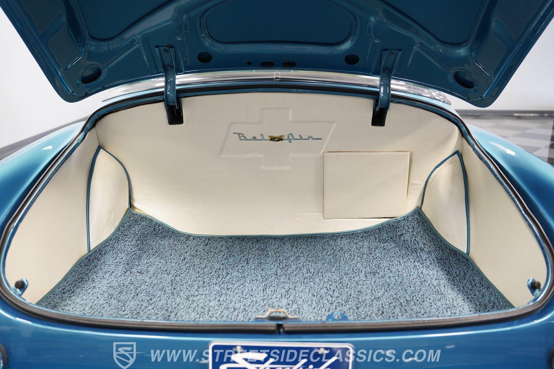 Custom touches continue with pinstriping on the hood and roof, an Impala hood ornament, and Blue Dot taillights that enhance the vintage custom vibe of this Bel Air. The body is straight, panel gaps are even, and the headlights and taillights are clean and clear, helping the car present very well from every angle.