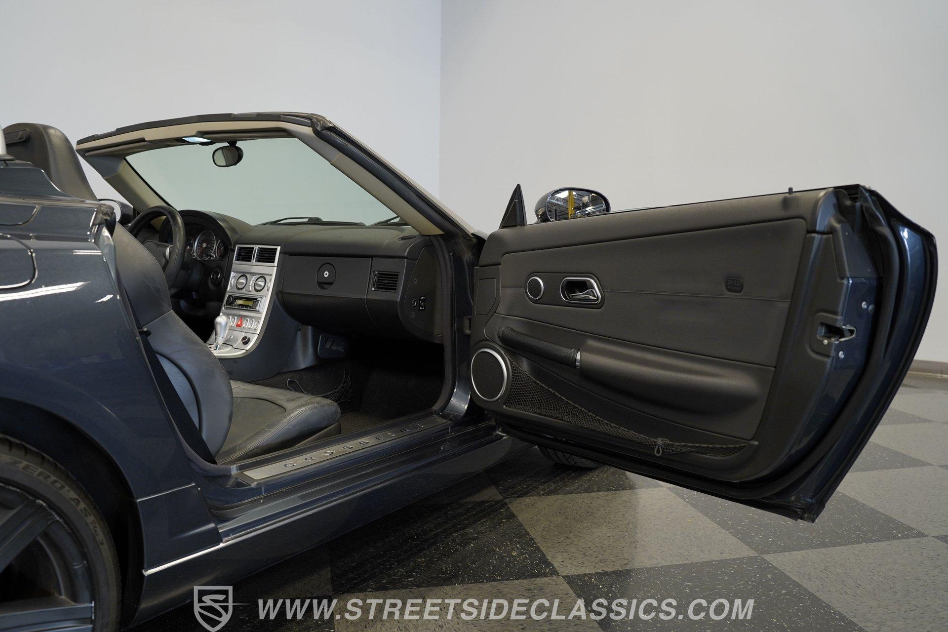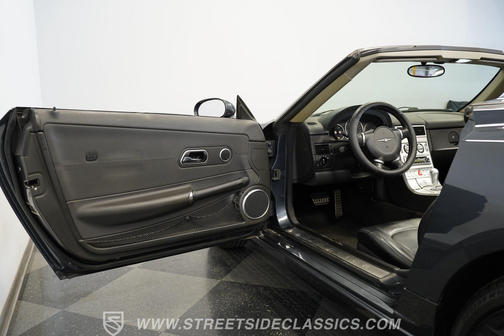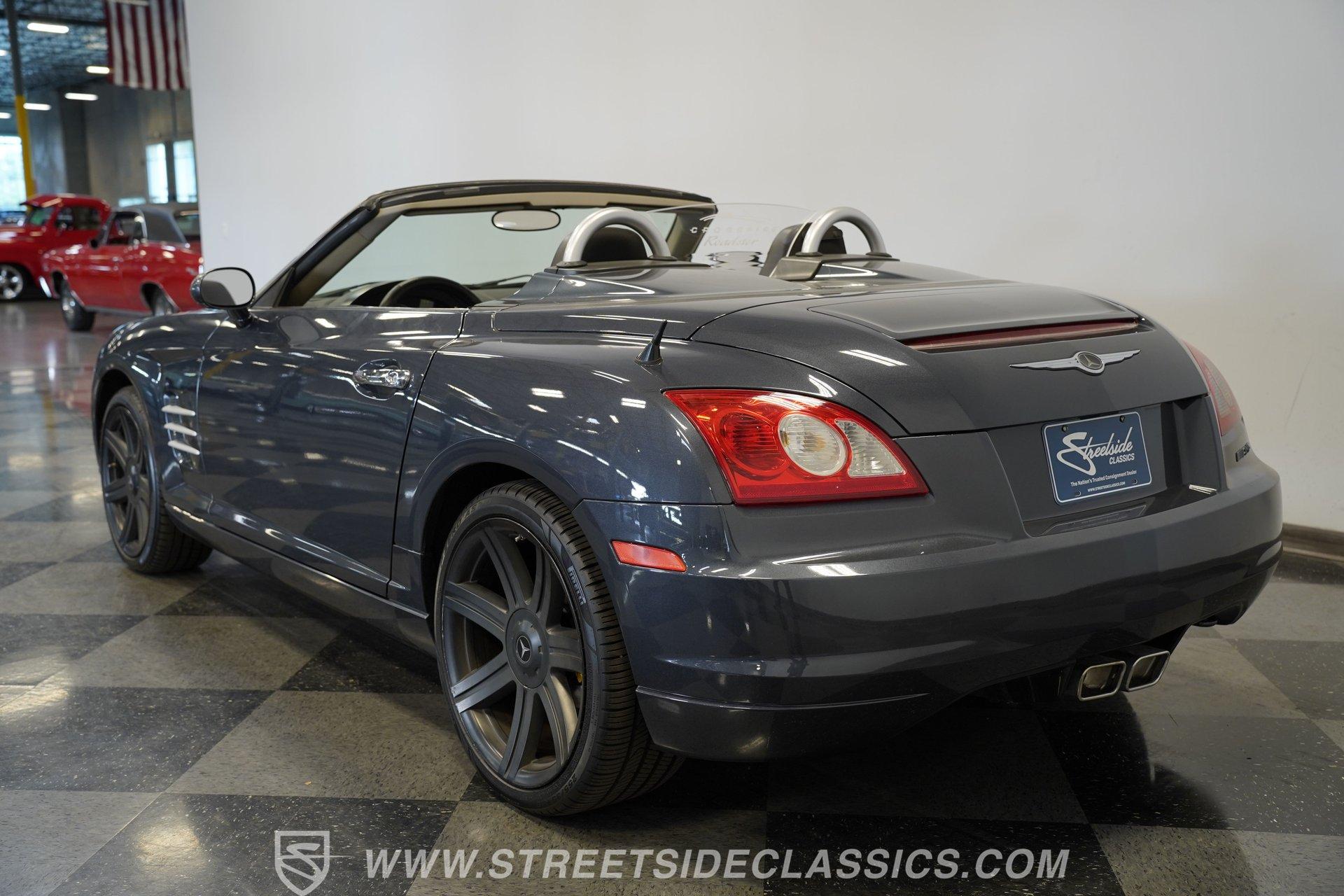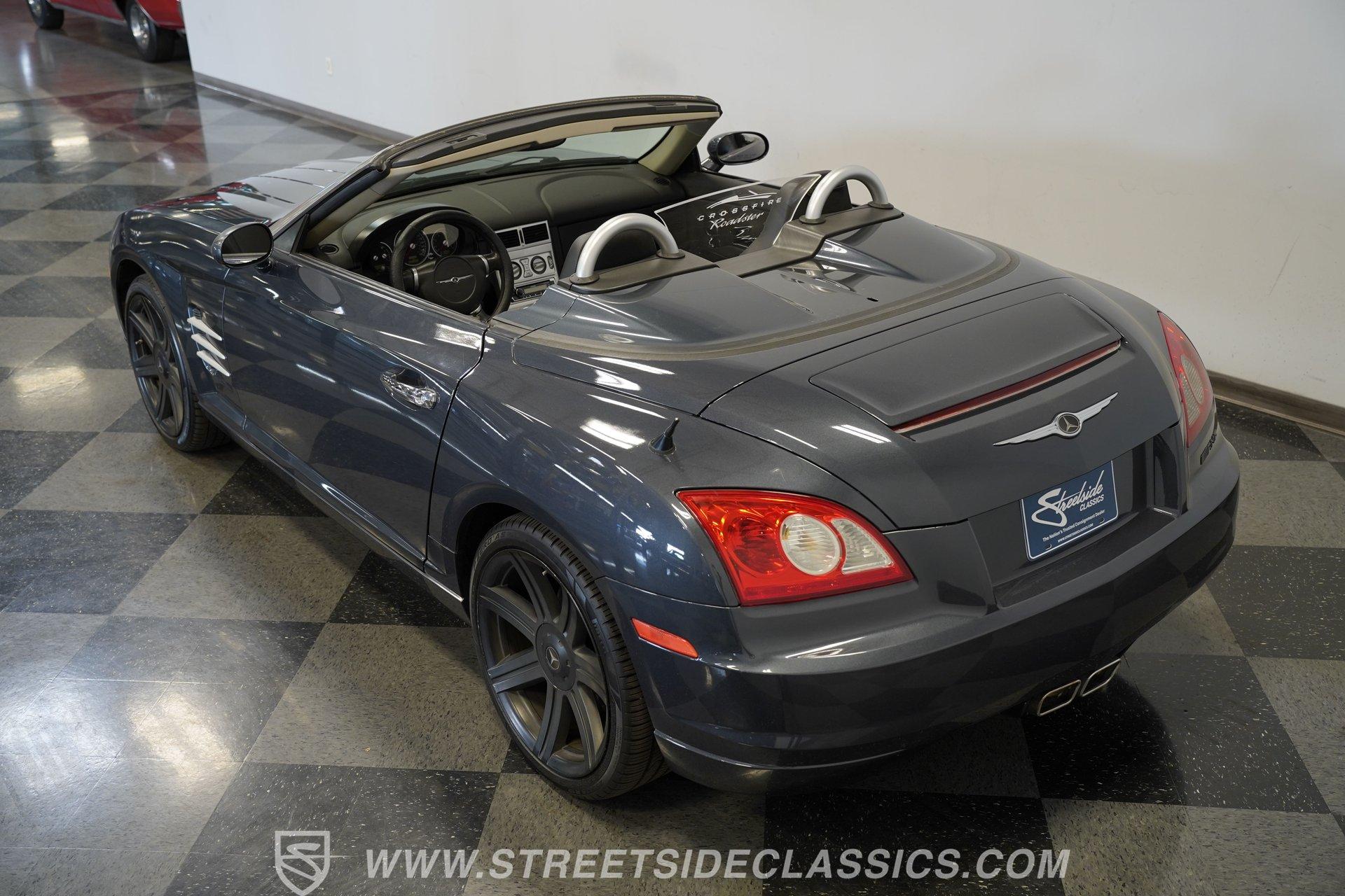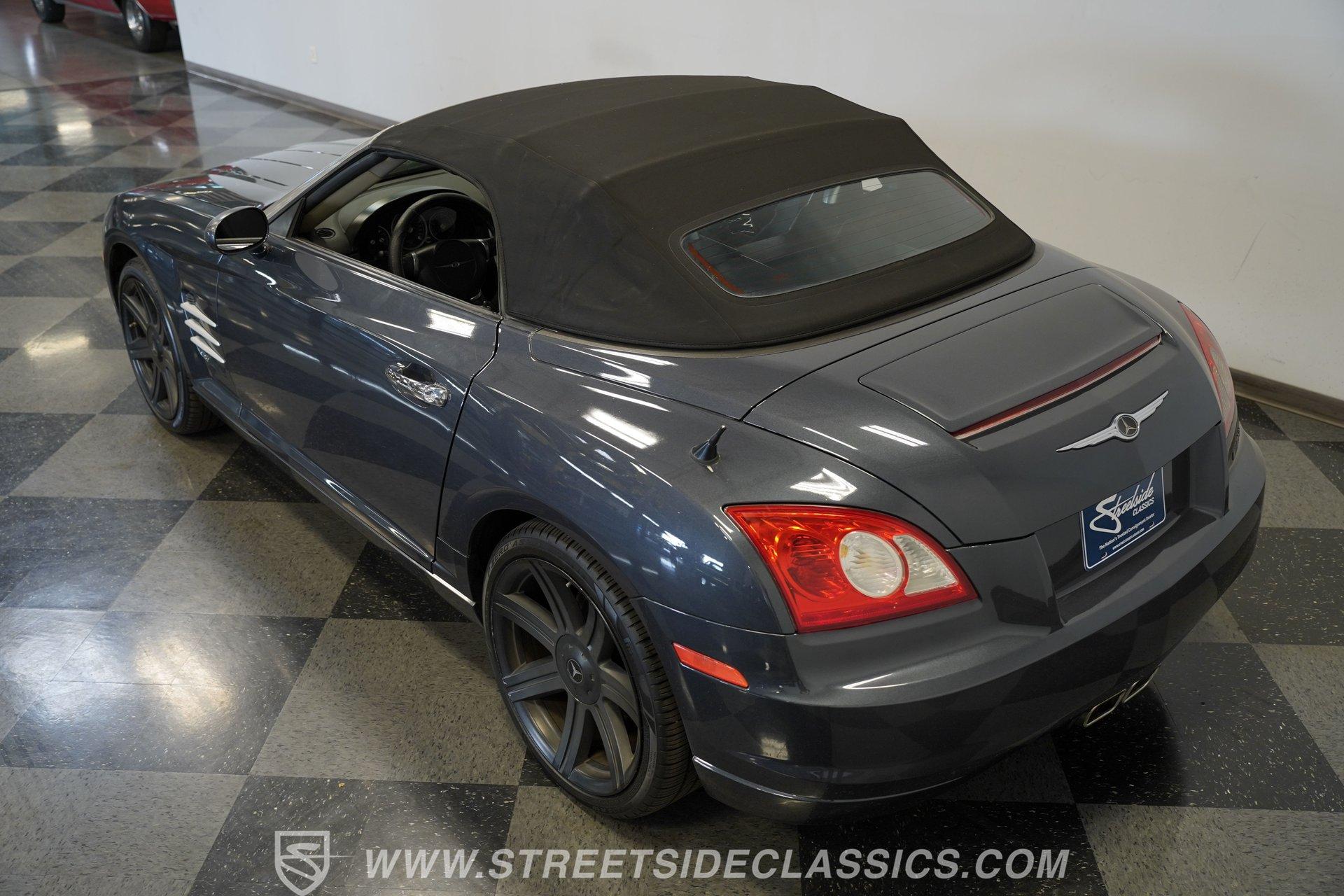 Convertible fun at a great price, this 2006 Chrysler Crossfire Limited Roadster does not disappoint. Finished in gray with a machine-gray clear coat, this sleek roadster is accented by black wheels, yellow brake calipers, and dual exhaust for a sporty look wherever you go. There isn't much brightwork on this car, but what is present shows nicely. The headlights, taillights, and grille are all in good condition, and the window seals and weather stripping appear solid. The doors and hood open and close easily, and the body panels look straight with even gaps throughout.