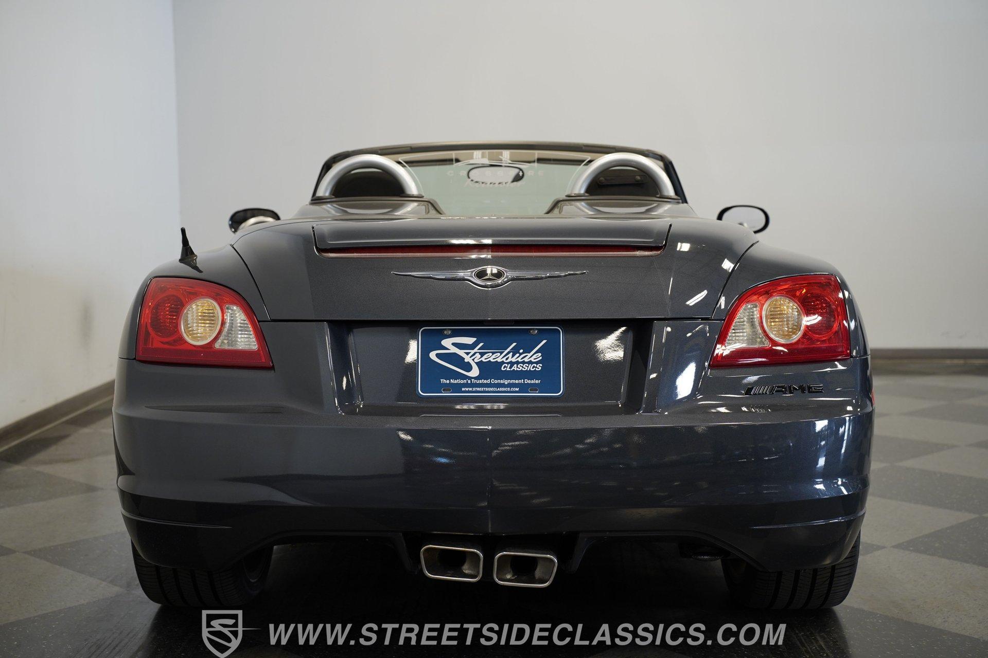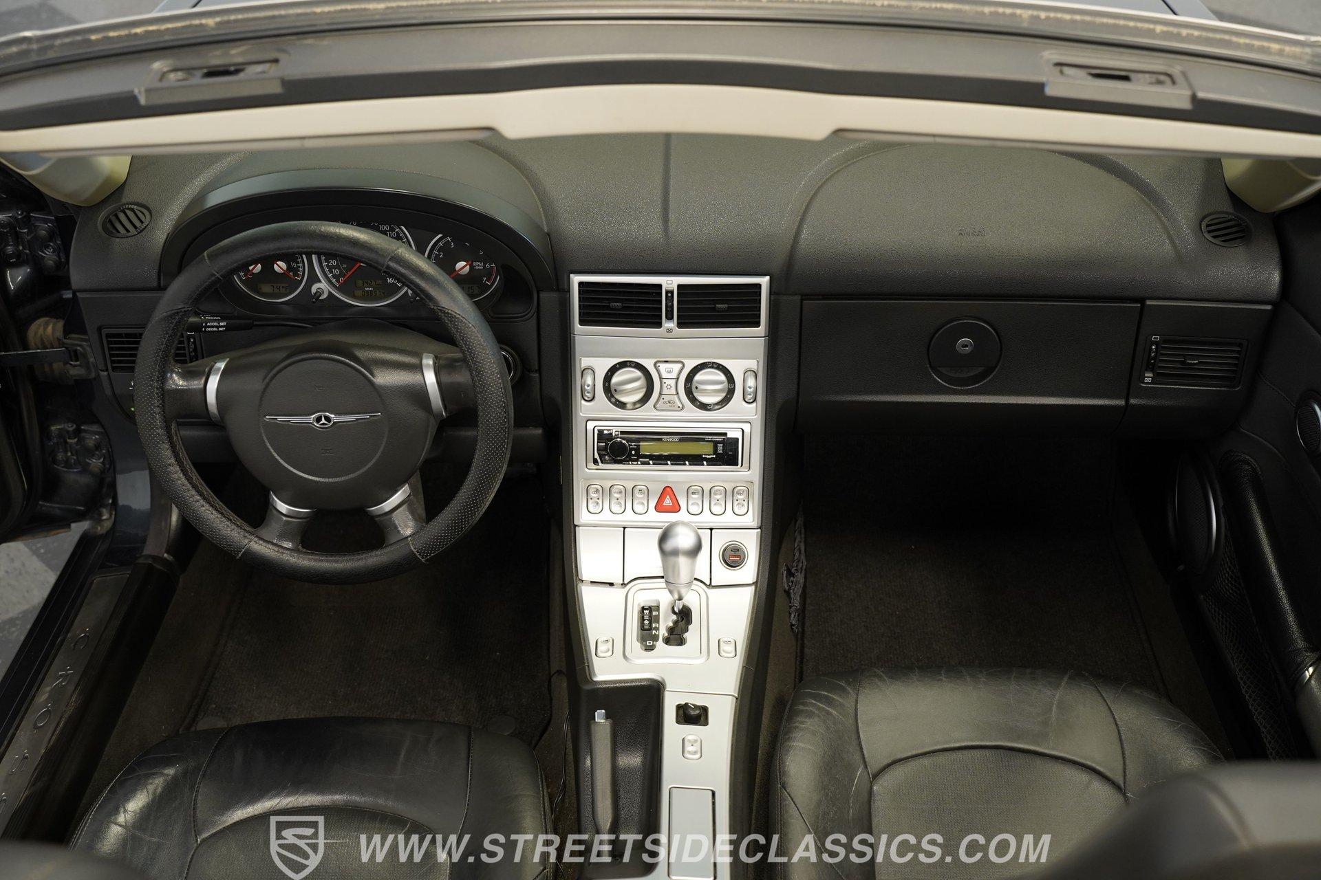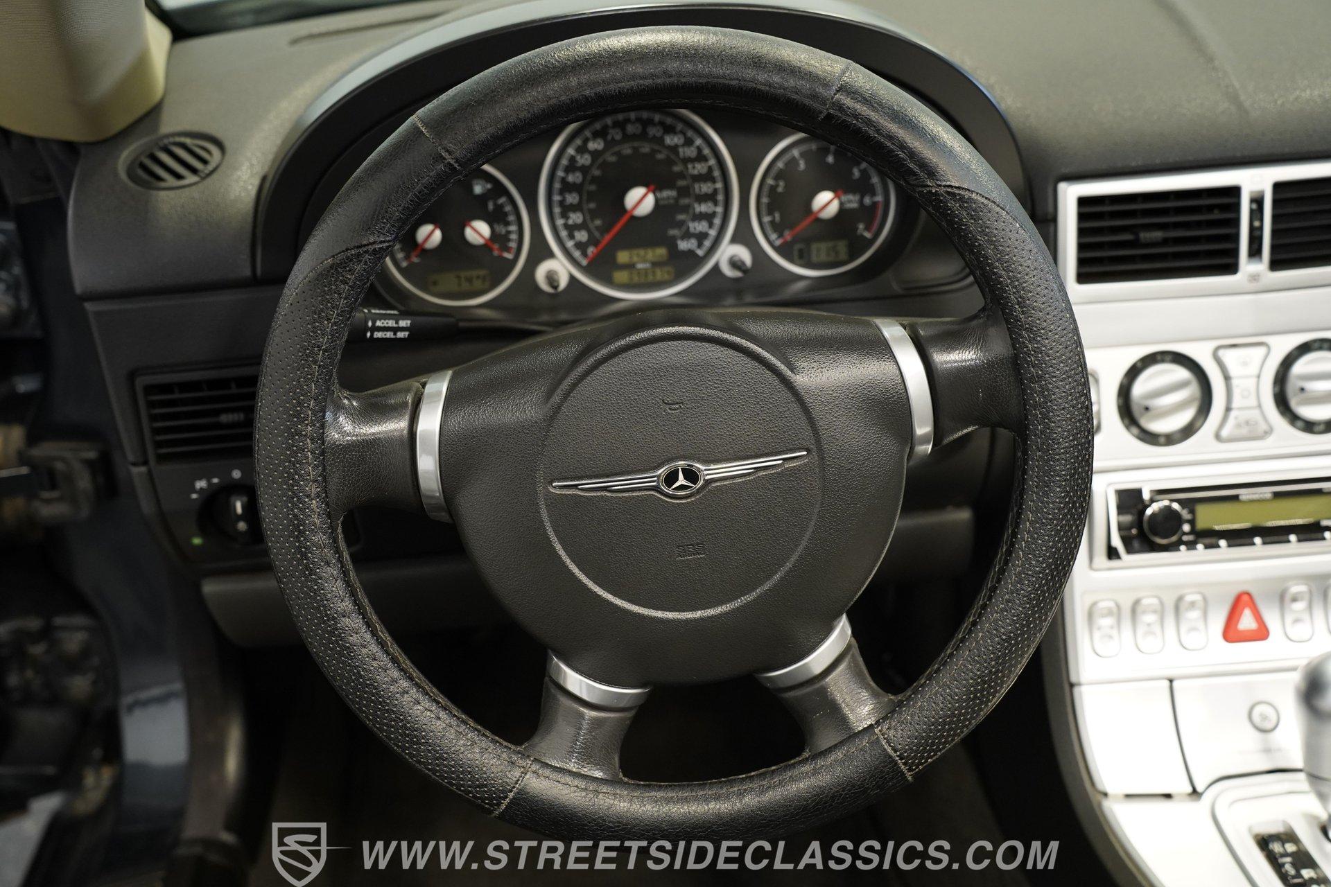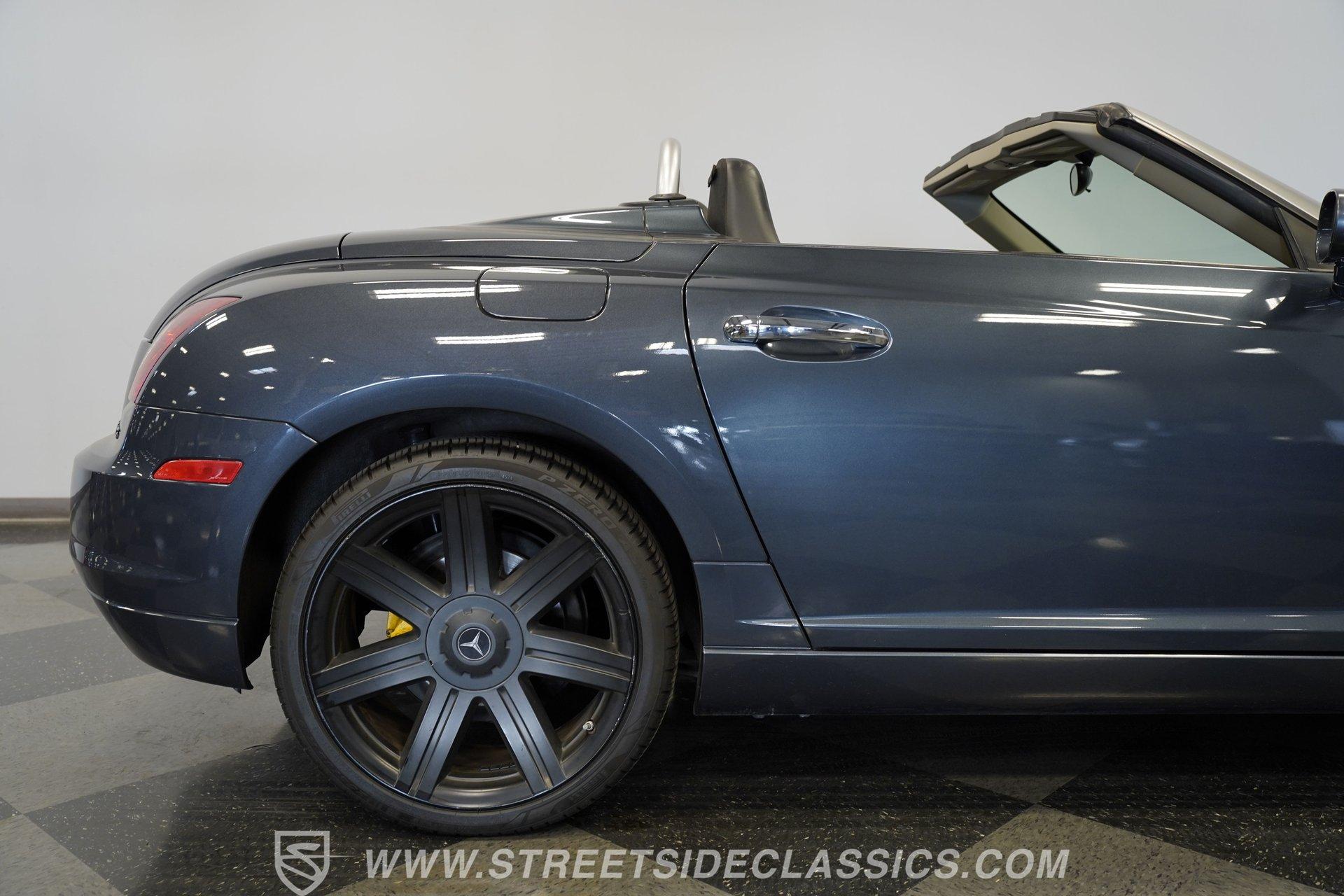 Convertible fun at a great price, this 2006 Chrysler Crossfire Limited Roadster does not disappoint. Finished in gray with a machine-gray clear coat, this sleek roadster is accented by black wheels, yellow brake calipers, and dual exhaust for a sporty look wherever you go. There isn't much brightwork on this car, but what is present shows nicely. The headlights, taillights, and grille are all in good condition, and the window seals and weather stripping appear solid. The doors and hood open and close easily, and the body panels look straight with even gaps throughout.