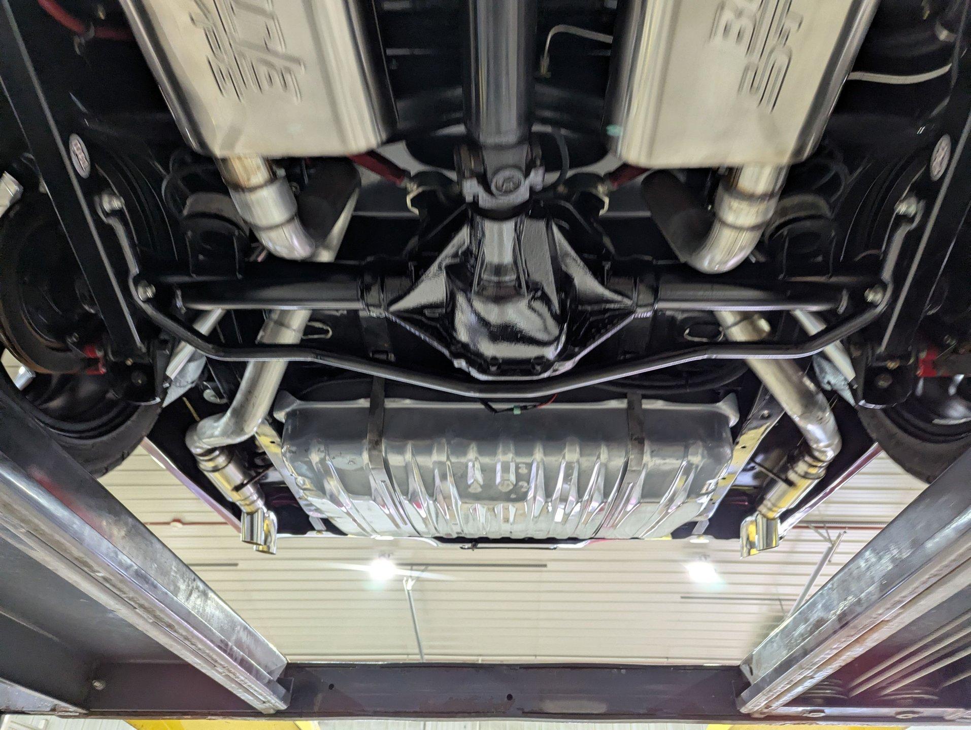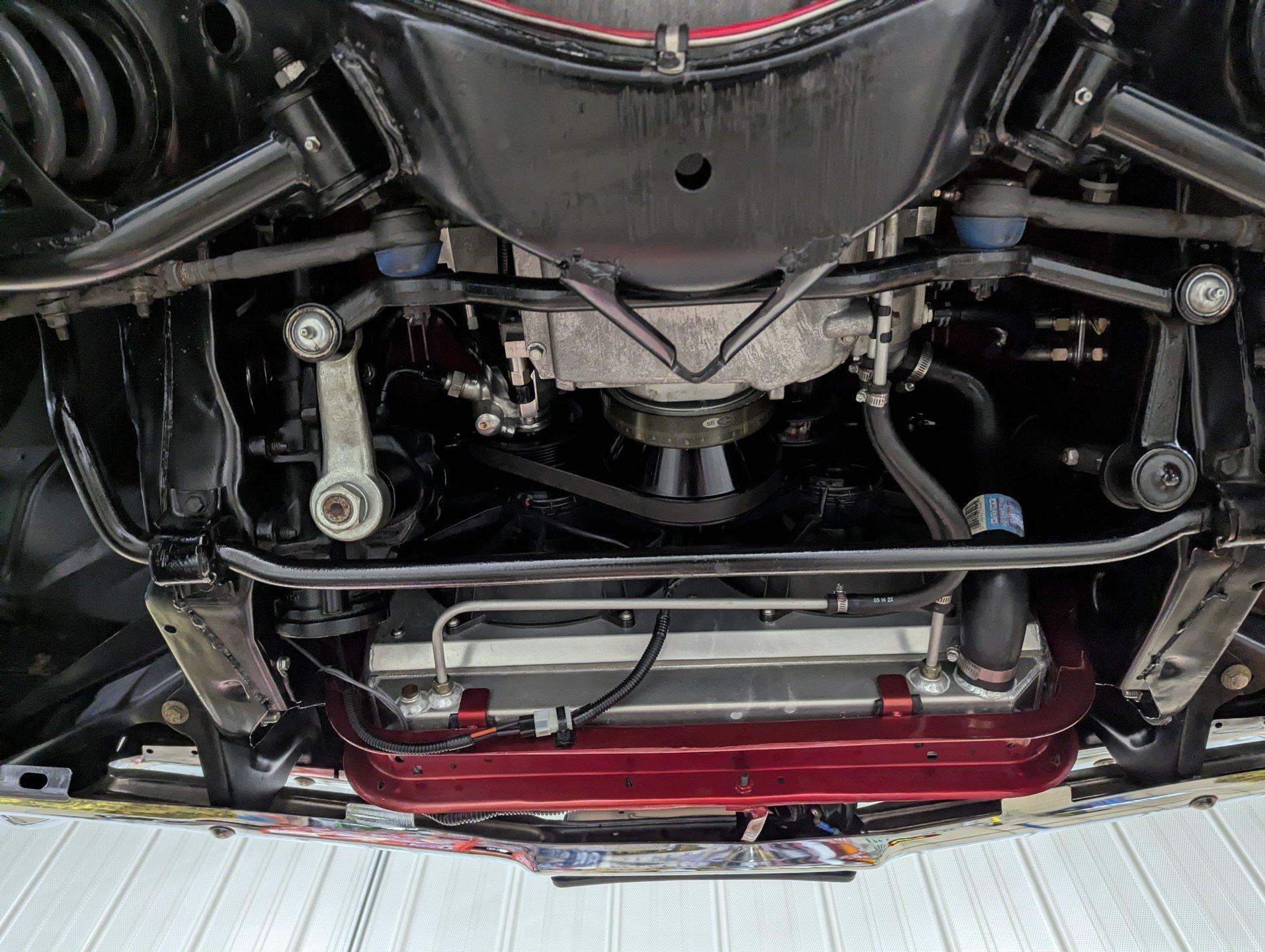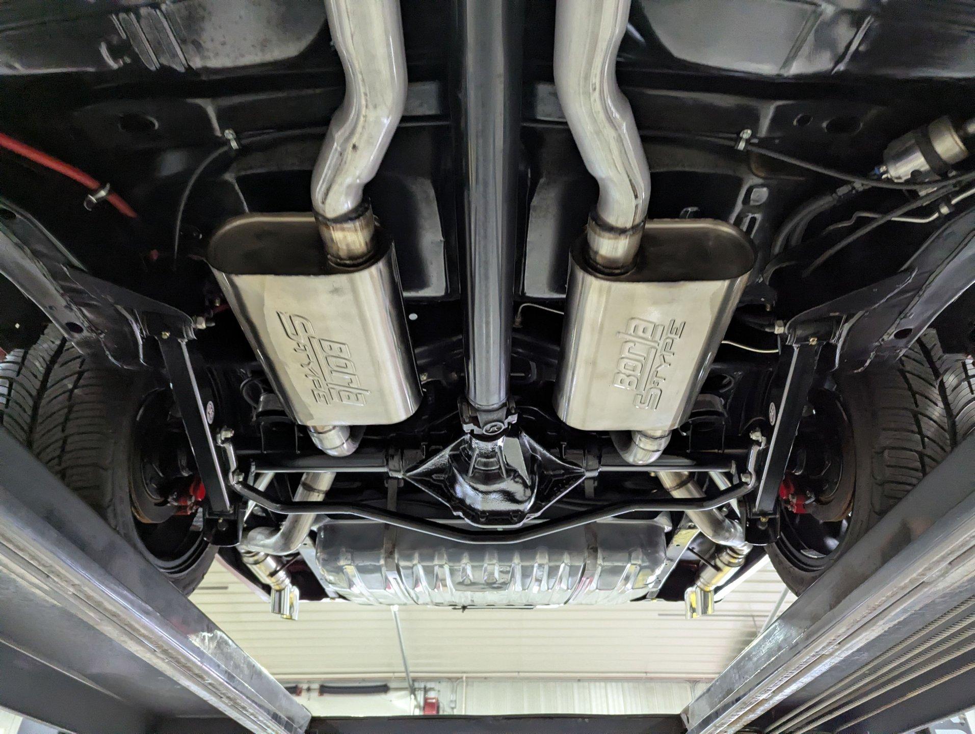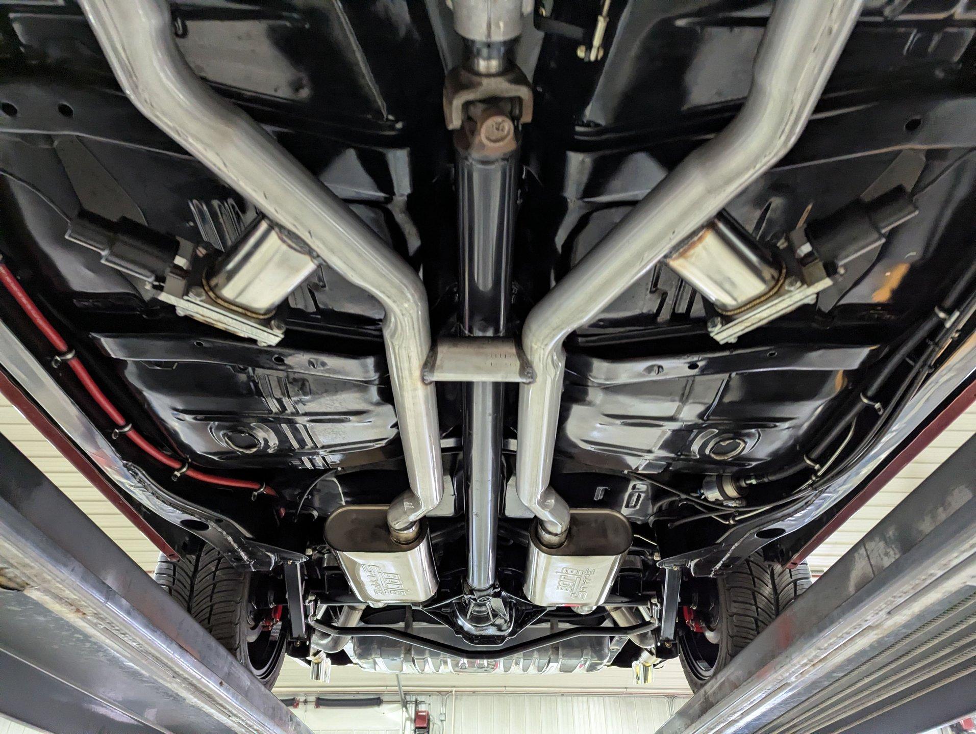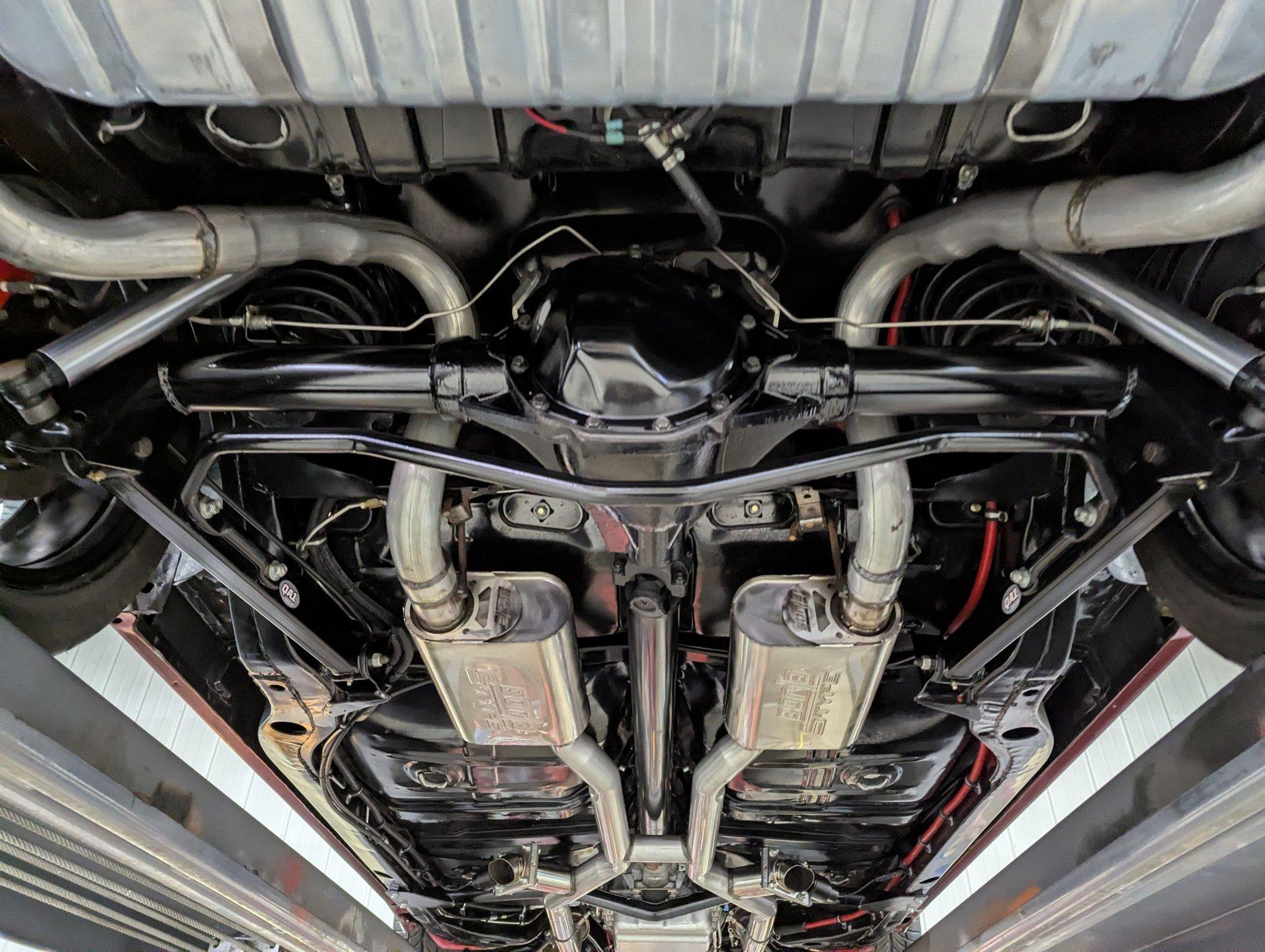 UNDERSIDE: The body was removed from the frame and placed on a rotisserie, allowing the underside to be upgraded, restored and detailed. The floors are pristine metal, finished in a smooth gloss black finish. The frame has been boxed, prepped, and powder coated for added strength and durability. All of the steering and suspension components are new. Up front, it's upgraded with UMI tubular control arms, QA1 lowering springs, and QA1 gas shocks. In the rear, it features QA1 control arms, lowering springs, gas shocks, and a swaybar for improved stability and handling. Stopping power comes from a Wilwood brake system with disc brakes at all four wheels and stainless steel lines for a clean, reliable setup. The custom dual exhaust system is equally impressive, equipped with QTP stainless electric cutouts, polished stainless Borla S-Type mufflers, resonators, and the popular GTO splitter tips-delivering an aggressive tone when you want it and a refined note when you don't. The fuel system is completely new and upgraded to support the fuel-injected engine. Looking up at the motor, you'll see aluminum components and a high-torque starter. A 4L65E overdrive automatic transmission sends power through a rebuilt driveshaft to a 12-bolt rear end featuring a Moser Muscle Pack with 3.73 posi gears. The entire underside reflects the same level of quality and attention to detail as the top side-clean, purposeful, and built to perform.