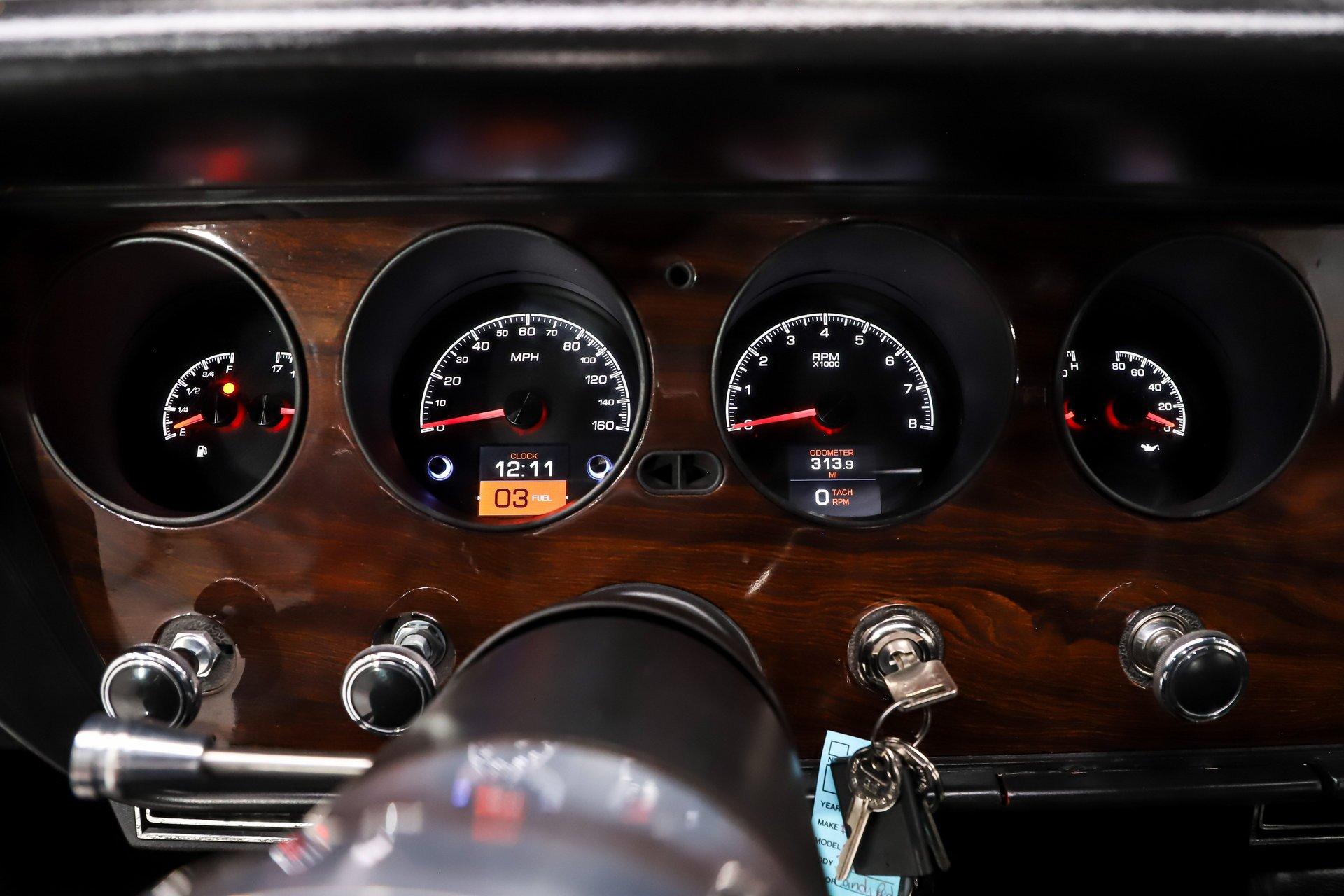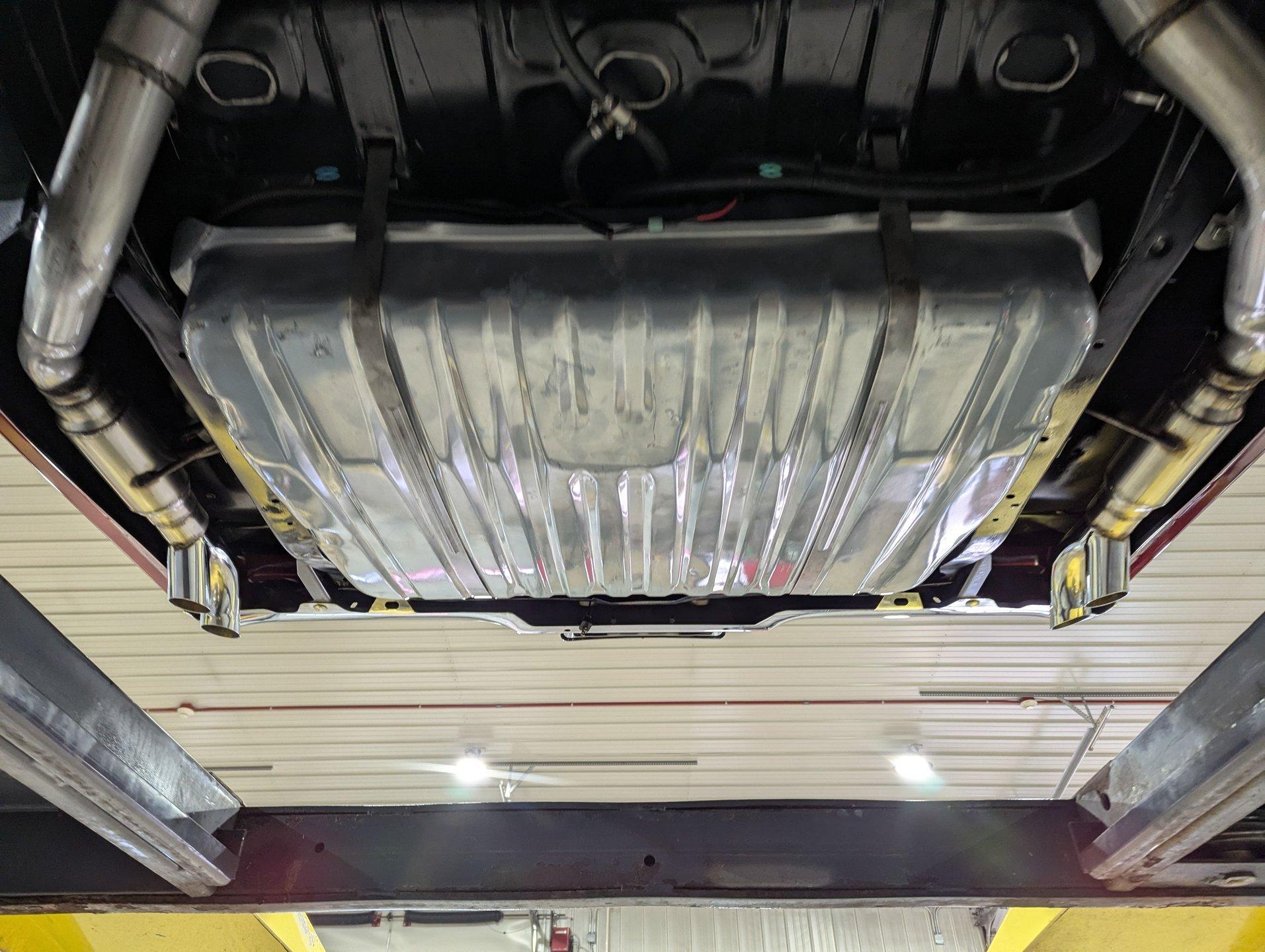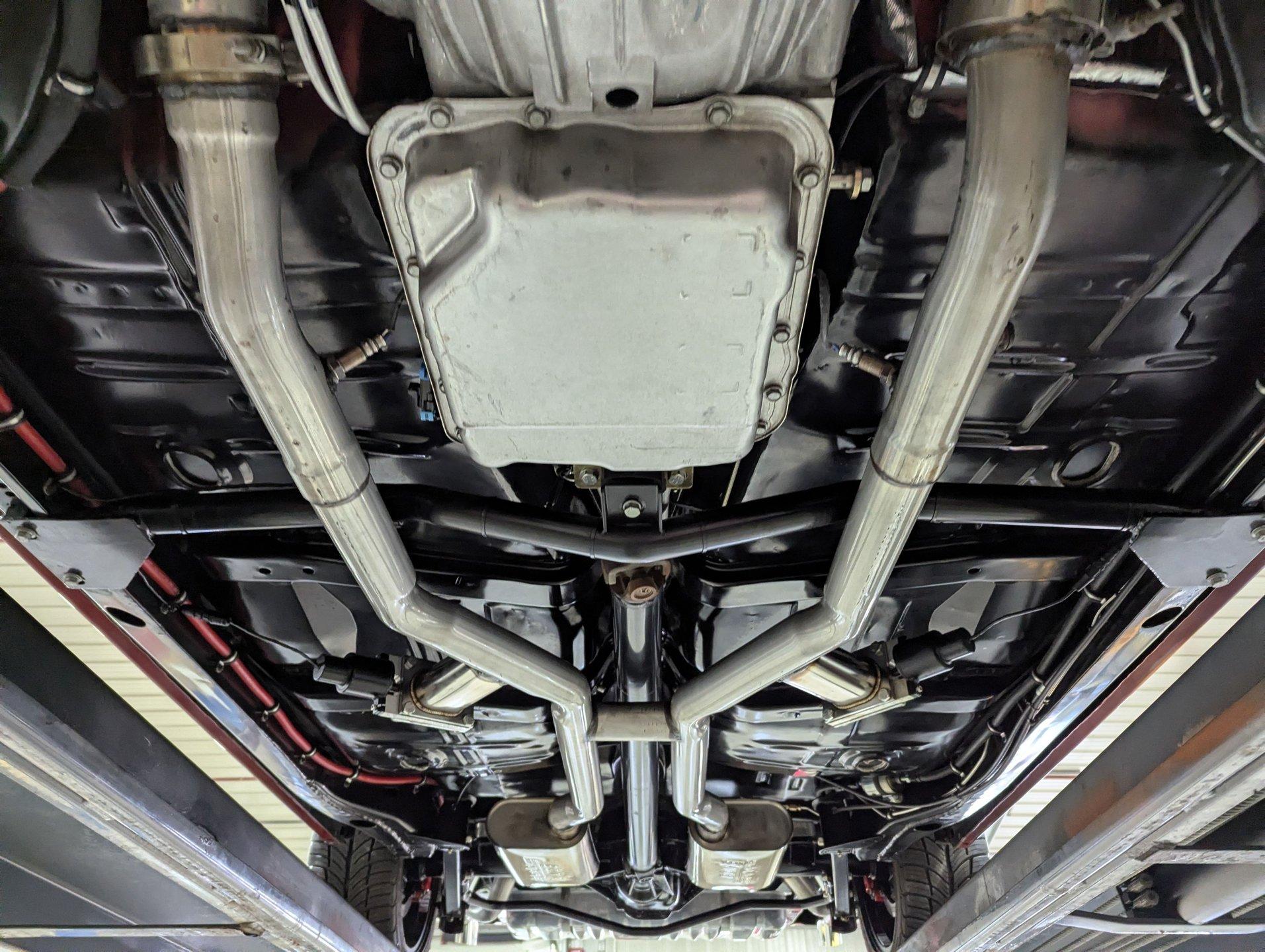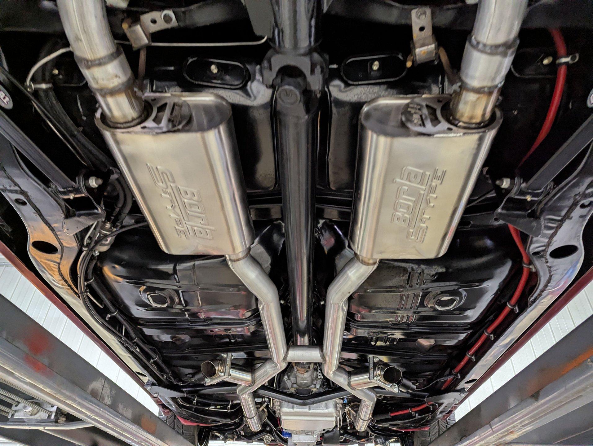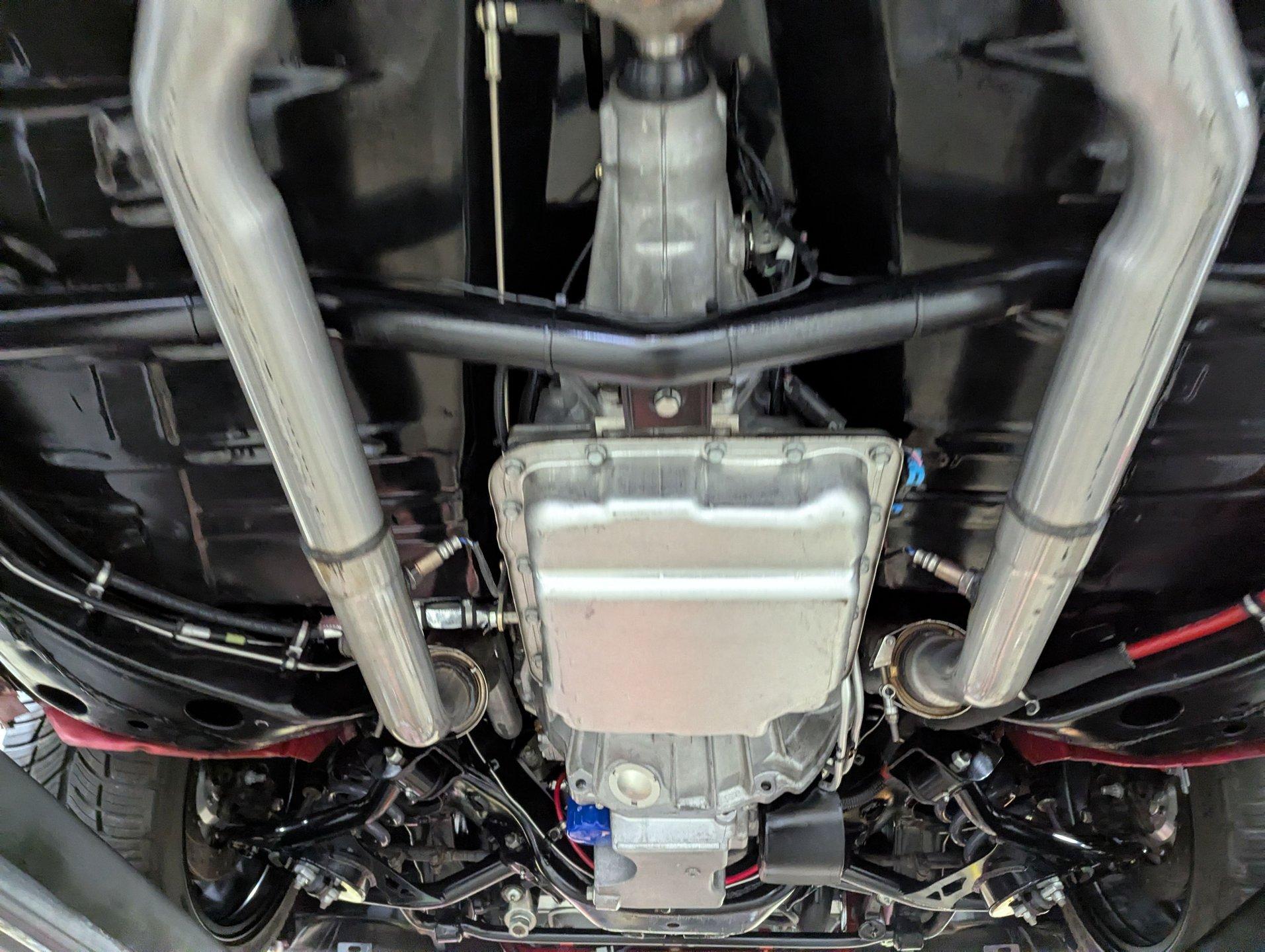 UNDERSIDE: The body was removed from the frame and placed on a rotisserie, allowing the underside to be upgraded, restored and detailed. The floors are pristine metal, finished in a smooth gloss black finish. The frame has been boxed, prepped, and powder coated for added strength and durability. All of the steering and suspension components are new. Up front, it's upgraded with UMI tubular control arms, QA1 lowering springs, and QA1 gas shocks. In the rear, it features QA1 control arms, lowering springs, gas shocks, and a swaybar for improved stability and handling. Stopping power comes from a Wilwood brake system with disc brakes at all four wheels and stainless steel lines for a clean, reliable setup. The custom dual exhaust system is equally impressive, equipped with QTP stainless electric cutouts, polished stainless Borla S-Type mufflers, resonators, and the popular GTO splitter tips-delivering an aggressive tone when you want it and a refined note when you don't. The fuel system is completely new and upgraded to support the fuel-injected engine. Looking up at the motor, you'll see aluminum components and a high-torque starter. A 4L65E overdrive automatic transmission sends power through a rebuilt driveshaft to a 12-bolt rear end featuring a Moser Muscle Pack with 3.73 posi gears. The entire underside reflects the same level of quality and attention to detail as the top side-clean, purposeful, and built to perform.