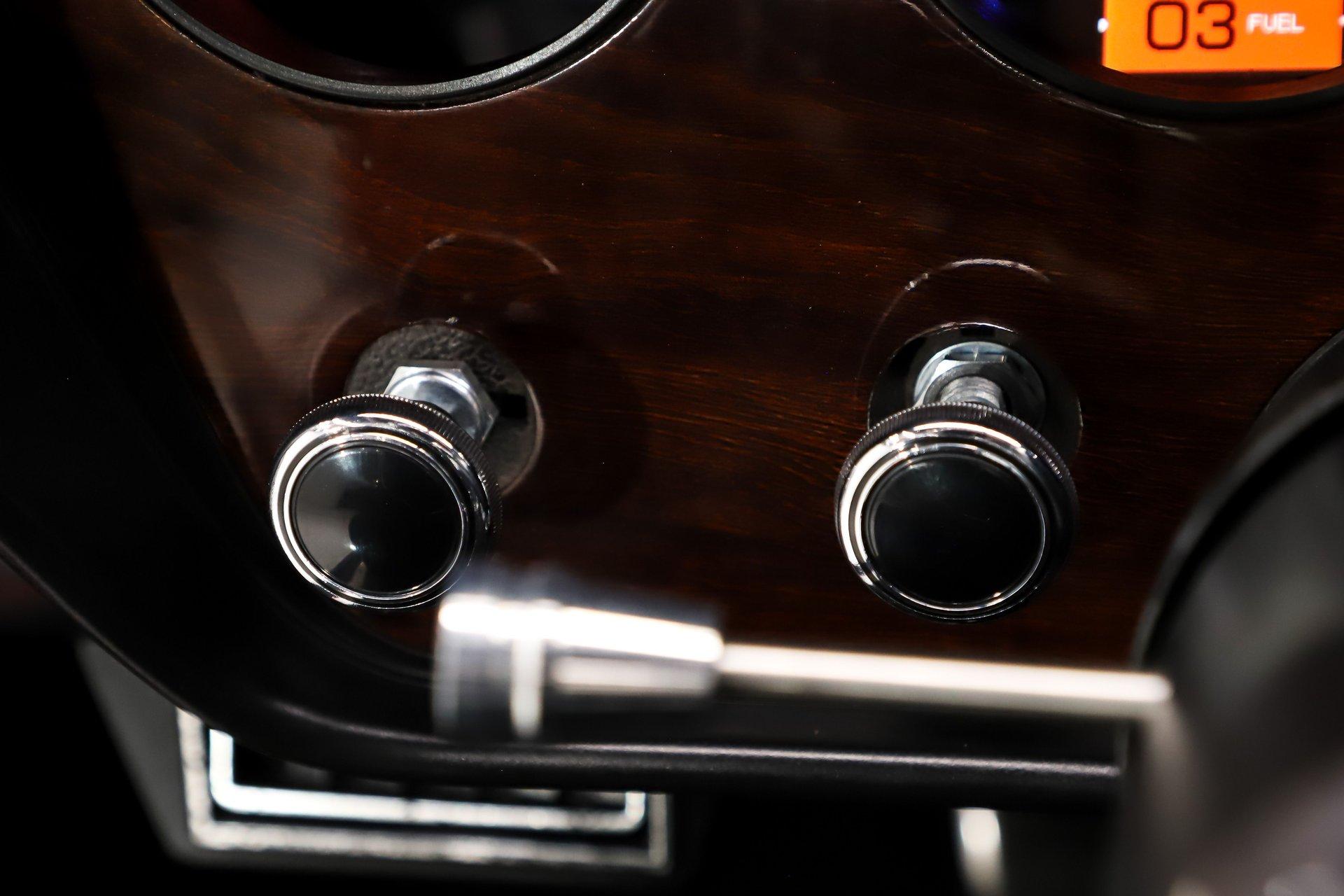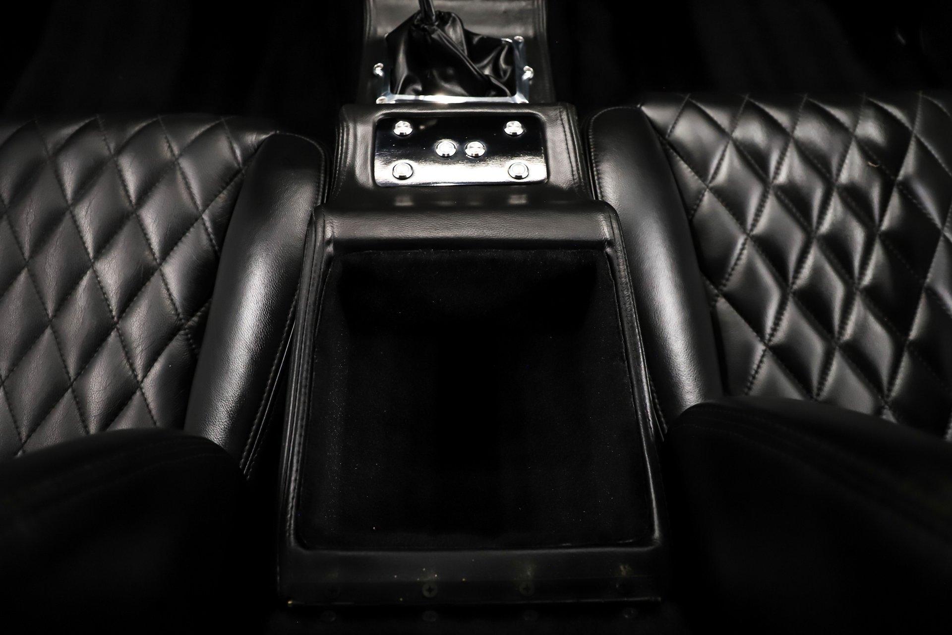 INTERIOR: Full custom interior that blends luxury with a sporty edge. The custom door panels and console are wrapped in genuine leather, while the seats feature black leather upholstery with diamond stitching including the ProCar Elite buckets in front. Sound deadener was installed under the black carpet, and it's finished with floor mats and new seatbelts. The wiring and fuse panel were completely replaced using an American Autowire kit. A Billet Specialties steering wheel is mounted on an Ididit tilt column, facing a set of HDX gauges. The dash features a custom wood trim bezel with matching inserts on the door panels. The center console houses the power window and door lock controls along with a Lokar floor shifter and cup holders. The sound system is serious: Phoenix Gold RX speakers, midrange drivers and tweeters in the doors, two 12-inch subwoofers, and a 6-channel 1,000-watt amplifier, all controlled by a Bluetooth stereo. It also features very nice digital climate controls plus a custom headliner and visors to finish it off.
