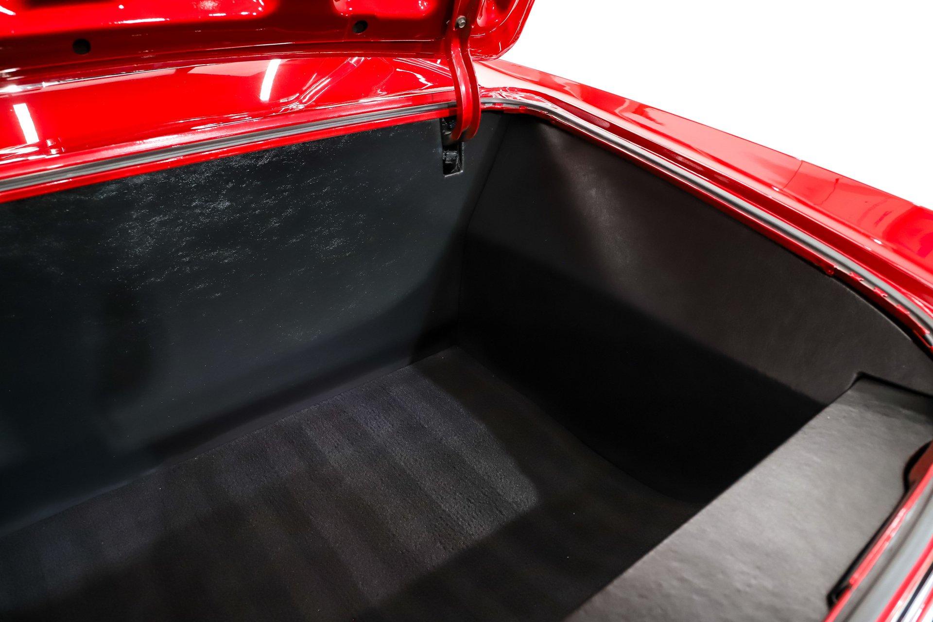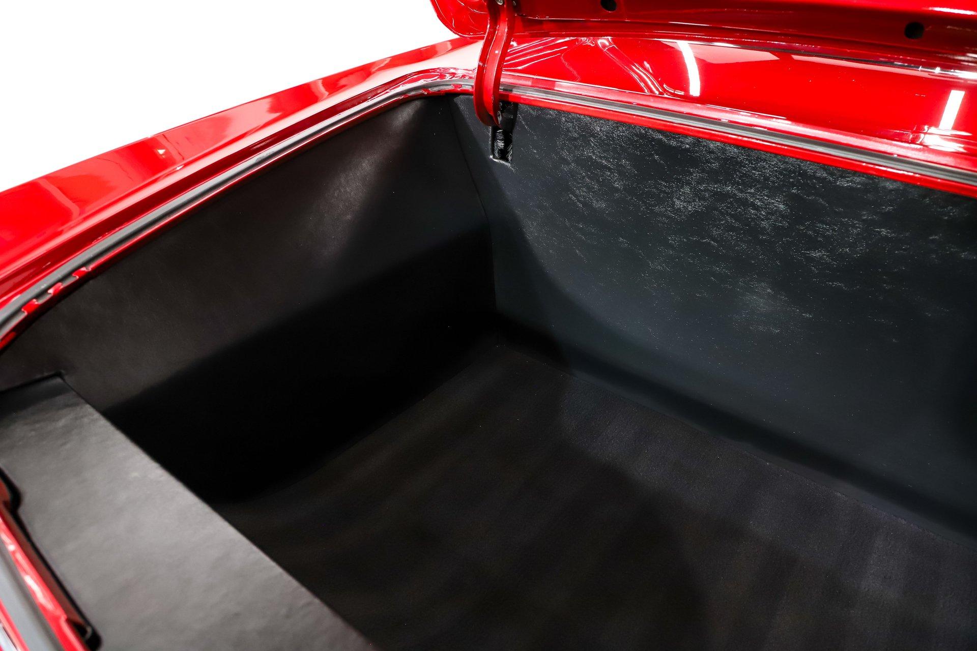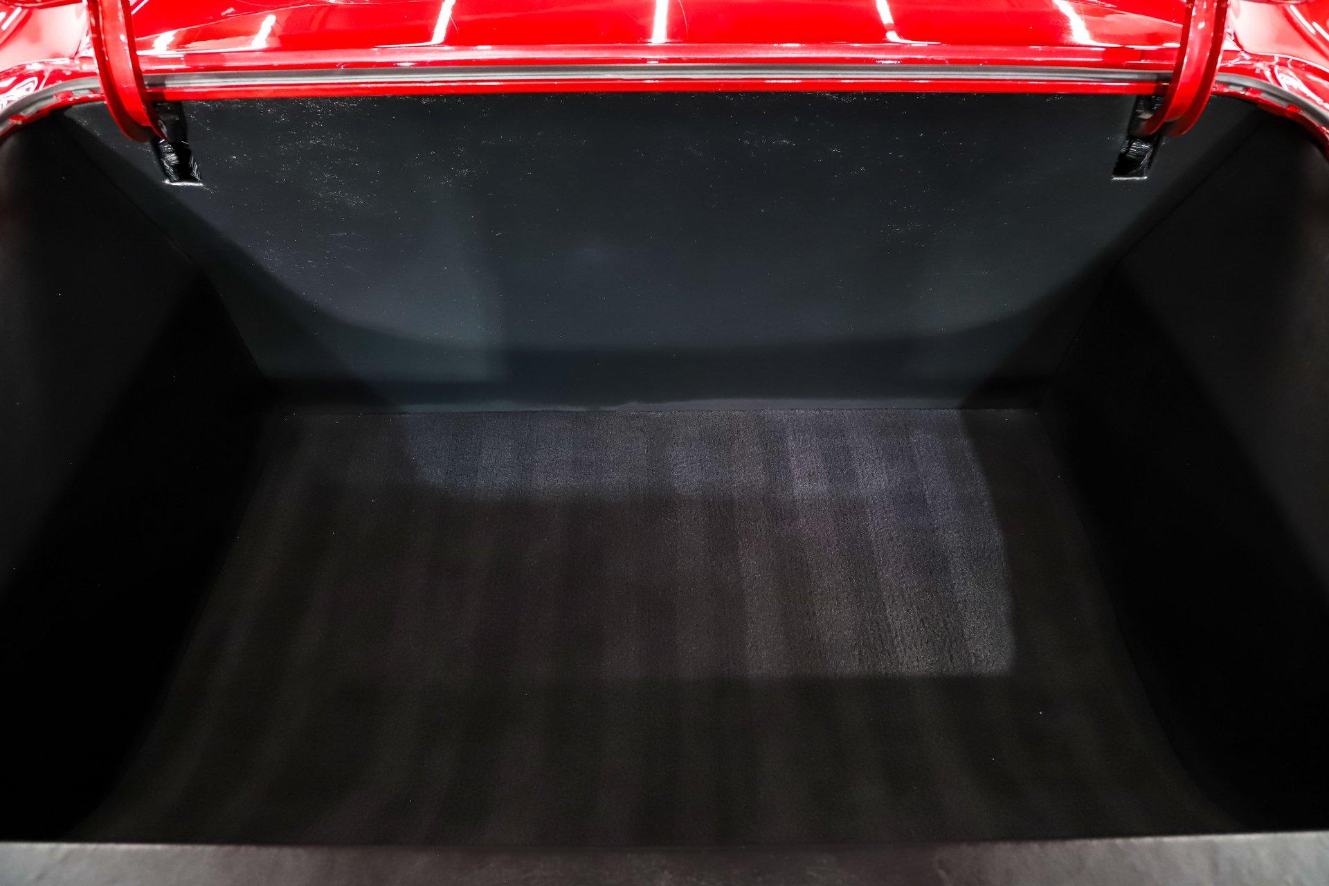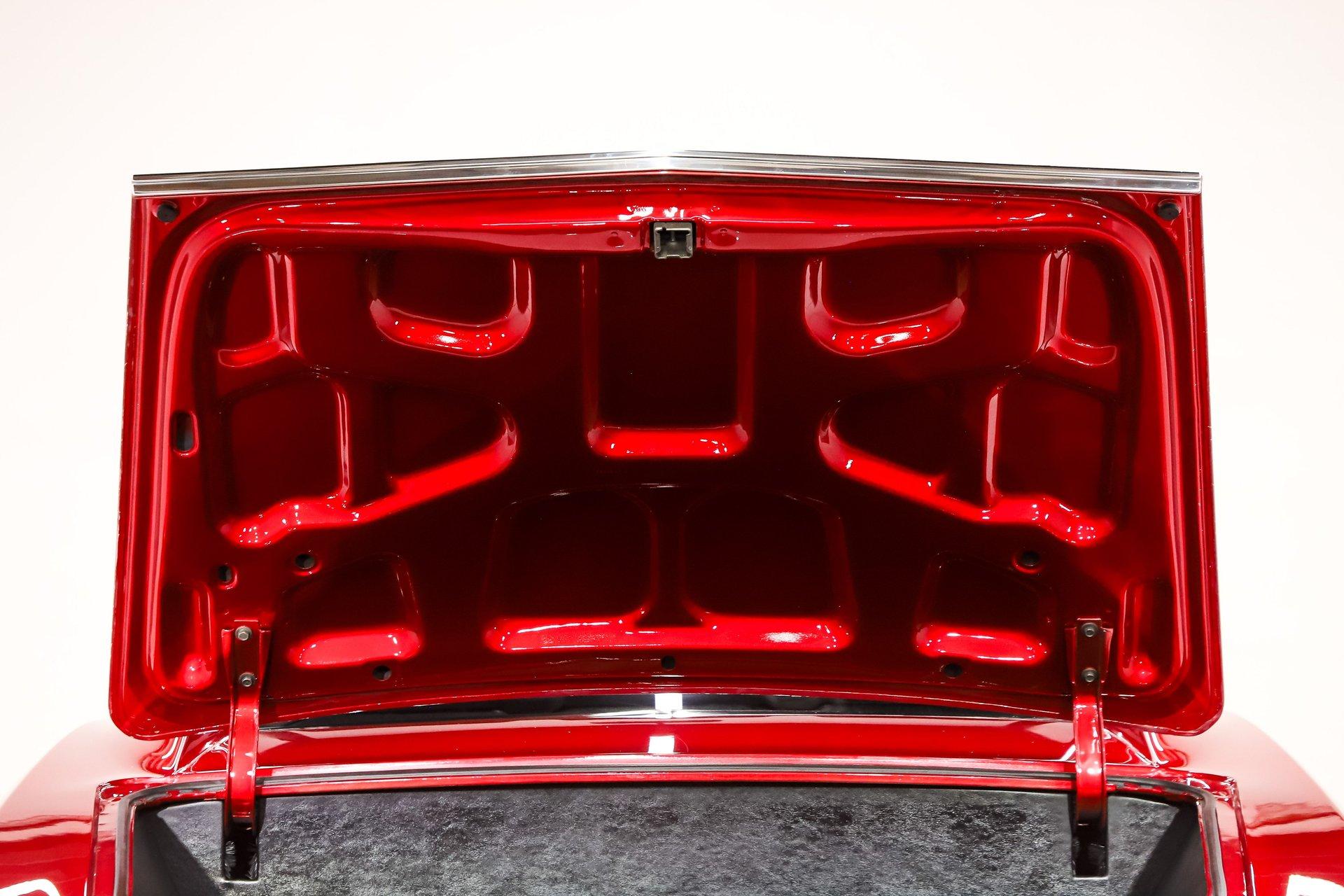 TRUNK COMPARTMENT: Under the trunk lid and the jamb have the same radiant finish as the exterior. Inside, the trunk is fully boxed for a clean, custom look while neatly concealing the dual battery system and stereo equipment. The compartment is upholstered and finished with a carpeted floor, giving it a very tidy, show quality appearance.