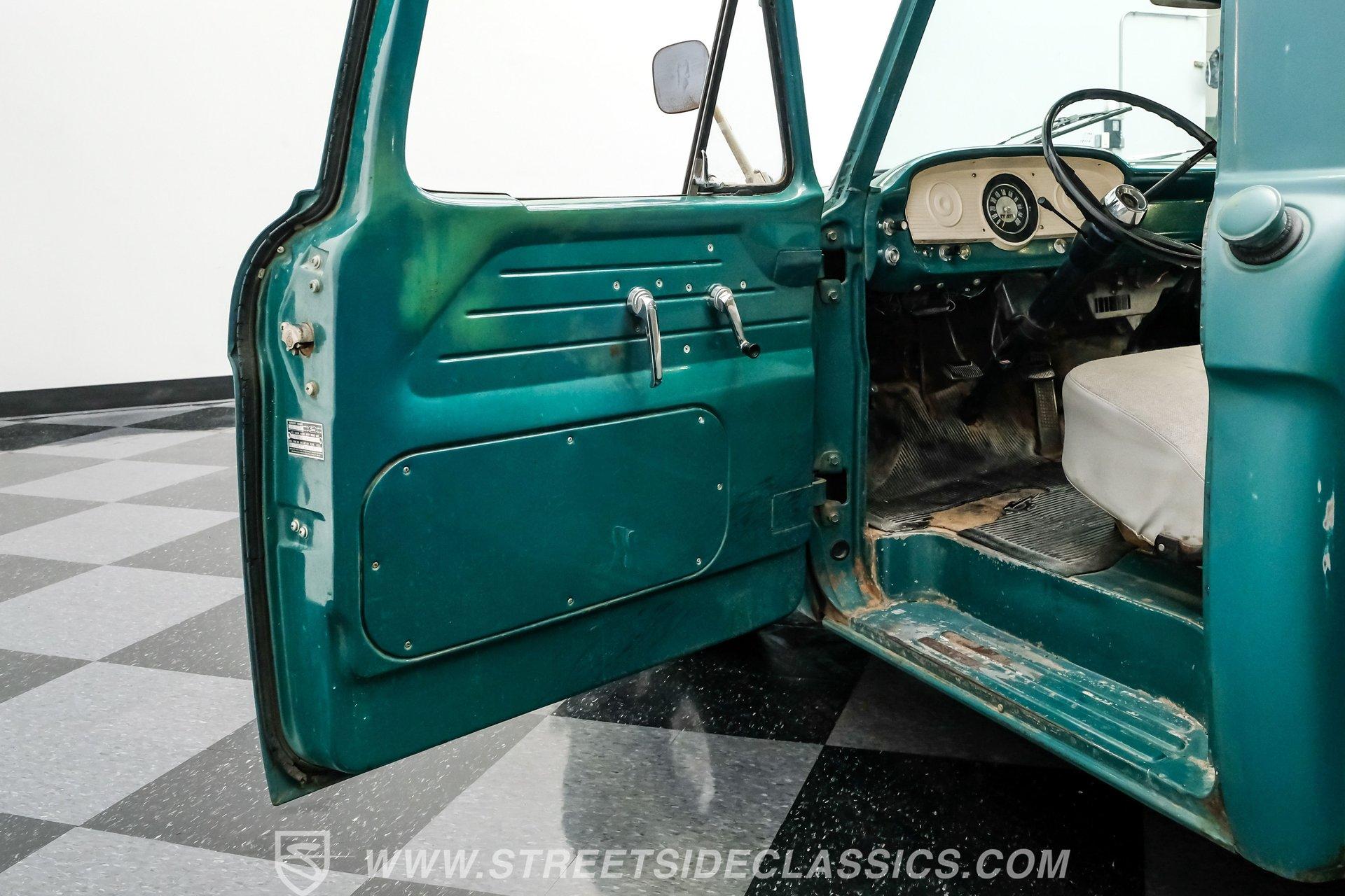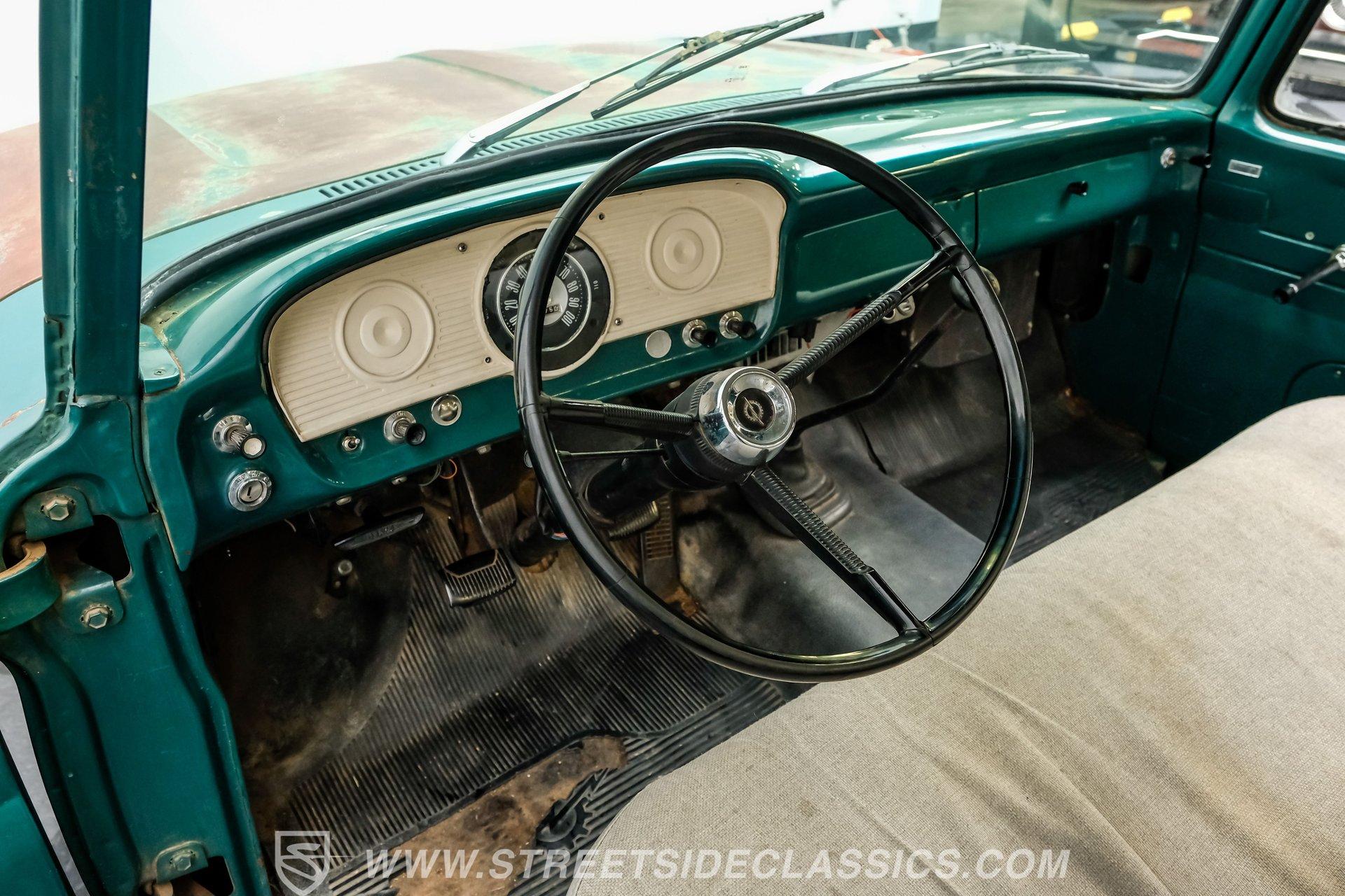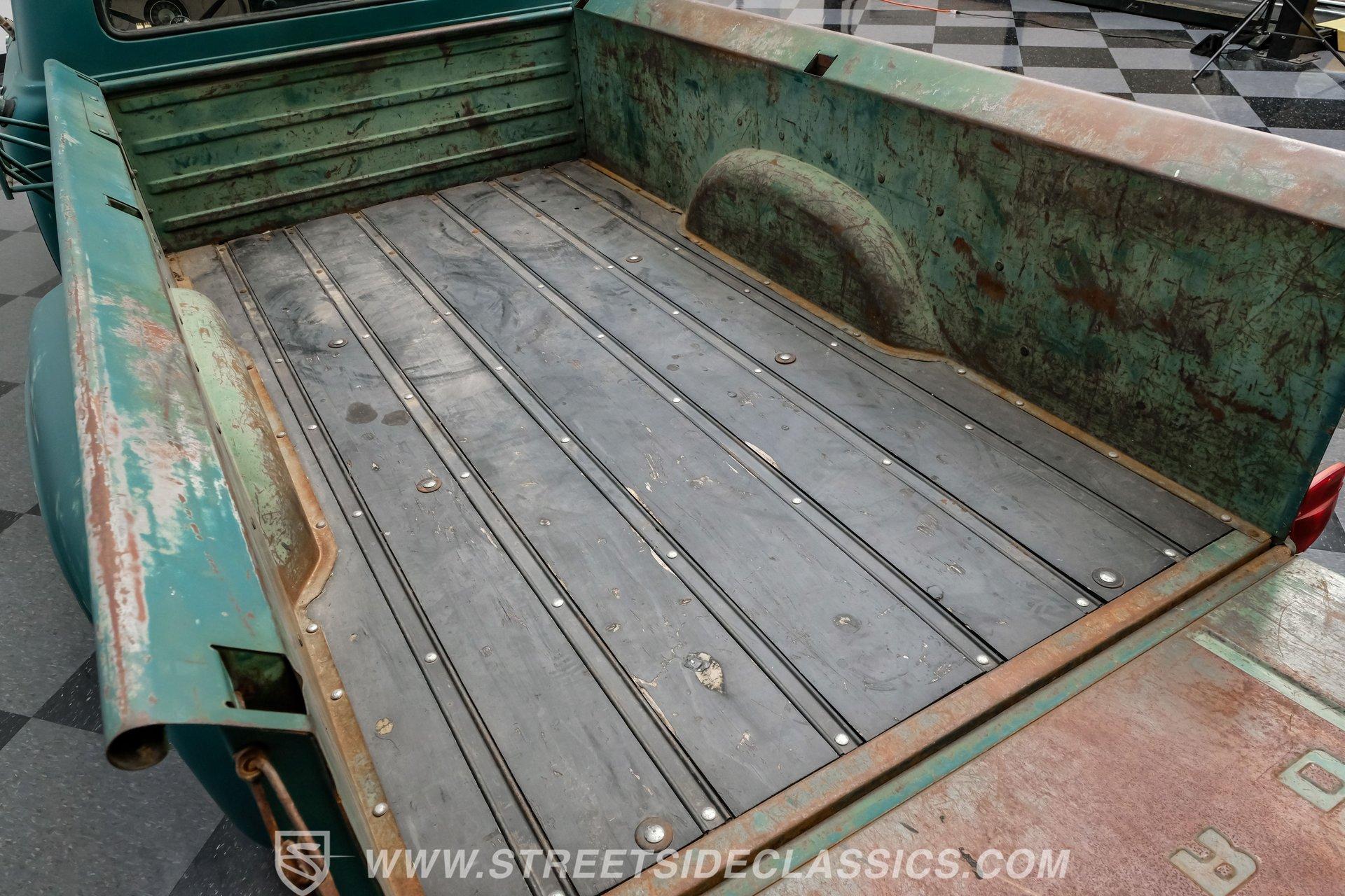 Inside, the interior follows the same theme of solid bones with room for improvement. The painted dashboard still looks clean and doesn't show noticeable scratches. The rubber floor mat is worn and coming apart, but replacing it is a quick and inexpensive fix. The bench seat will need upholstery work, and the headliner appears intact but dirty. A good cleaning alone would go a long way in bringing this cabin back to life. Out back, the wooden bed and surrounding structure appear solid overall, though like the rest of the truck, it could benefit from some attention.