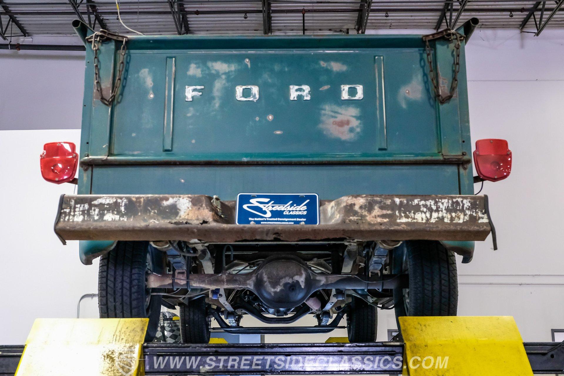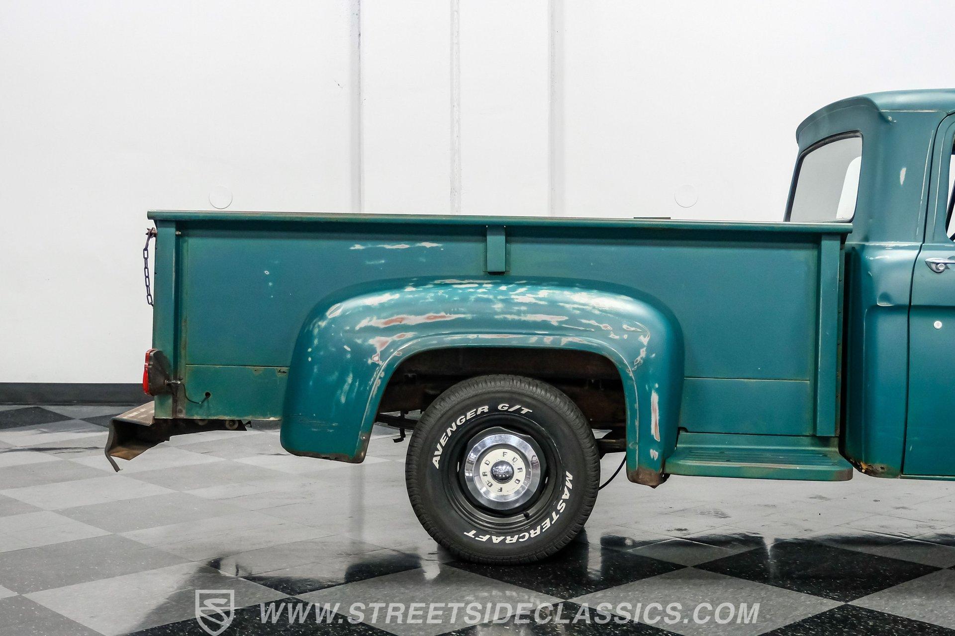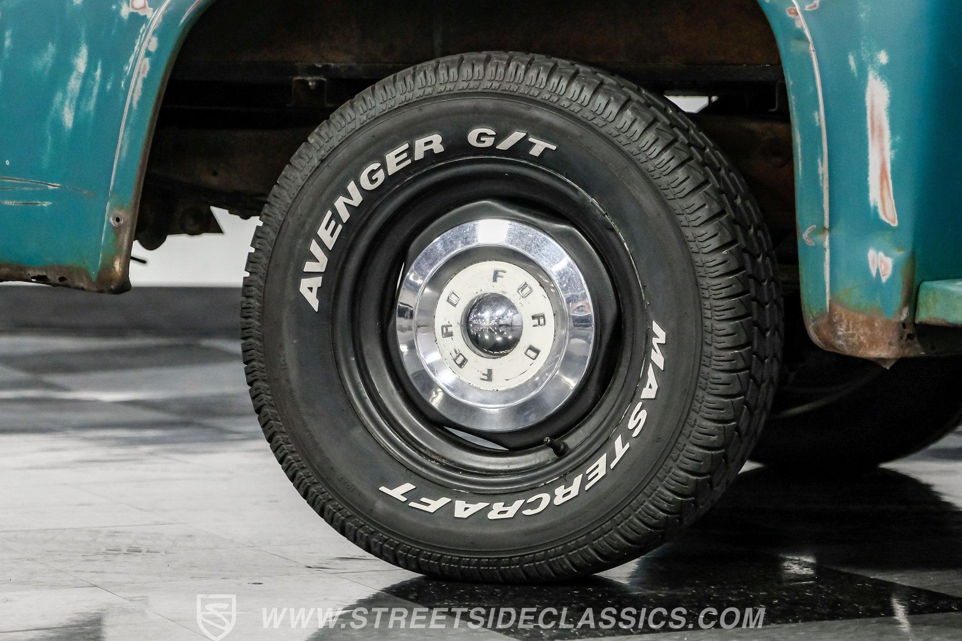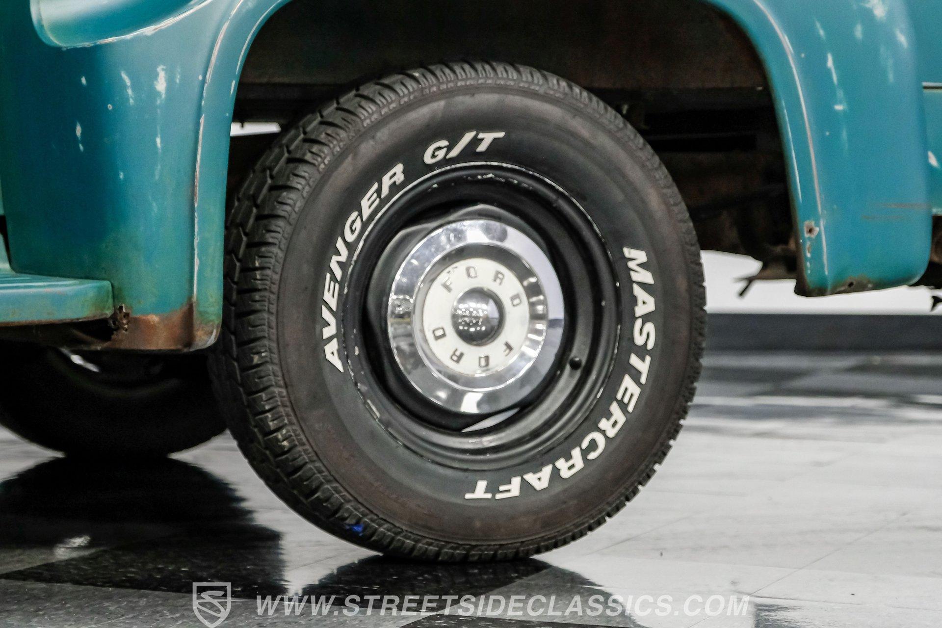 Power comes from a 292 cubic-inch Y-block V8 paired with a 3-speed manual transmission that sends power to a 9-inch rear end with a 3.98 gear ratio. The drivetrain is believed to be original. Factory-style suspension remains in place, front and rear, along with manual drum brakes at all four corners. Stock appearing 15-inch wheels with Ford hub caps wrapped in Mastercraft tires-255/60R15 in the front and 235/70R15 in the rear are fairly new. Exhaust flows through stock-style manifolds into a single system finished with a Glasspack-style muffler.