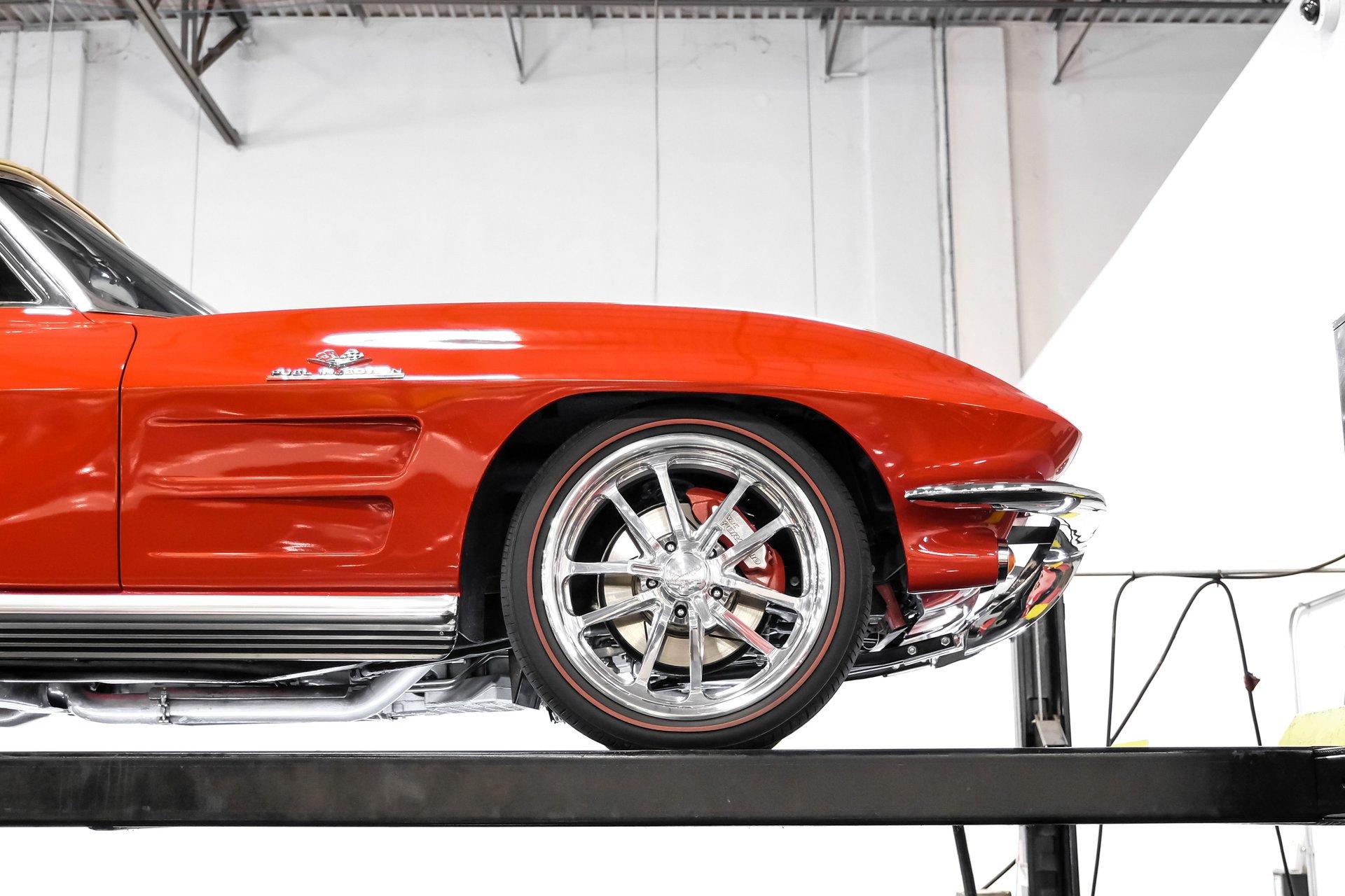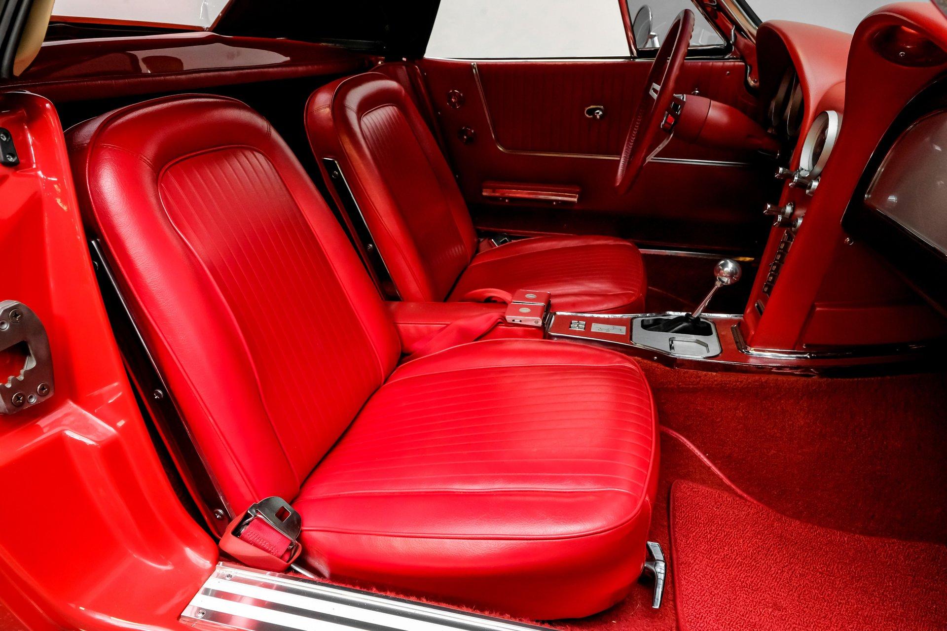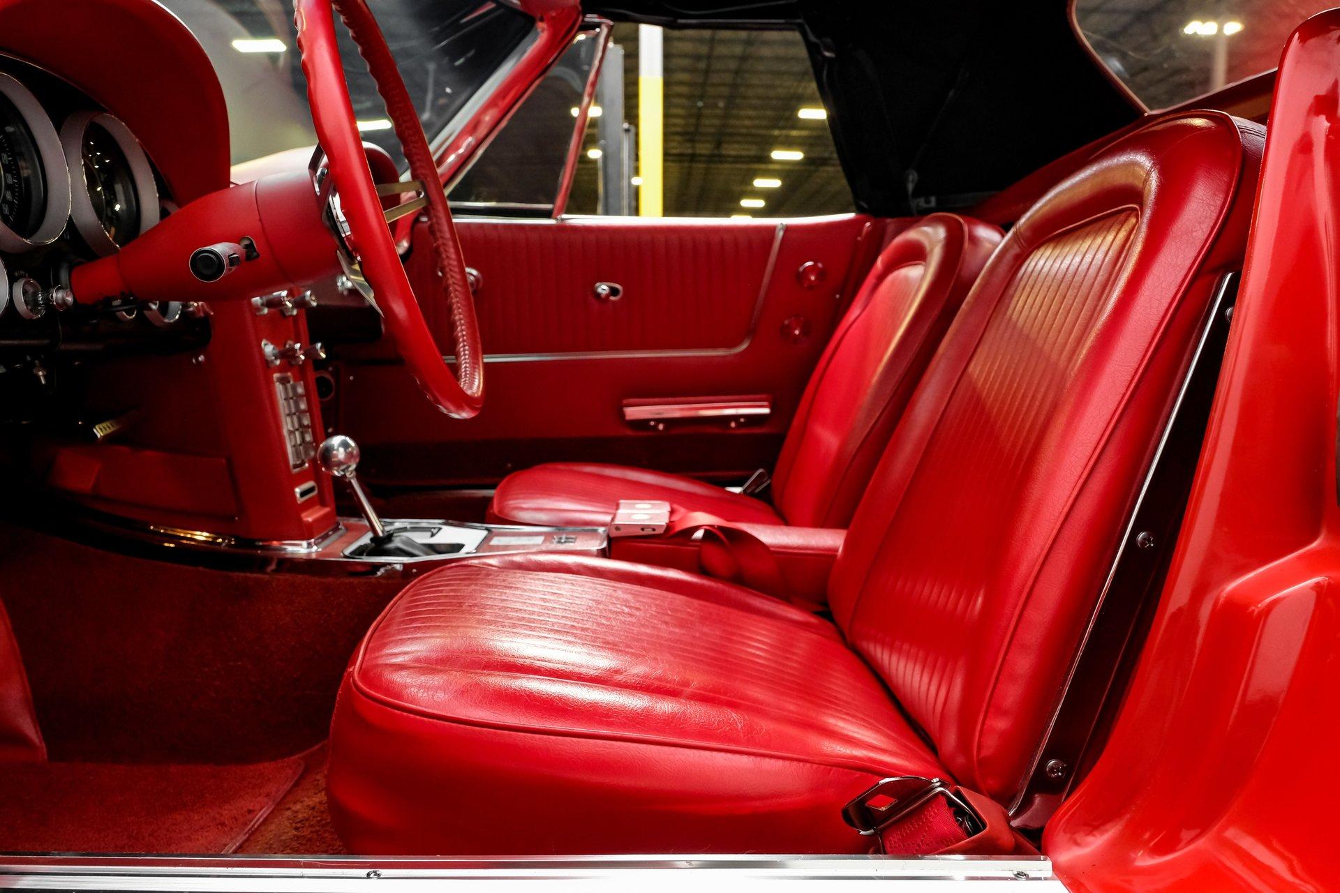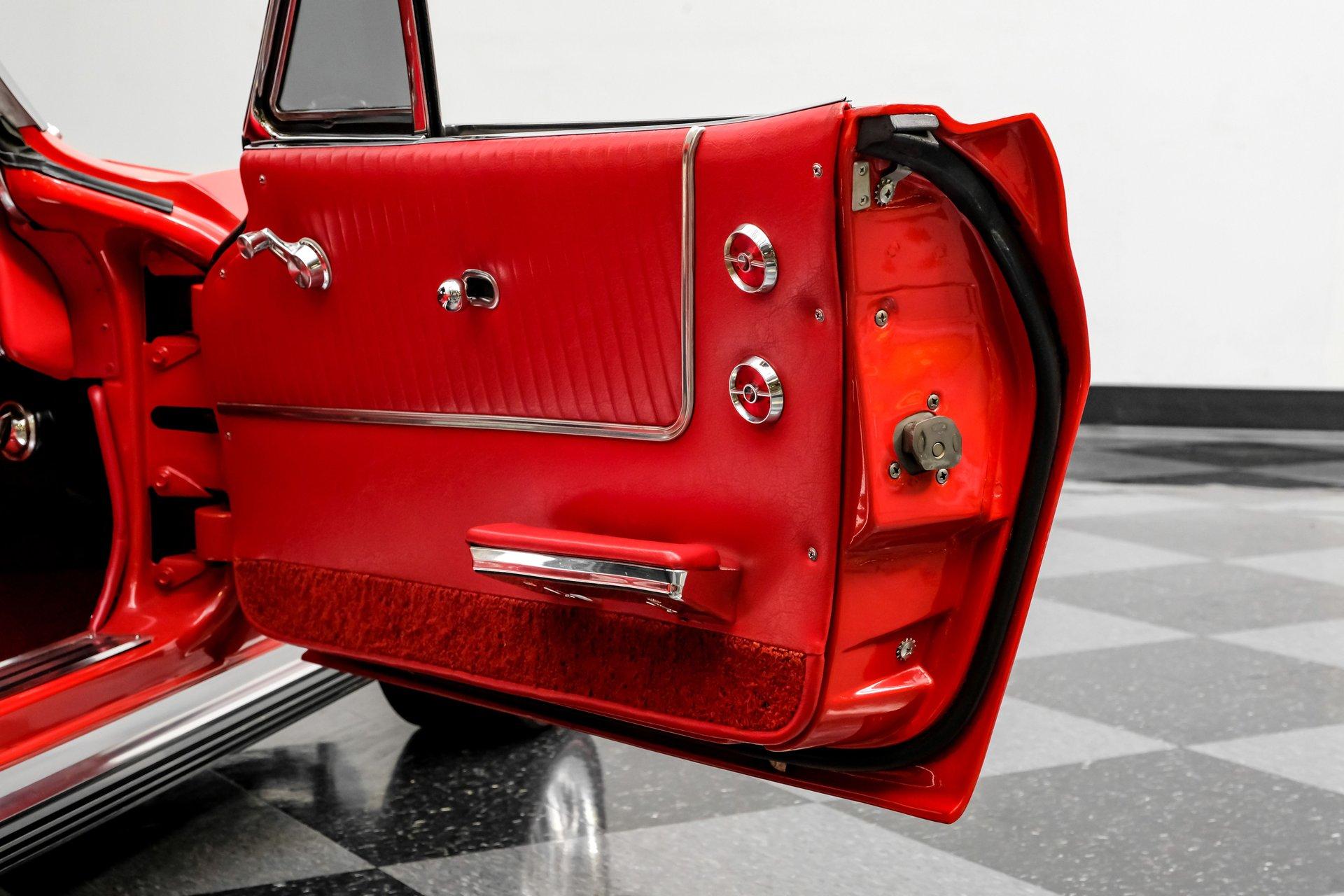 Under that signature front-hinged hood sits a clean engine bay featuring a beautifully packaged 5.7-liter LS1 V-8. Decked out with body-color red valve covers embossed with the Stingray logo, a silver-colored composite intake manifold, performance cam, and shorty headers, this modern small block looks perfectly at home in this C2. That power is routed through a 4L60E four-speed automatic transmission equipped with a 2,800-rpm stall converter before reaching the rear wheels, which are ready to test your self-control at every traffic light.