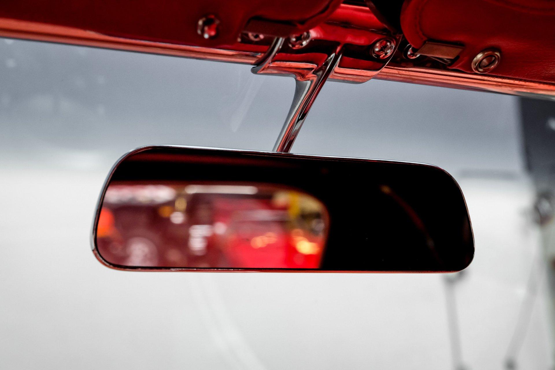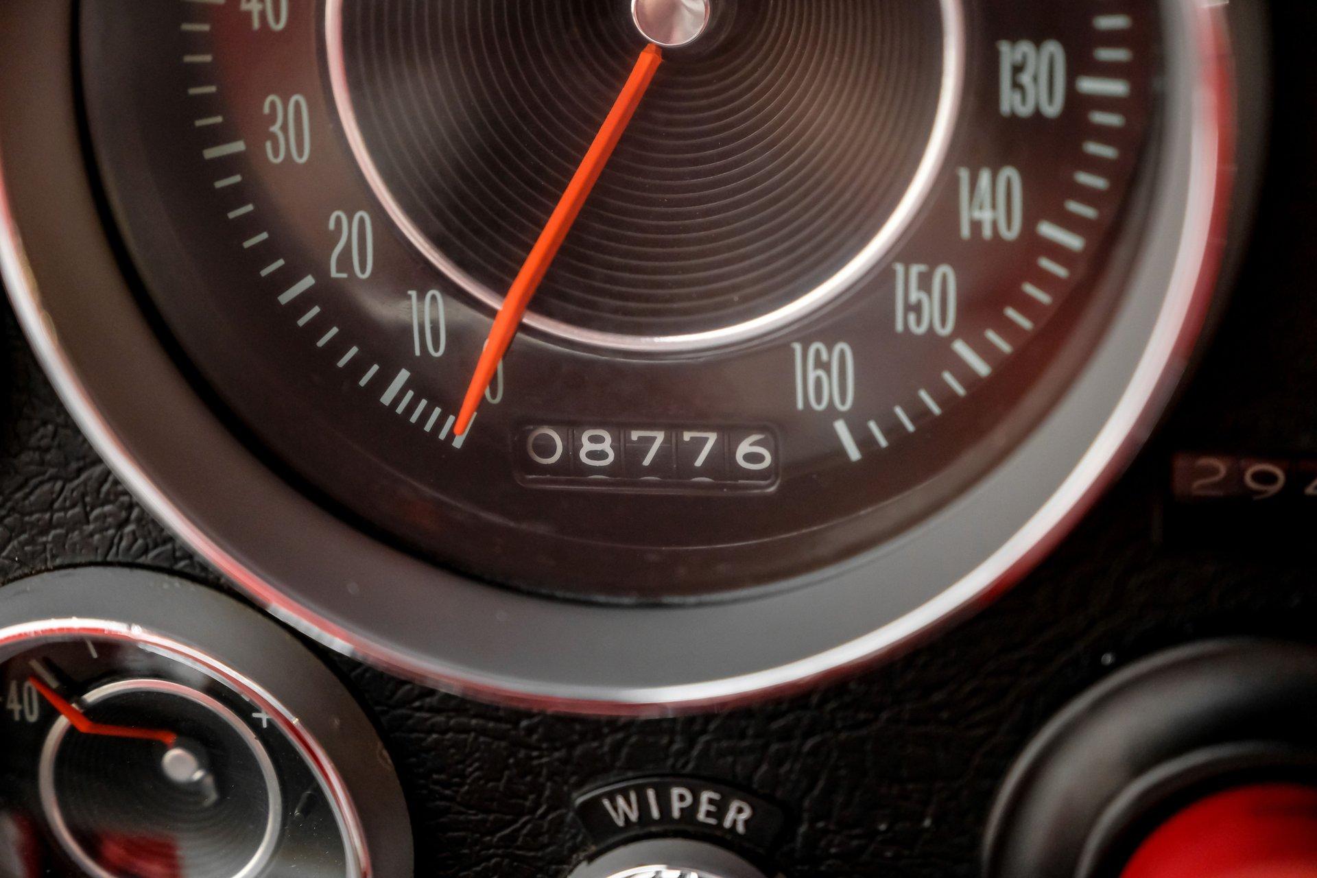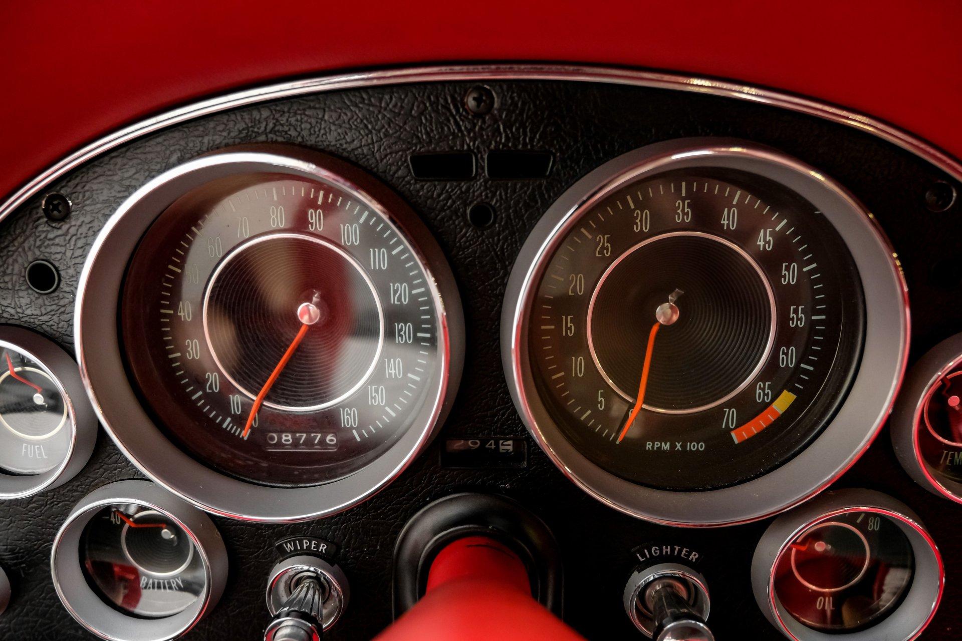 Inside, we find an all-new interior by Al Knoch. A center console separates the factory-correct red vinyl bucket seats and matching door panels. An aftermarket three-spoke, power rack and pinion-assisted steering wheel featuring the iconic Crossed Flags logo sits just ahead of a six-pod gauge cluster, highlighted by a 7,000 rpm tachometer and a 160 mph speedometer. Power windows and a Vintage Air HVAC setup offer air conditioning, while a large analog clock sits atop the center stack. An original-style AM/FM head unit sports new internals mounted vertically, powering an amp and upgraded speakers housed in a custom speaker box fitted to the factory battery tray behind the seats.