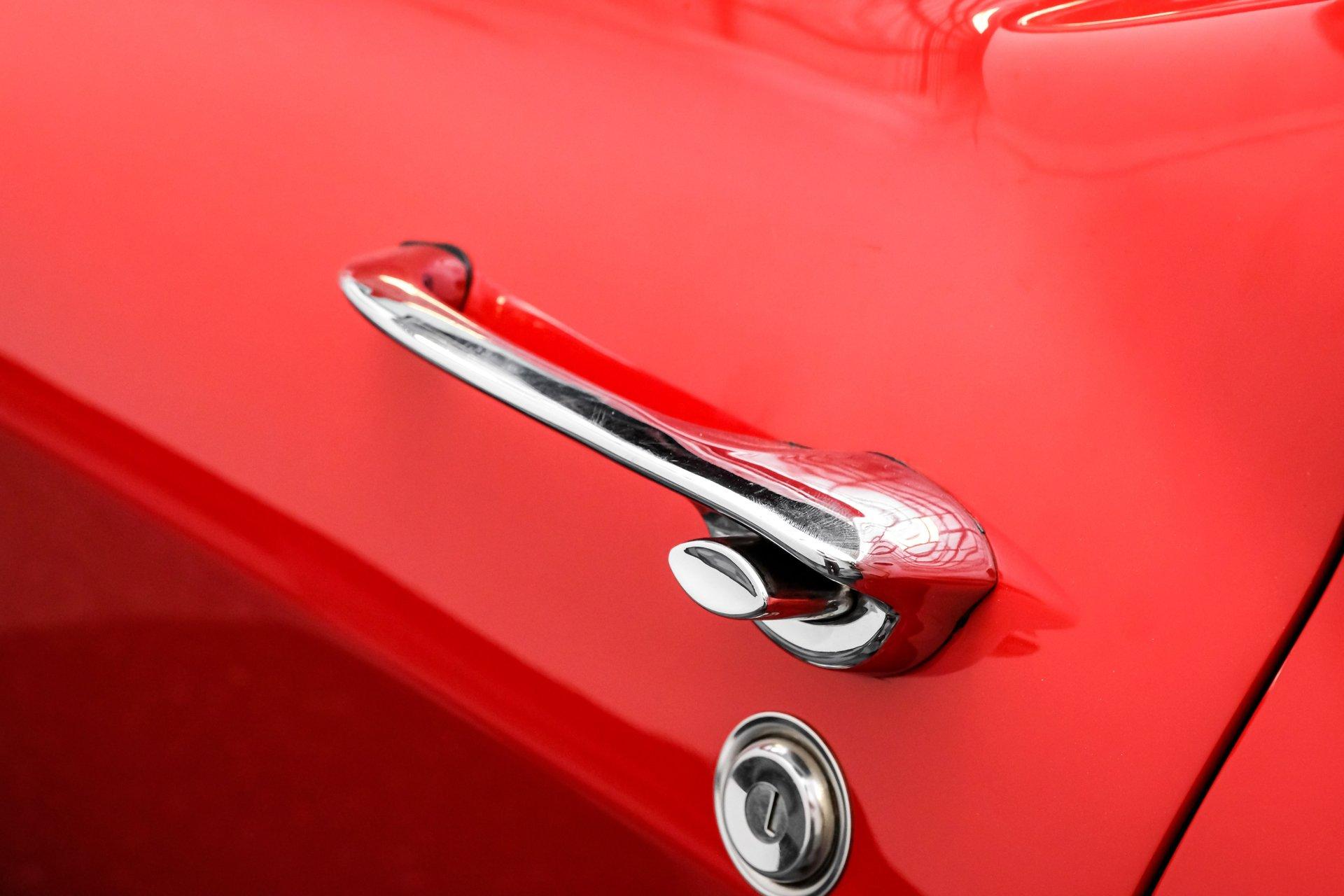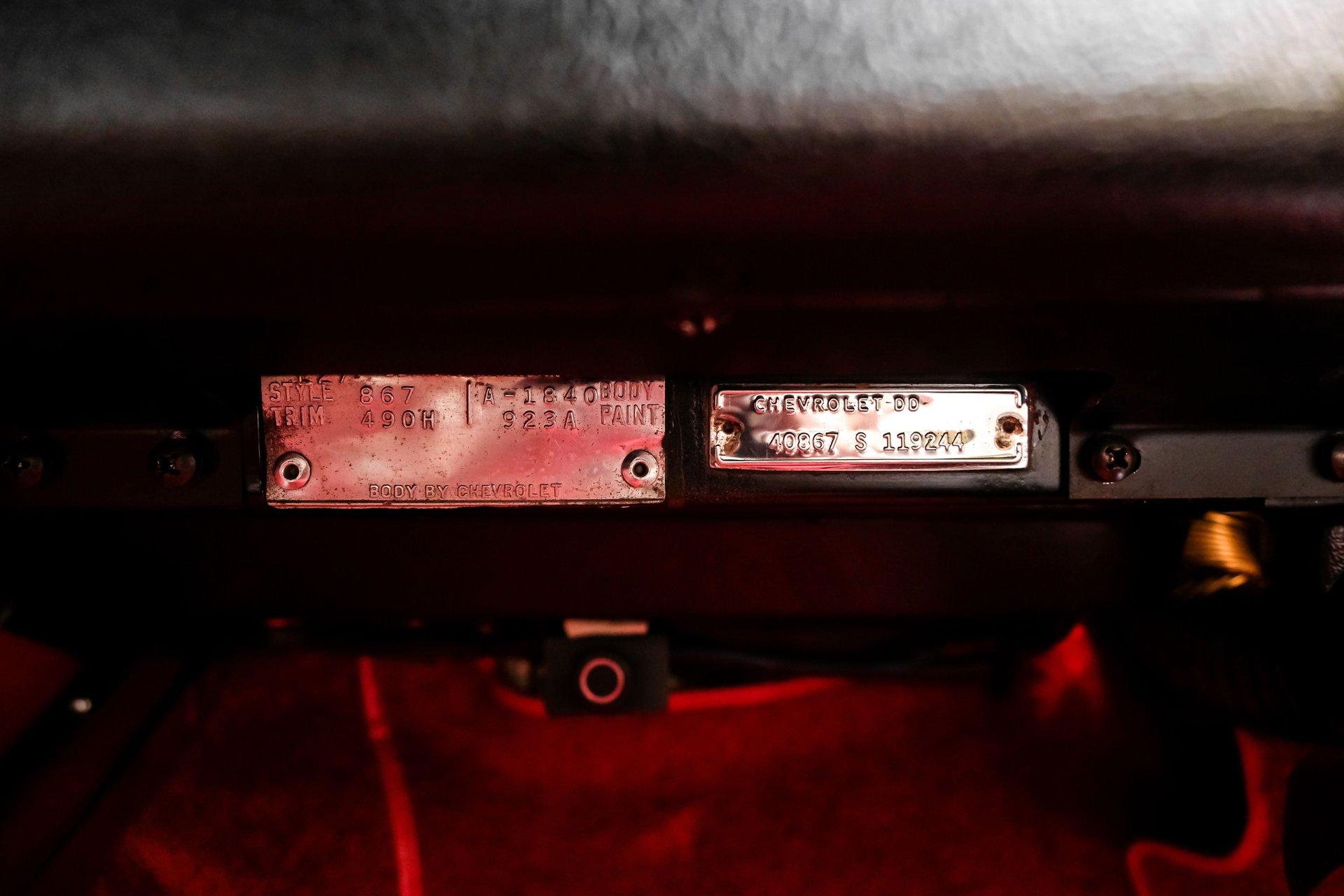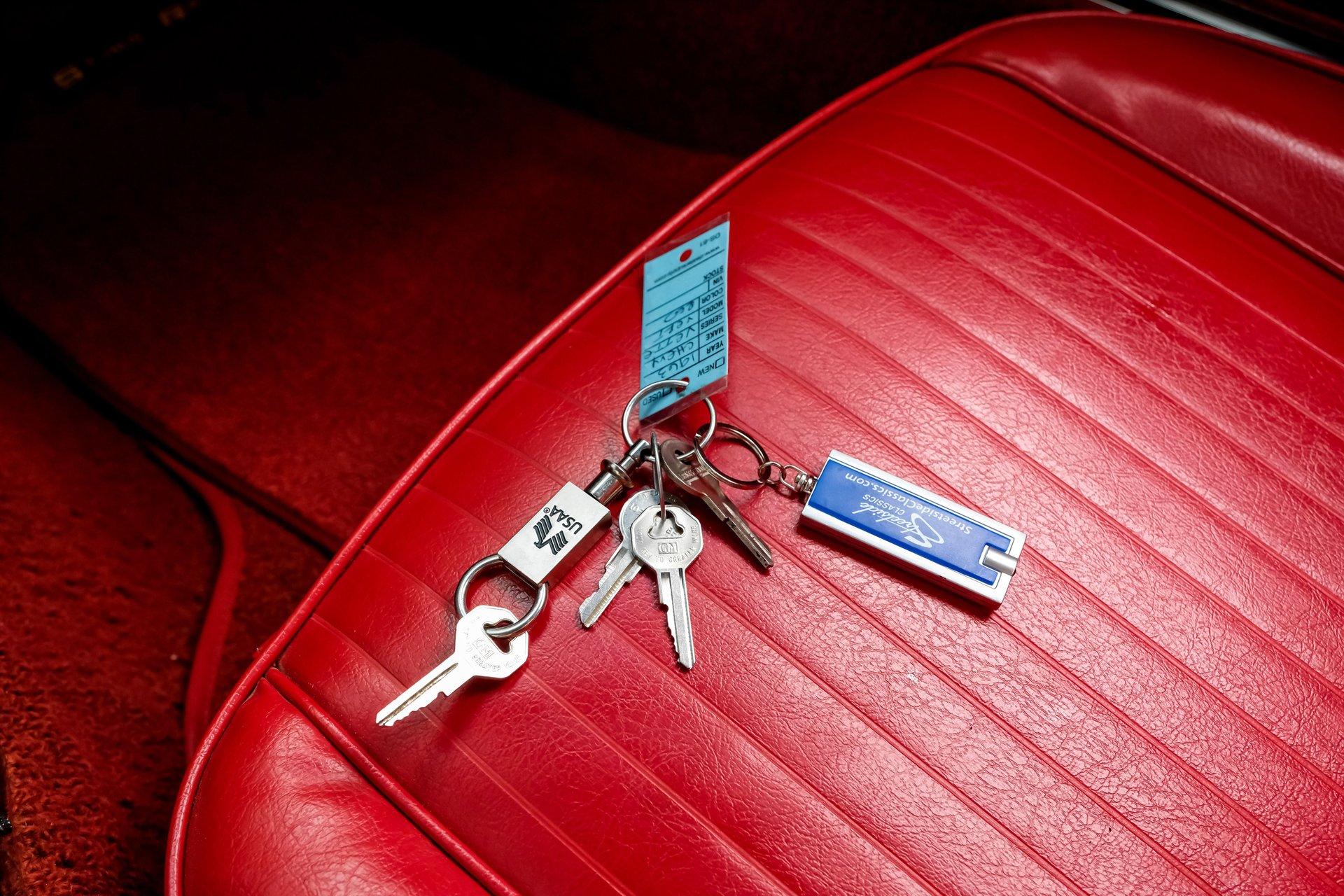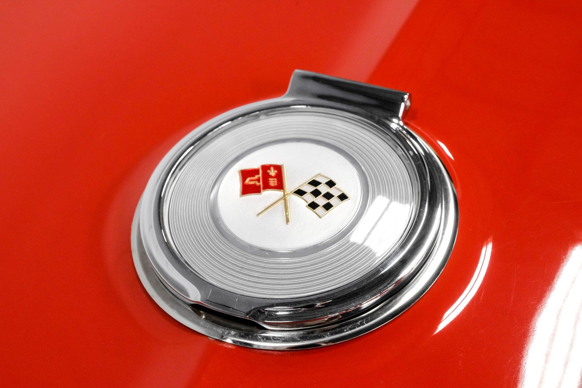 Inside, we find an all-new interior by Al Knoch. A center console separates the factory-correct red vinyl bucket seats and matching door panels. An aftermarket three-spoke, power rack and pinion-assisted steering wheel featuring the iconic Crossed Flags logo sits just ahead of a six-pod gauge cluster, highlighted by a 7,000 rpm tachometer and a 160 mph speedometer. Power windows and a Vintage Air HVAC setup offer air conditioning, while a large analog clock sits atop the center stack. An original-style AM/FM head unit sports new internals mounted vertically, powering an amp and upgraded speakers housed in a custom speaker box fitted to the factory battery tray behind the seats.