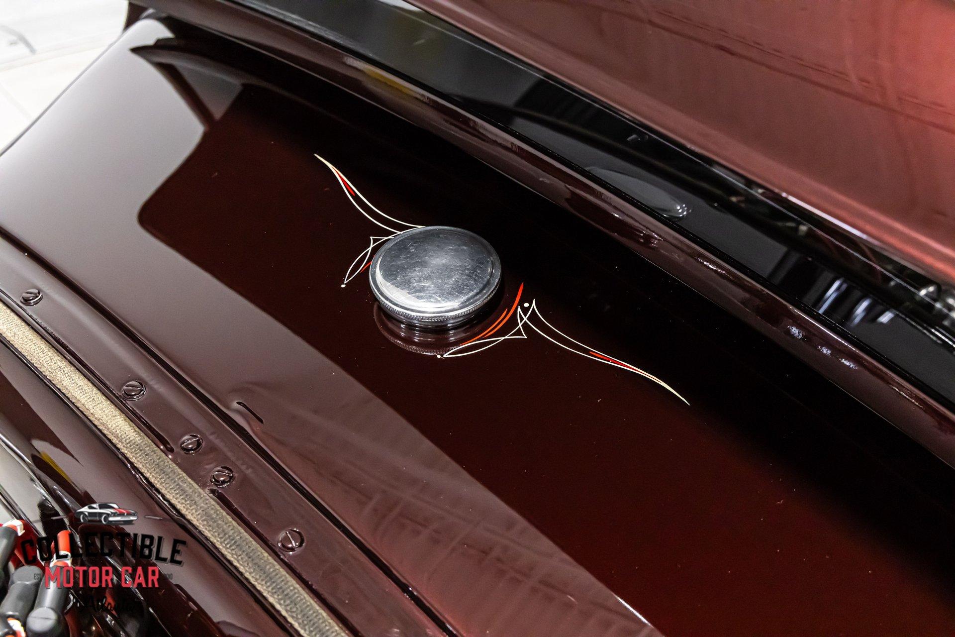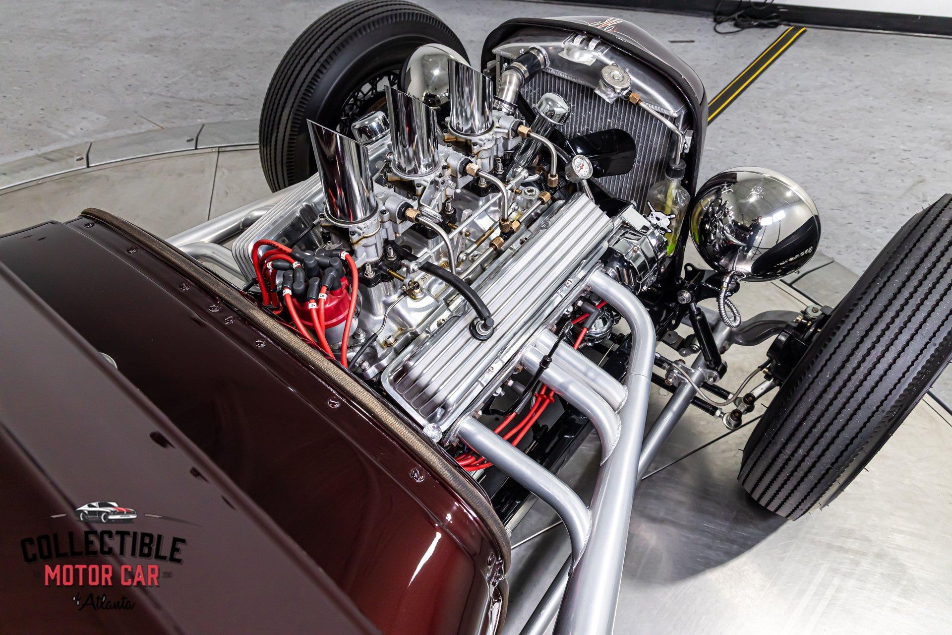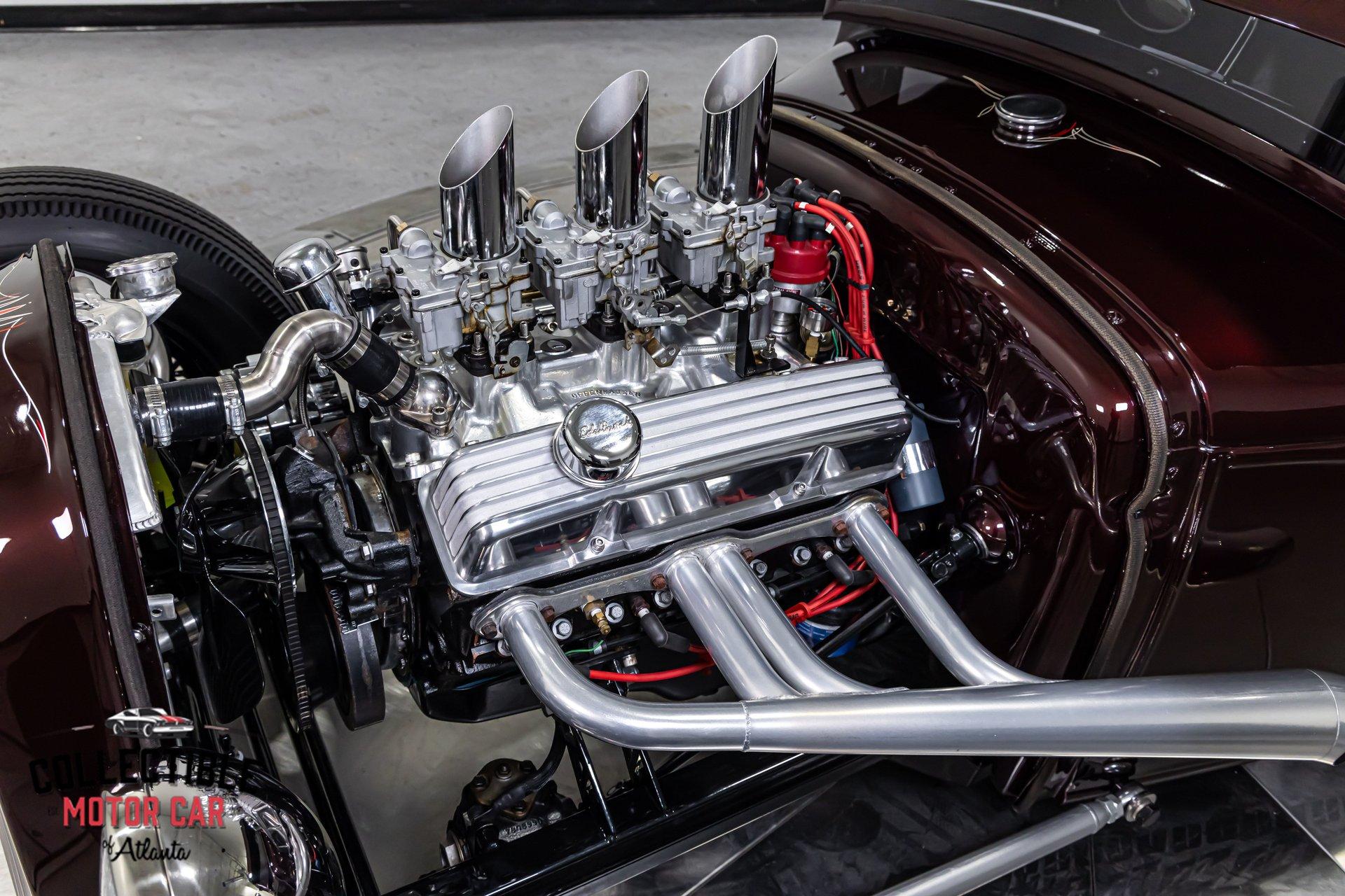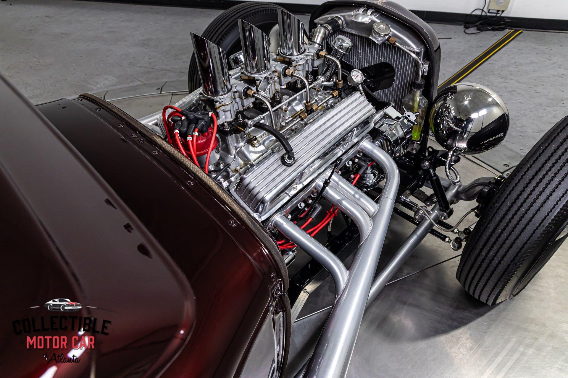 This Model A has the look every hot rod guy wants. The body is finished in a rich Black Cherry that shows beautifully under the lights and is accented with tasteful traditional-style pinstriping on the grille shell, cowl, and rear body. The combination of deep paint, blacked-out chassis components, and polished engine hardware gives the car a sinister but classy appearance. From every angle, it looks like a properly built traditional rod.