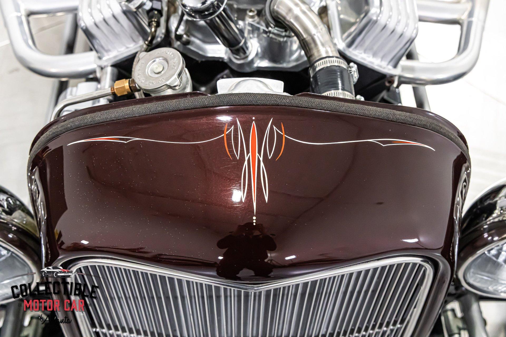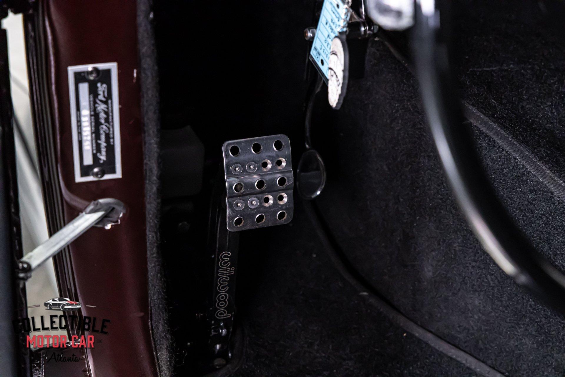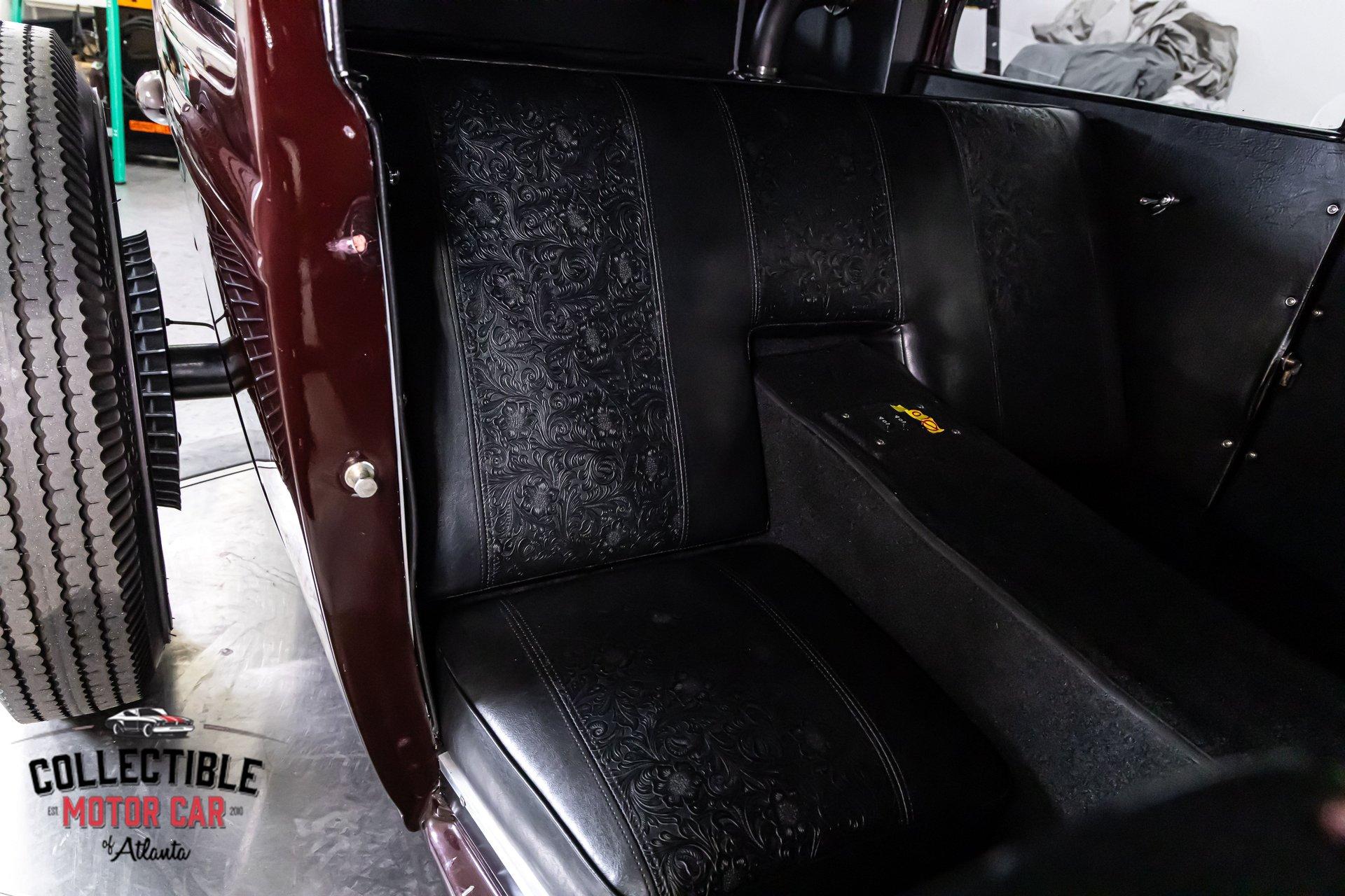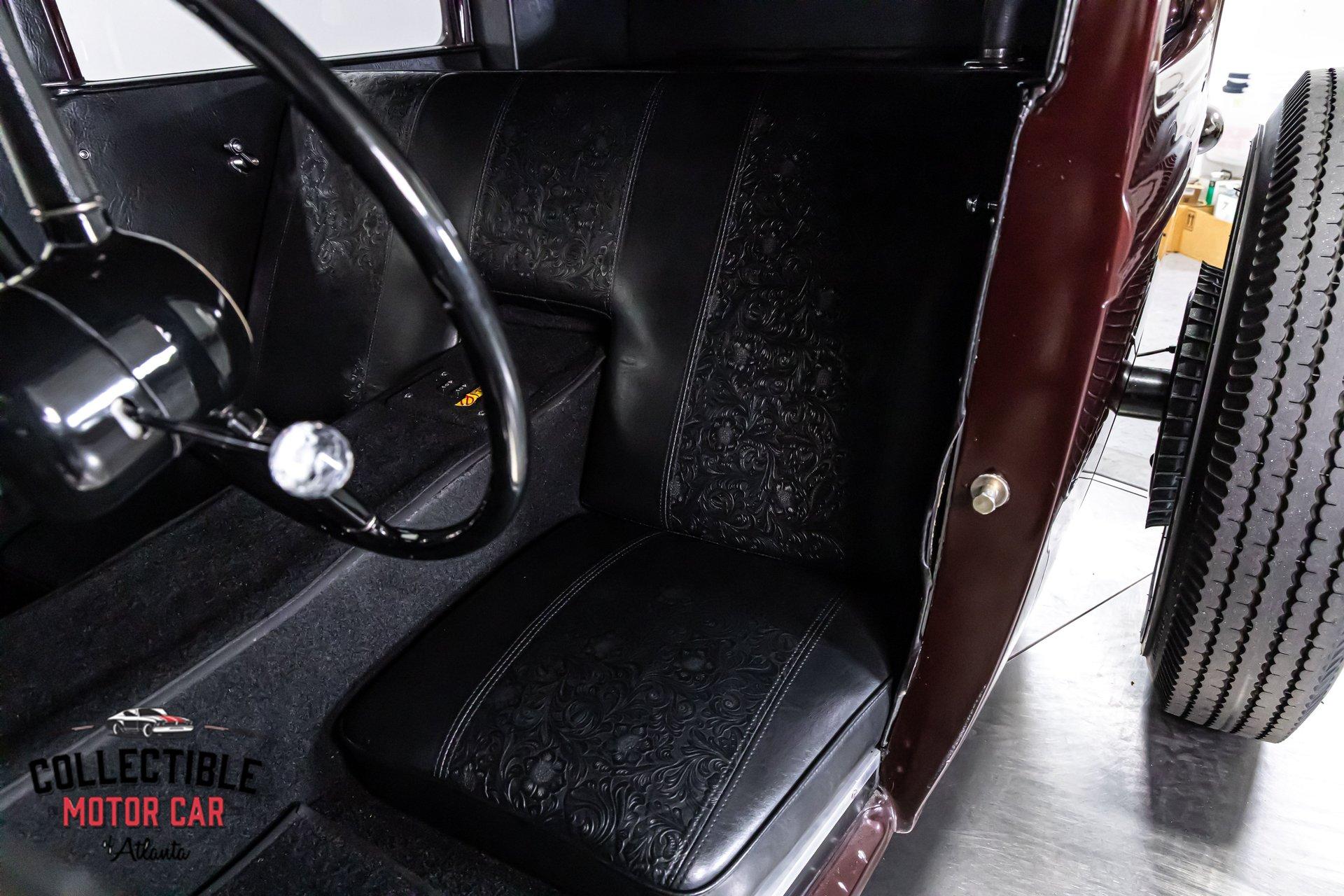 This Model A has the look every hot rod guy wants. The body is finished in a rich Black Cherry that shows beautifully under the lights and is accented with tasteful traditional-style pinstriping on the grille shell, cowl, and rear body. The combination of deep paint, blacked-out chassis components, and polished engine hardware gives the car a sinister but classy appearance. From every angle, it looks like a properly built traditional rod.
