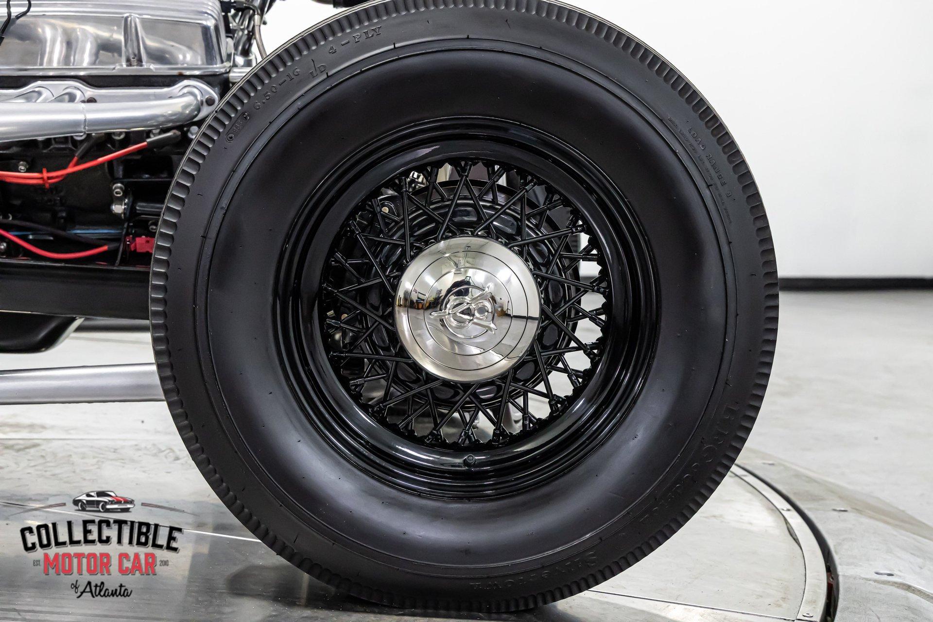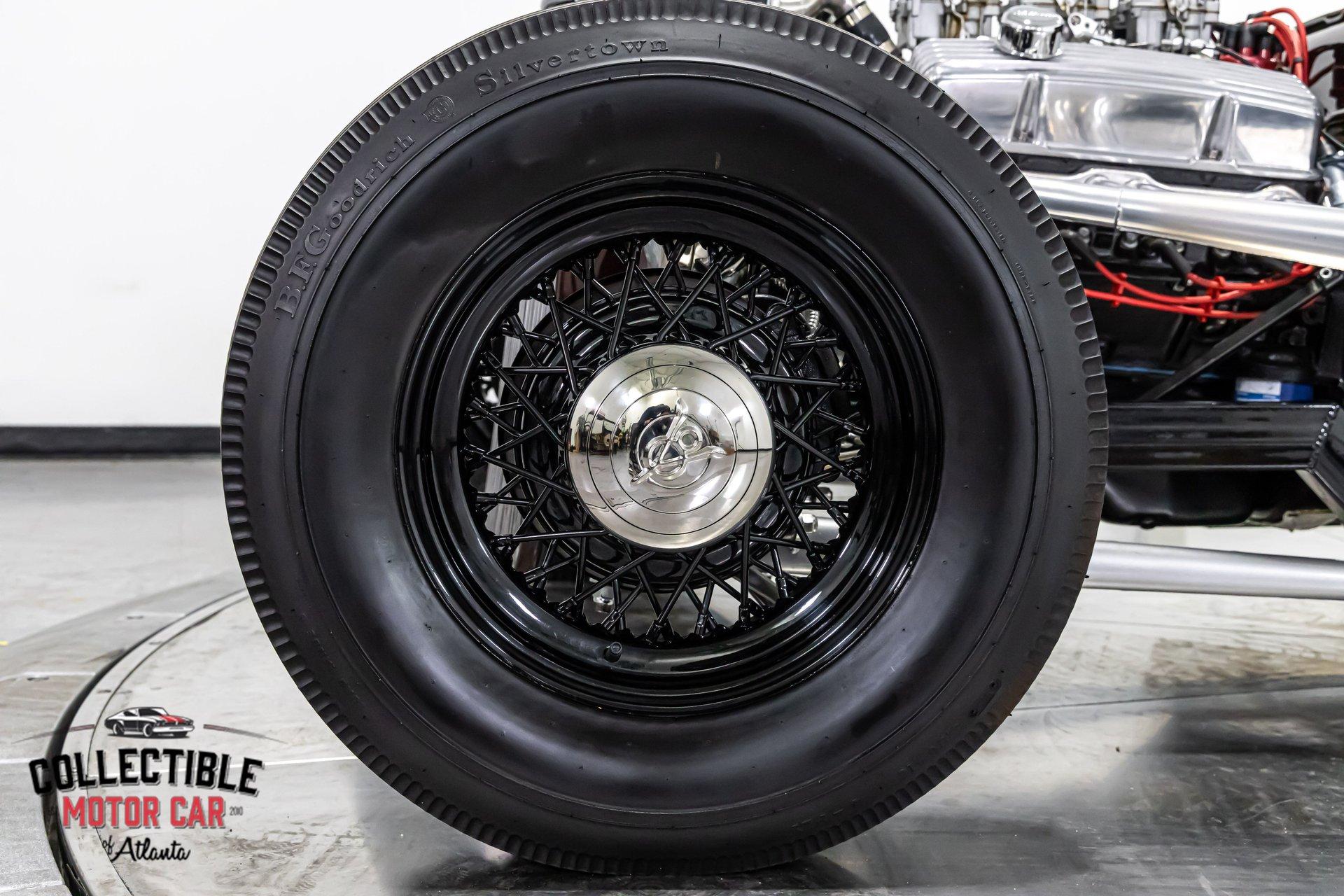 This Ford sits on black wire wheels with polished center caps and vintage-style tires that fit the theme perfectly. The exposed front suspension, long nose, and low roofline give it an unmistakable traditional hot rod look.