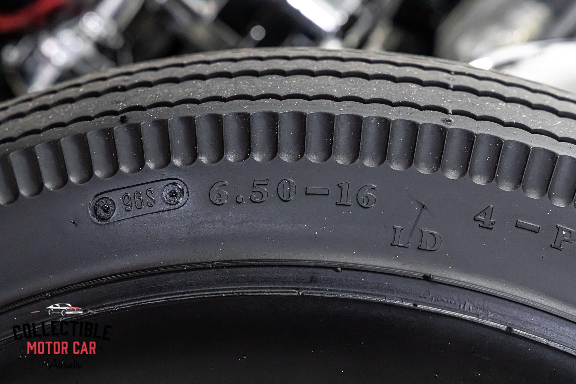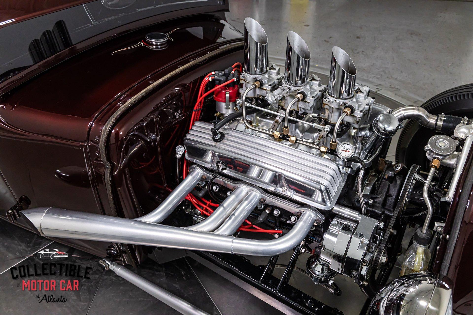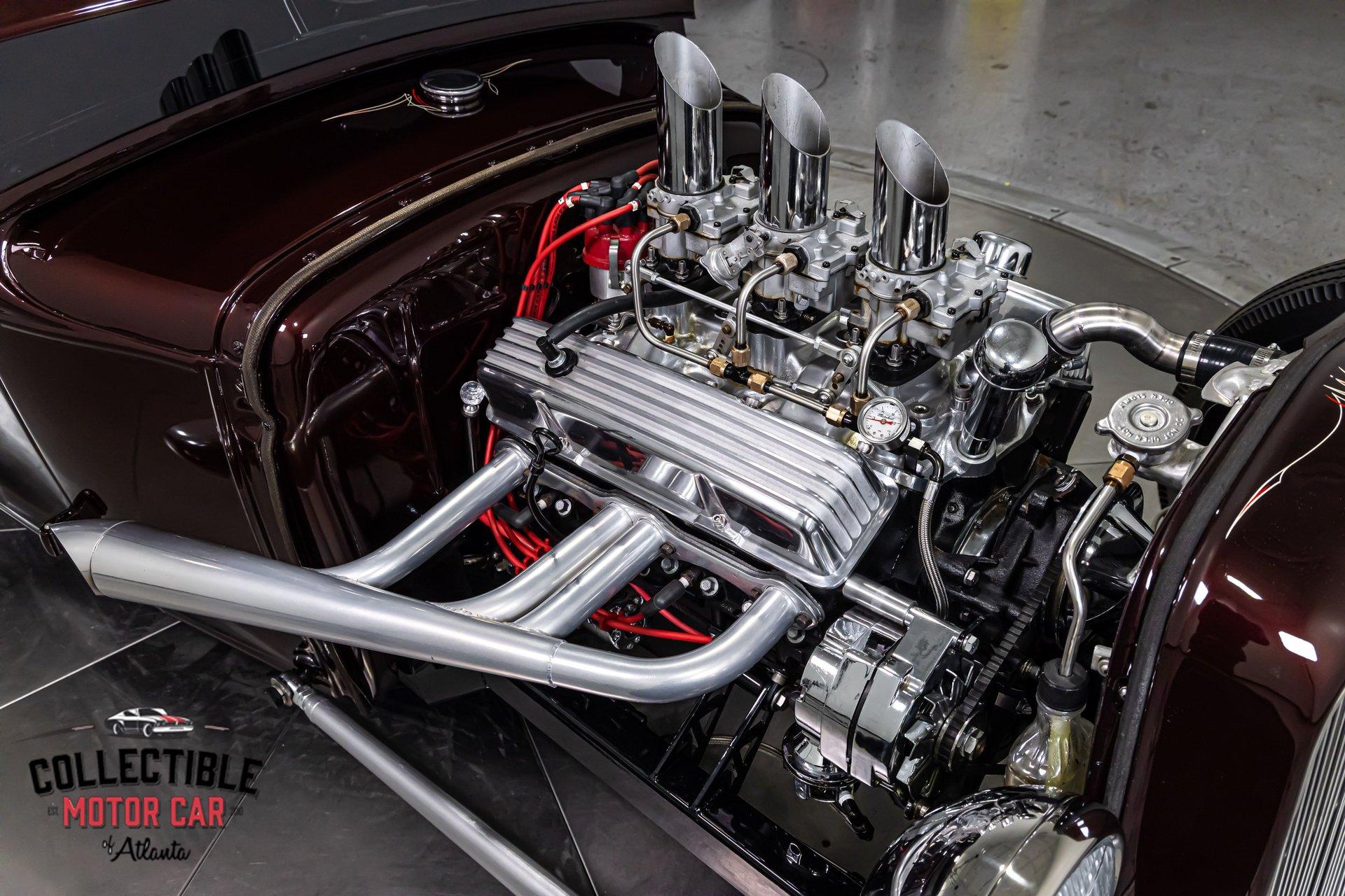 The engine presentation is one of the best features of the car. Sitting proudly out in the open, the small-block is topped with triple carburetors and velocity stacks, along with finned valve covers, polished intake hardware, and custom headers. The side-exit exhaust gives the car even more attitude and completes the traditional hot rod look.