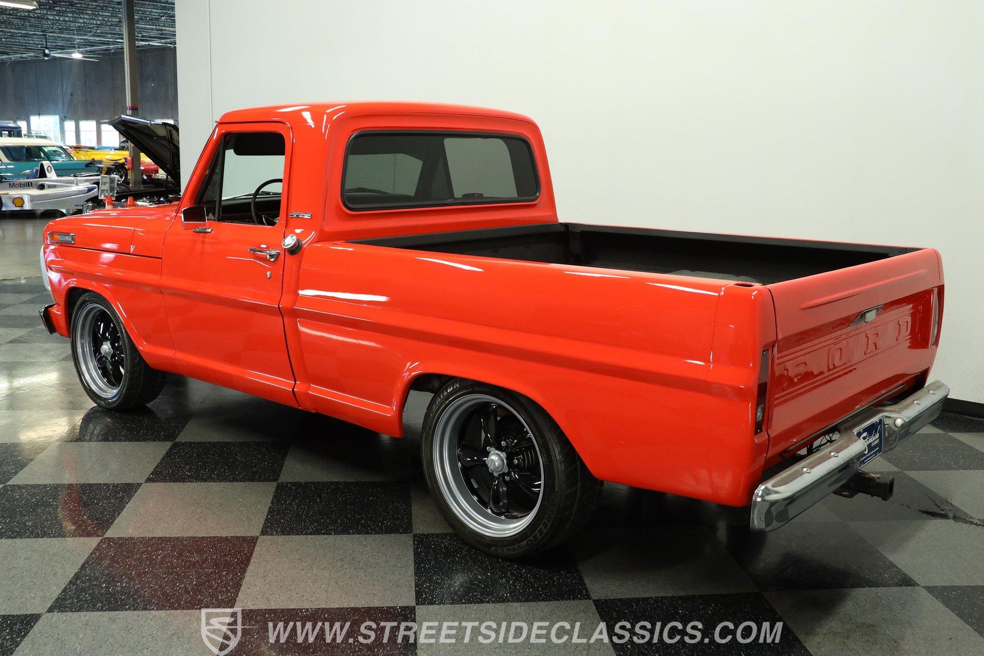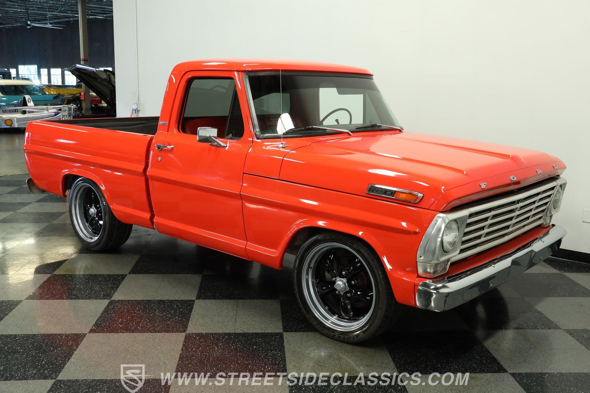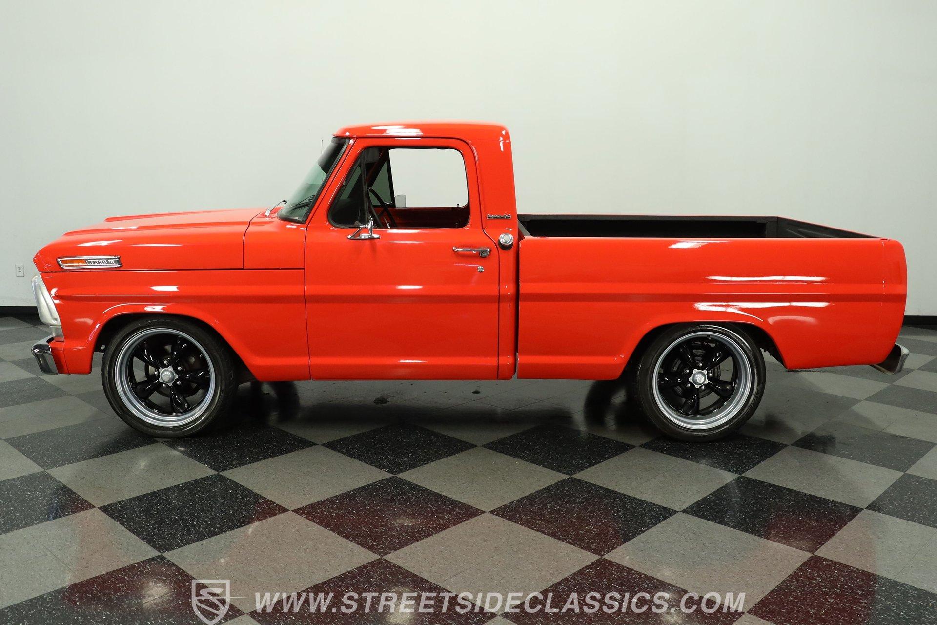 Decked out in sweet orange paint and looking well put together from all angles, this 1968 Ford F-100 is a great take on its manufacturer's pivotal classic pickup. Its shortbed configuration gives it a robust, capable appearance and it rolls on a set of sharp 20'' American racing wheels that add just the right amount of aftermarket flair. Take a lap around this vintage Ford, and you'll likely be impressed by the condition of its chrome bumpers and trim and how its doors, hood and tailgate shut. A close inspection will reveal fresh, pliable weatherstripping that's still up to the challenge of keeping the elements from intruding, and clear glass surrounds the cabin.