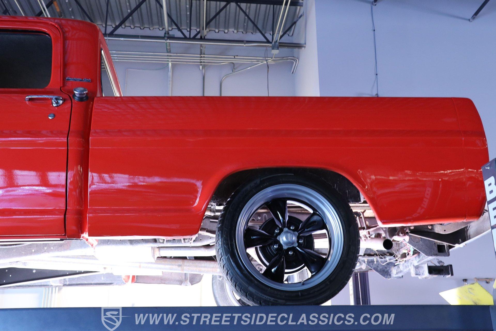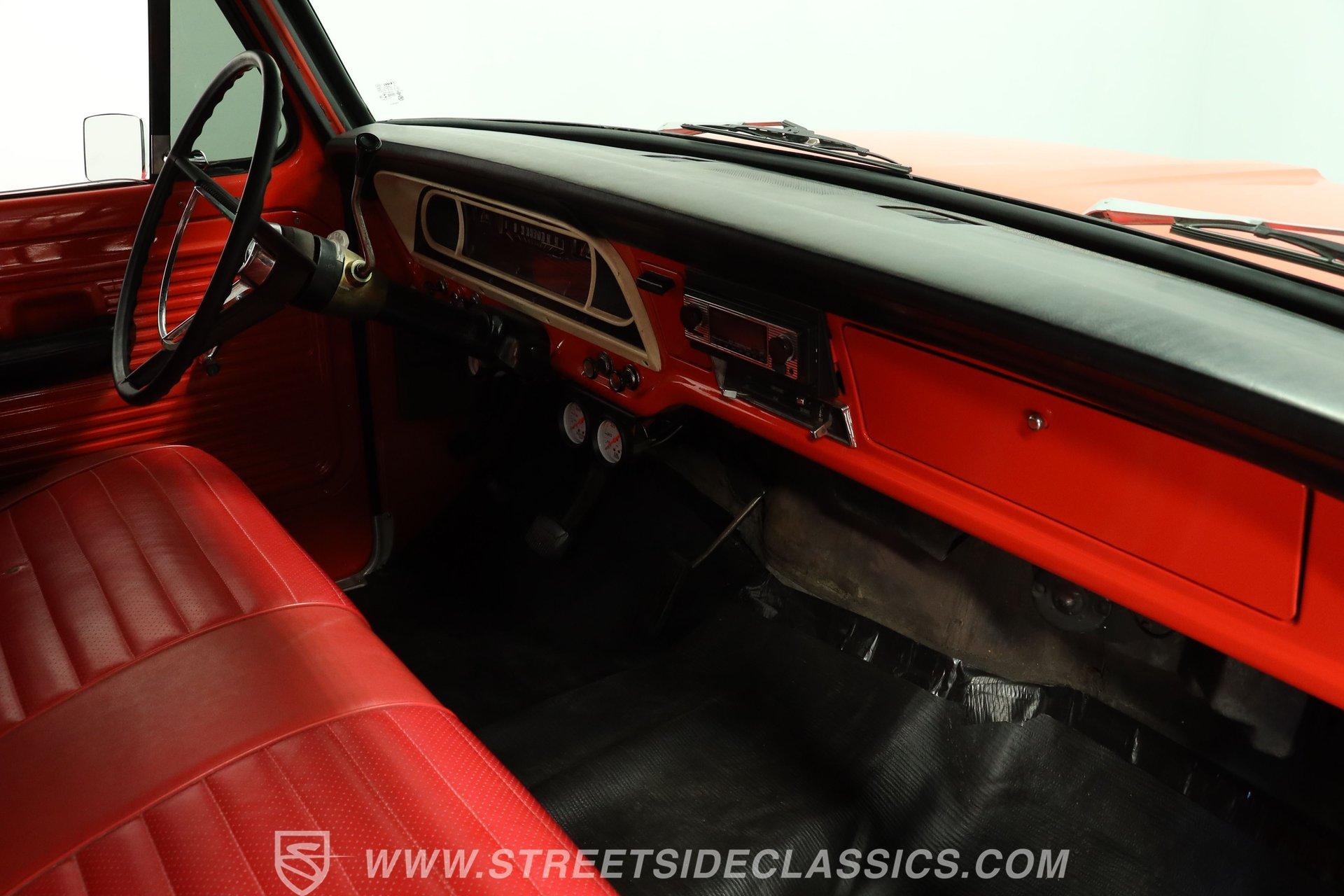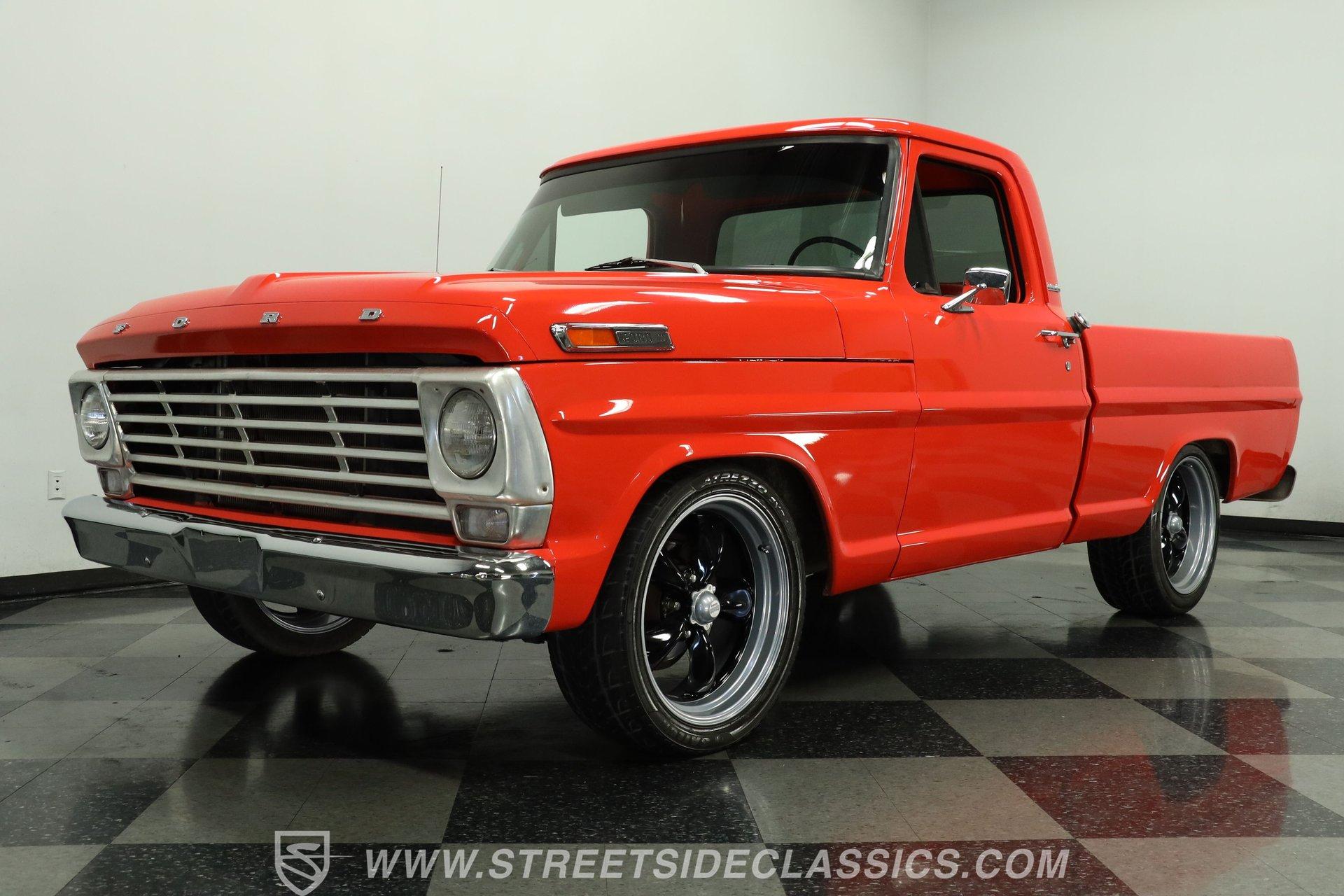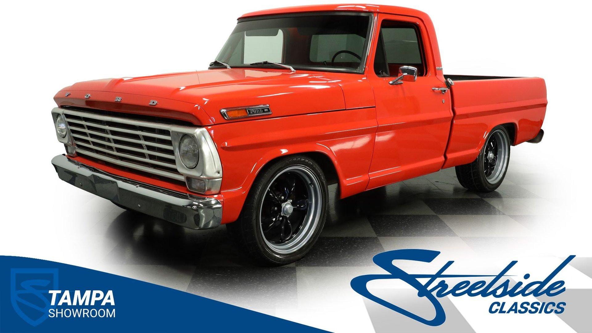 Decked out in sweet orange paint and looking well put together from all angles, this 1968 Ford F-100 is a great take on its manufacturer's pivotal classic pickup. Its shortbed configuration gives it a robust, capable appearance and it rolls on a set of sharp 20'' American racing wheels that add just the right amount of aftermarket flair. Take a lap around this vintage Ford, and you'll likely be impressed by the condition of its chrome bumpers and trim and how its doors, hood and tailgate shut. A close inspection will reveal fresh, pliable weatherstripping that's still up to the challenge of keeping the elements from intruding, and clear glass surrounds the cabin.