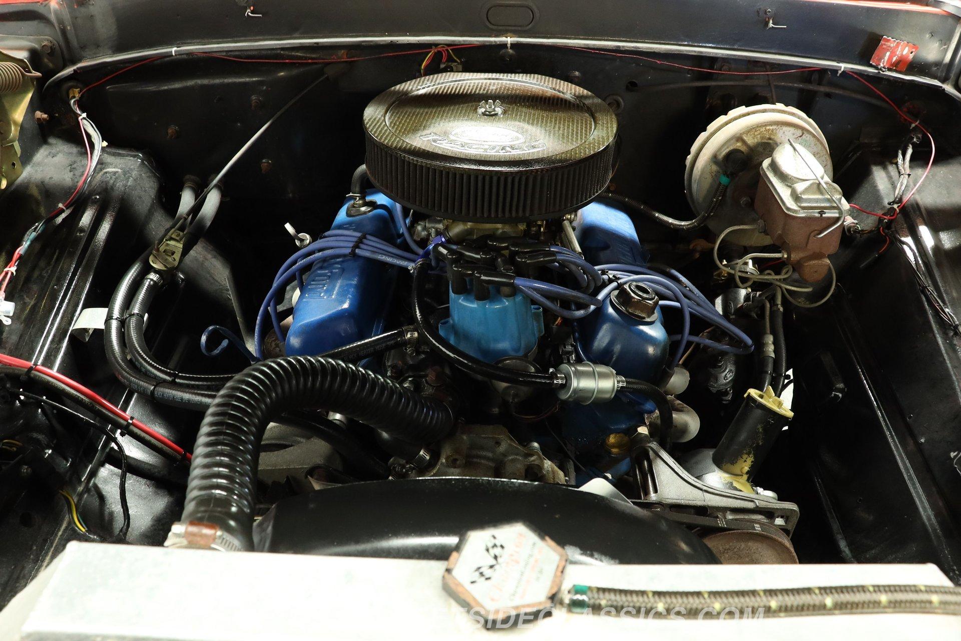 Beneath the hood, the engine bay is in clean shape, with a 302-cubic-inch Windsor V8 at its center. It's a member of a class of small blocks that have a great reputation for dependability and, true to form, this one, fed by a two-barrel Holley carburetor, is running strong, firing up on command and pulling with plenty of enthusiasm as it pairs with a 3-speed automatic C4 transmission that shifts smoothly. The surrounding inner fenders, firewall and radiator support look reassuringly solid for plenty more years of service, and the addition of an upgraded aluminum radiator helps keep operating temperatures under control. Power steering makes for easy maneuvering, while power brakes that position discs up front bring this classic ride to dependable, low effort stops.