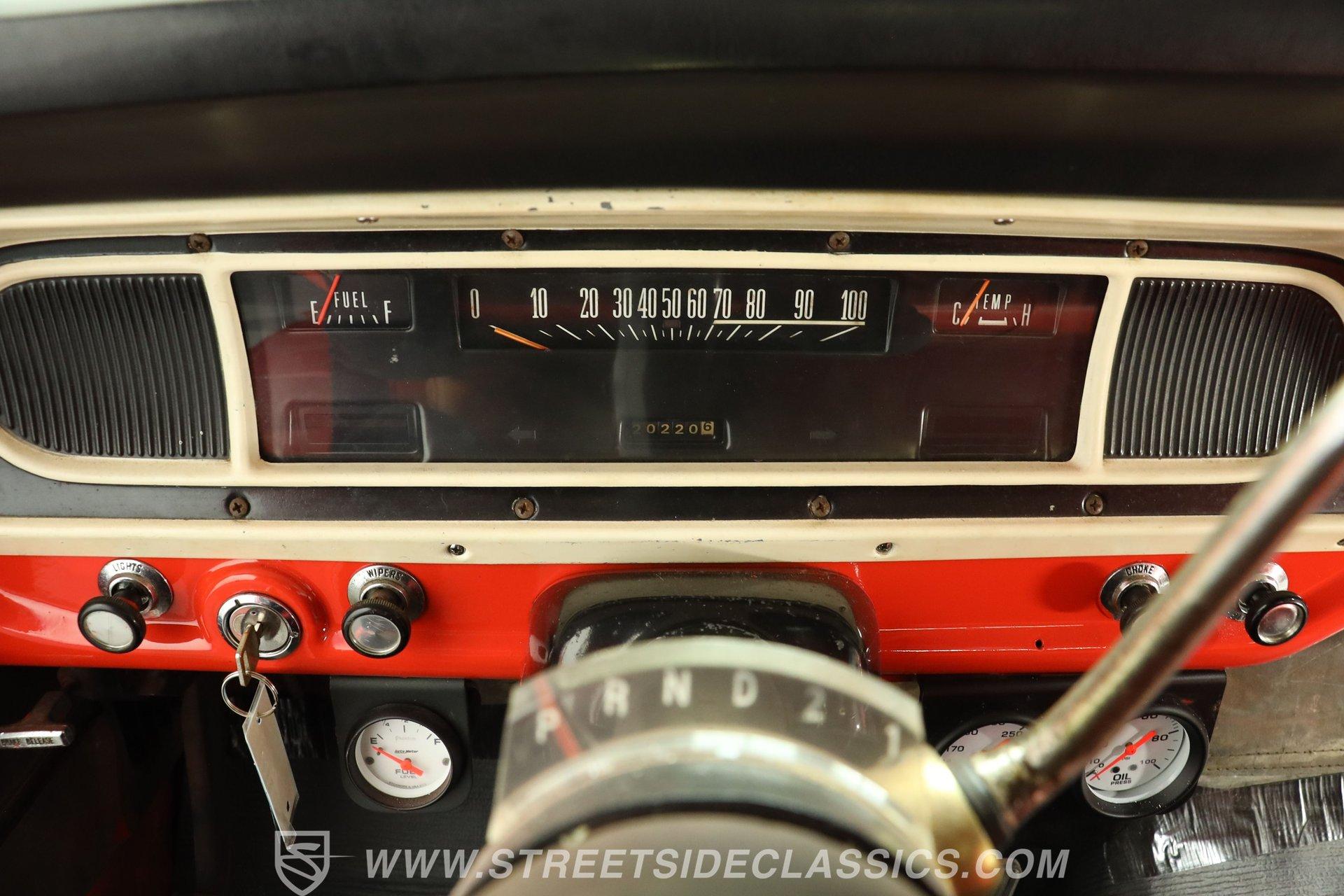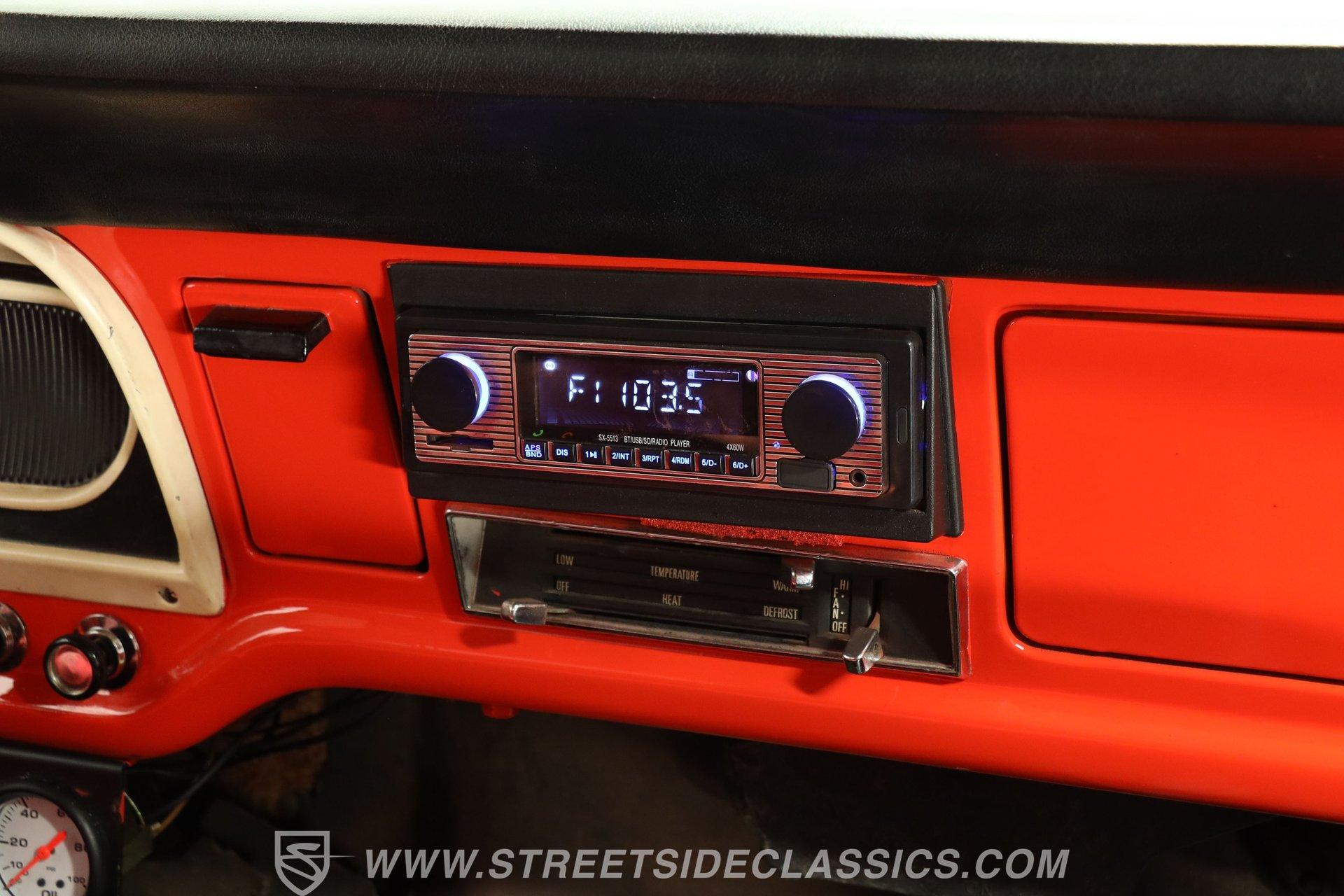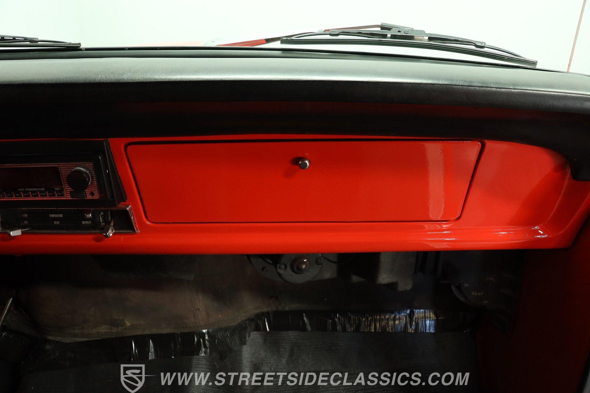 The interior remains largely in factory configuration and really presents well. The steel surrounding the doors and on the dash has been color-matched to the exterior and the red vinyl bench seat is still in full possession of its padding to offer plenty of comfort, even for longer journeys. Up front, the dash hosts an assembly of easily readable gauges in the instrument cluster that are joined by a secondary trio mounted directly below. The added AM/FM stereo has an auxiliary port, so you aren't likely to run out of audio options while you're behind the wheel.