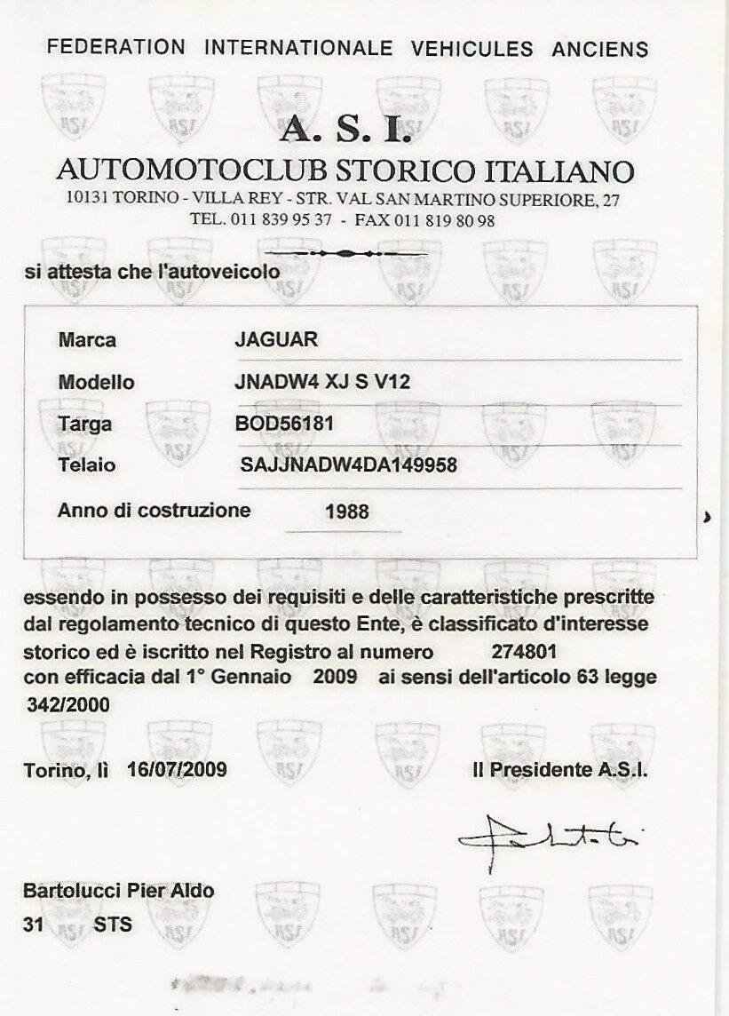 In 2009, the car received its ASI certification (Automotoclub Storico Italiano) as a vehicle of historical interest, registration no. 274801.