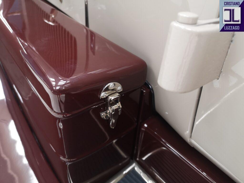 Among the numerous preserved parts that have come down to us, it has been possible to trace the original color of the car (an amaranth red typical of Italian cars of those years) which was located in a hidden area under the side steps.
