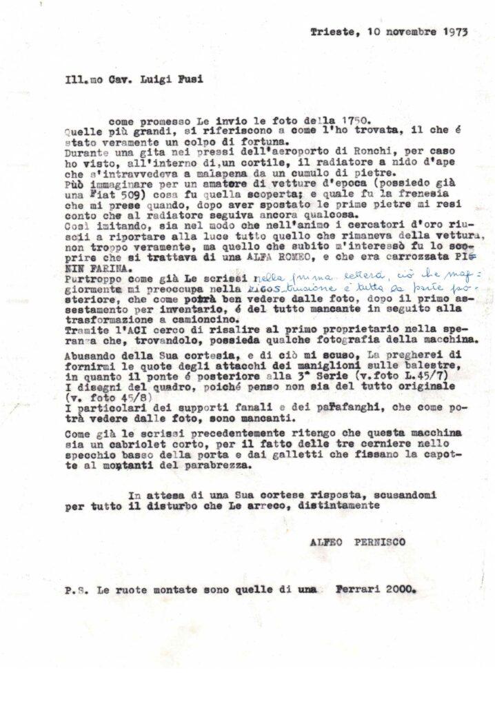 The owner of the time who bought the car to start the restoration asked Cavalier Luigi Fusi (author of the famous books on Alfa Romeos and keeper of the Italian trademark register) for help on how to proceed for an accurate and faithful restoration to the car that was missing only of the rear part due to the conversion to a truck (while all the other original parts are present as written by the ASI report attached in '75).