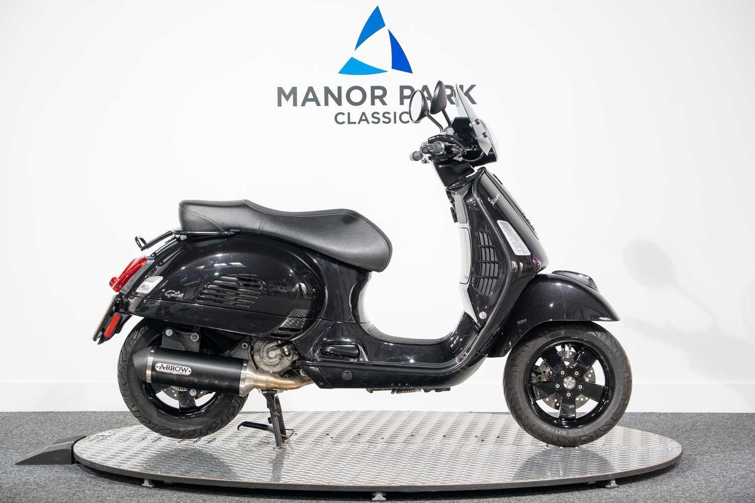 The Vespa GTS 300 (HPE) is a premium, liquid-cooled 278cc scooter producing 23.8 bhp, offering a top speed around 80 mph. It features a steel body, 12-inch wheels, ABS / ASR traction control, and a 790mm seat height.
