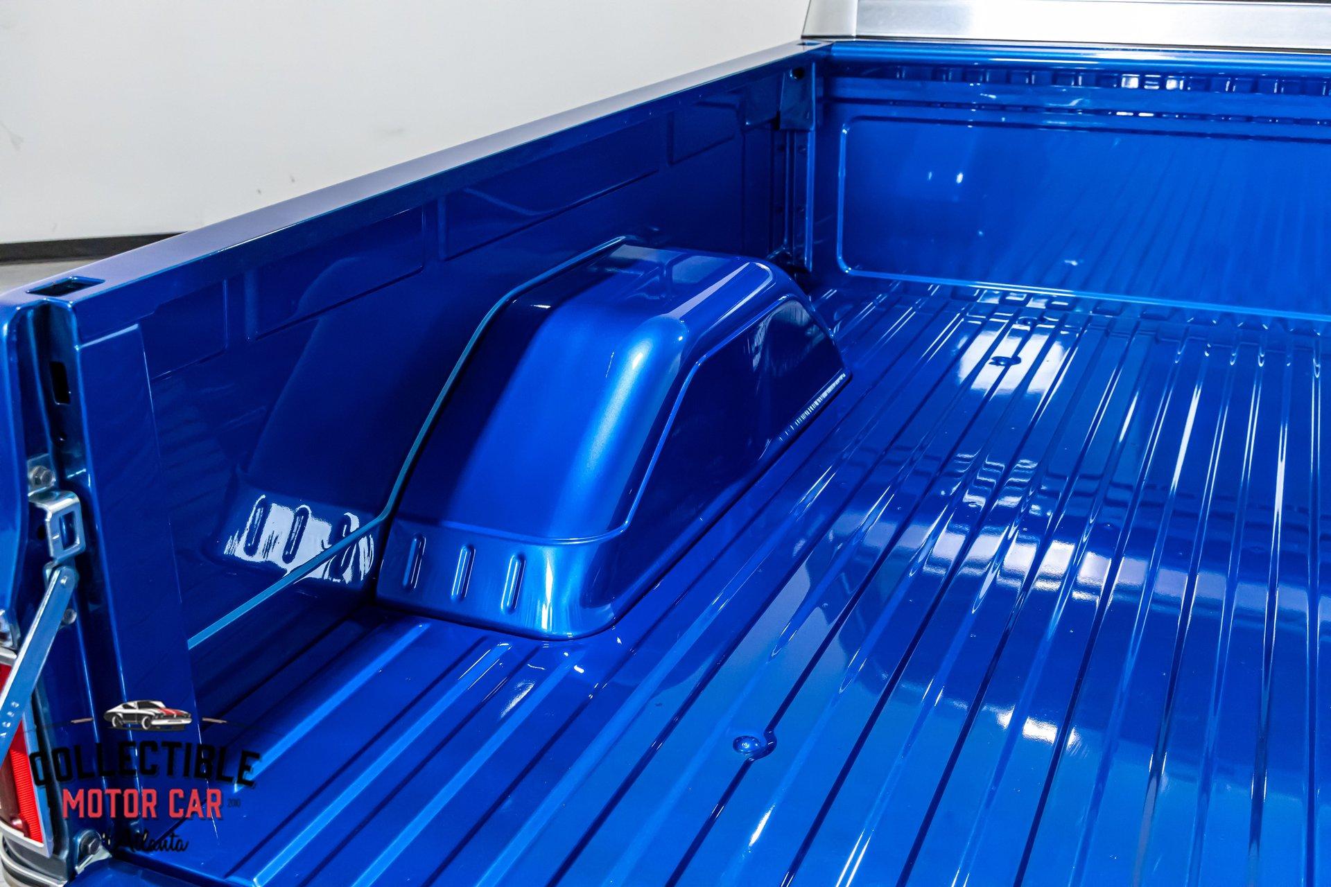 The exterior is what immediately sets this truck apart. Finished in a vibrant metallic blue with gray accent panels, it has a bold custom look while still respecting the original lines of the truck. The paint lays well in the photos, with strong gloss and good contrast between the two colors. Chrome trim and brightwork help tie everything together, while the classic square-body grille and front-end styling keep the truck unmistakably Chevrolet.