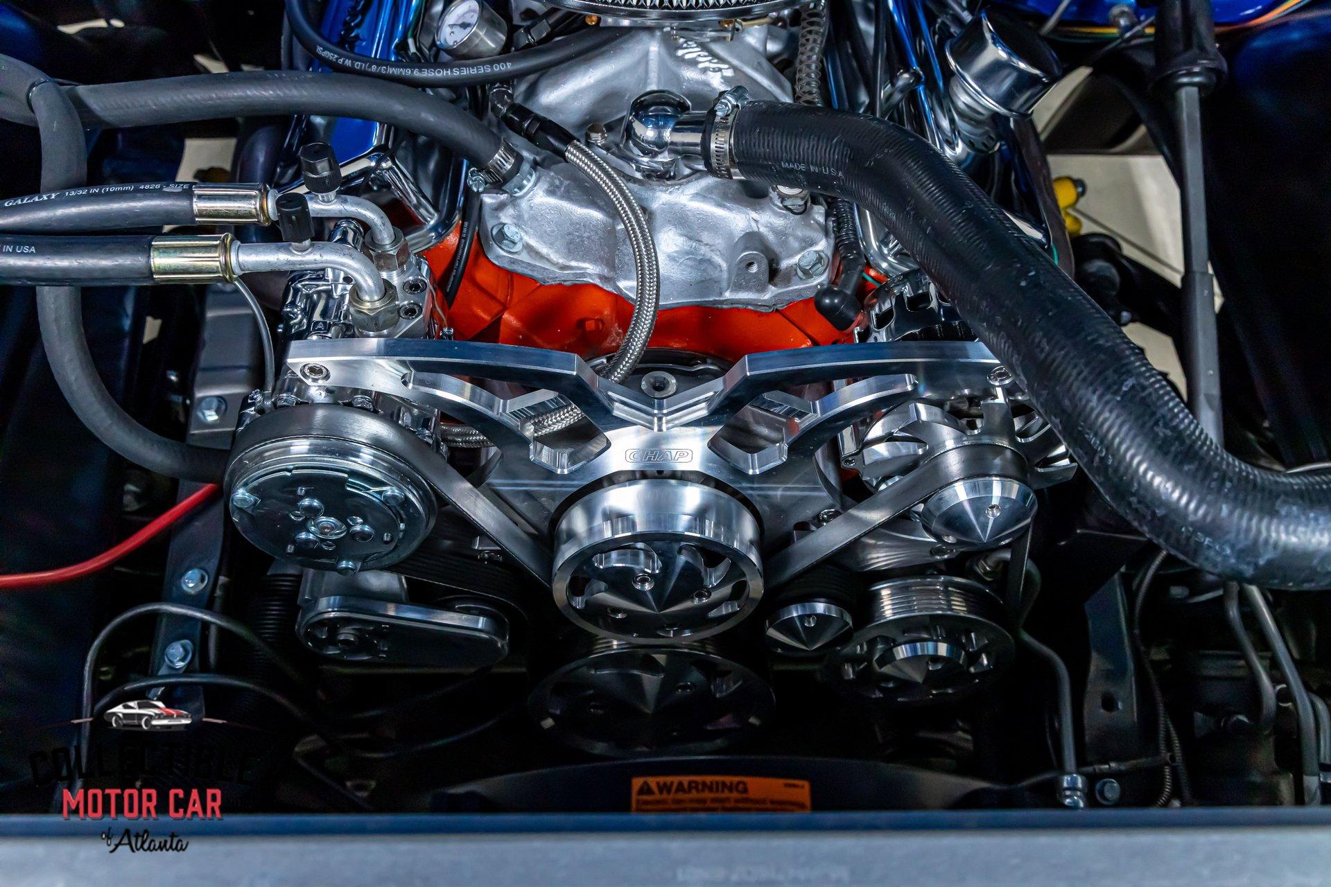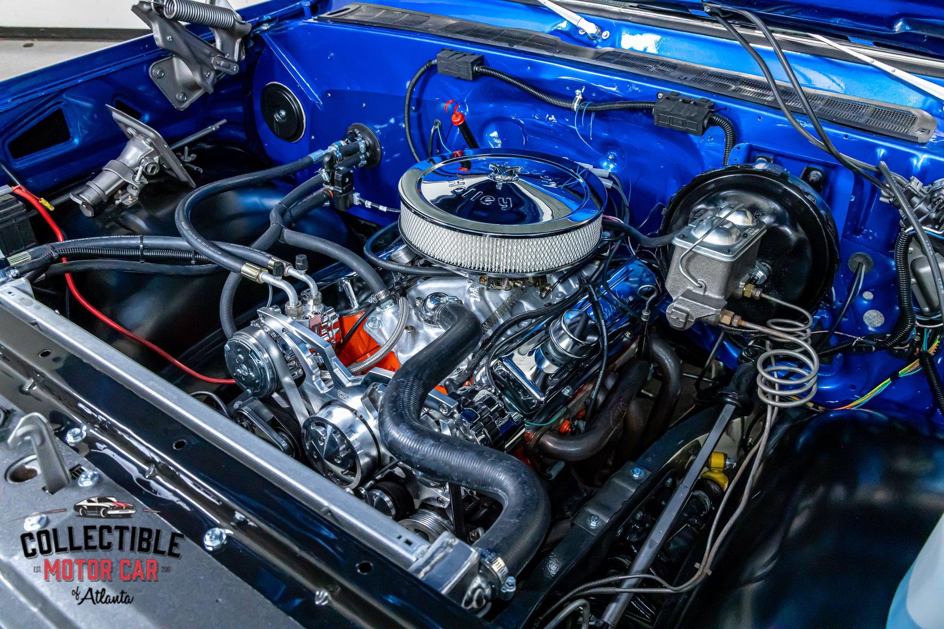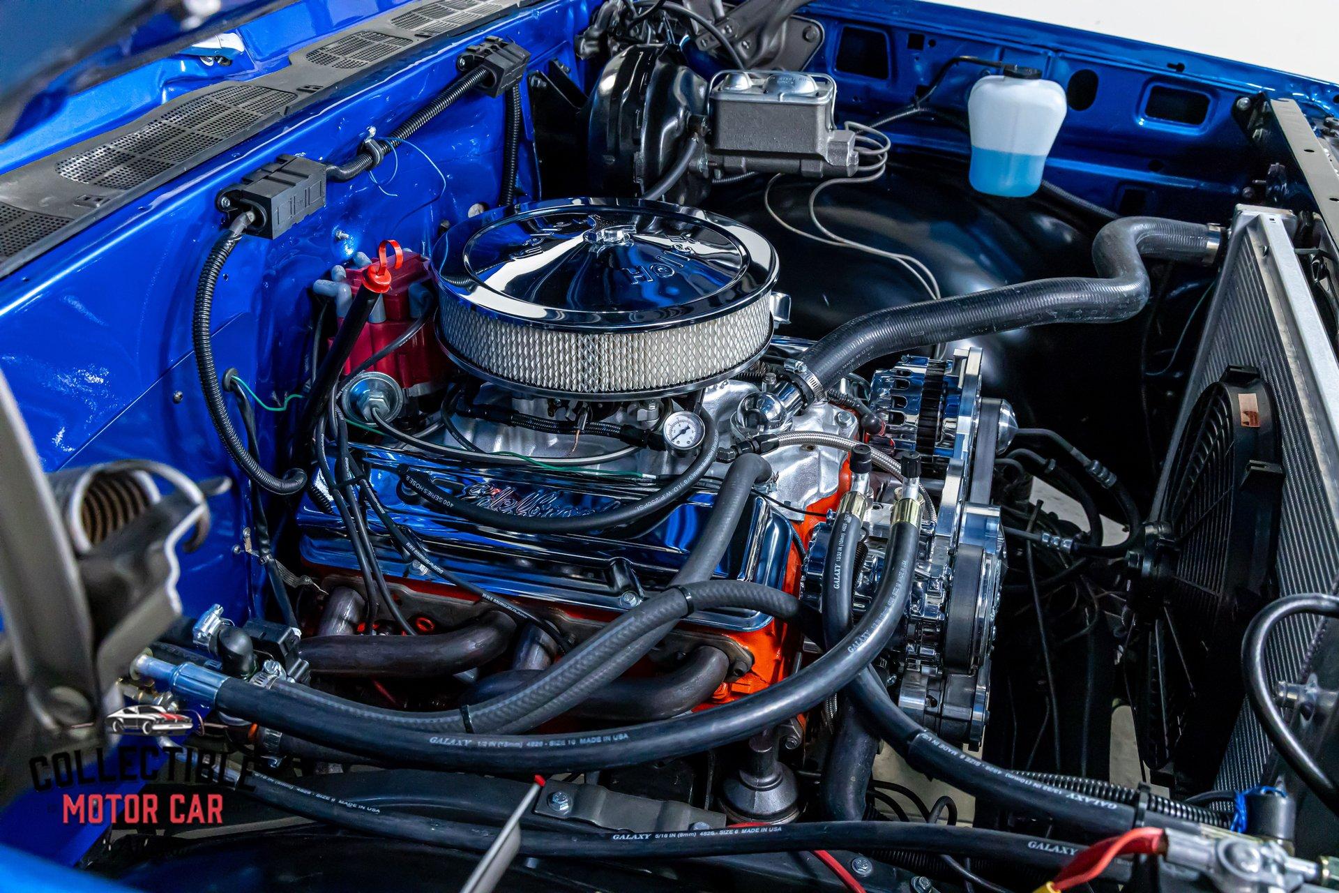 Power comes from a 350 cubic-inch V8, a tried-and-true small-block Chevrolet setup that is right at home in a truck like this. Underhood presentation is clean and detailed, with polished and upgraded components helping the engine bay stand out.