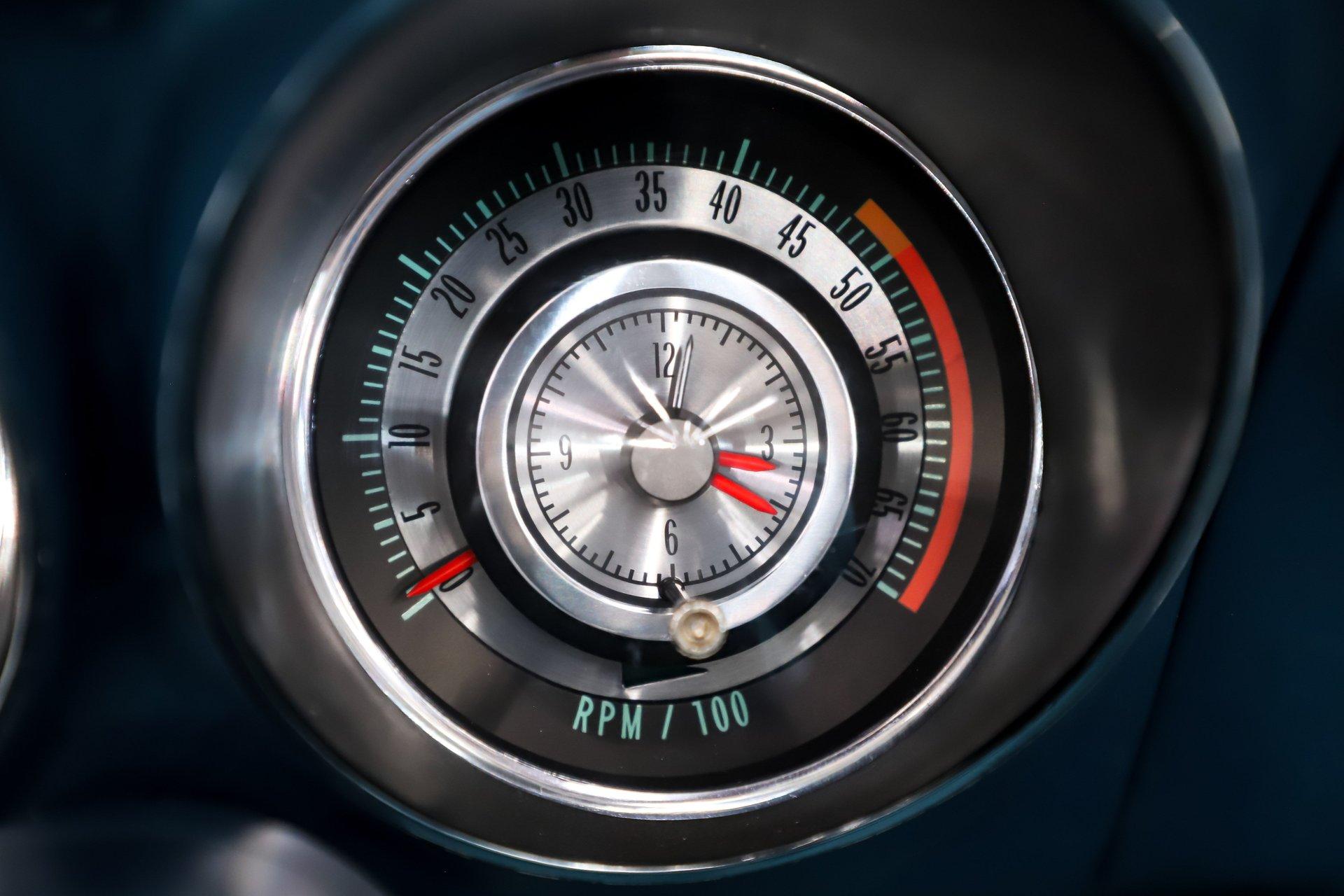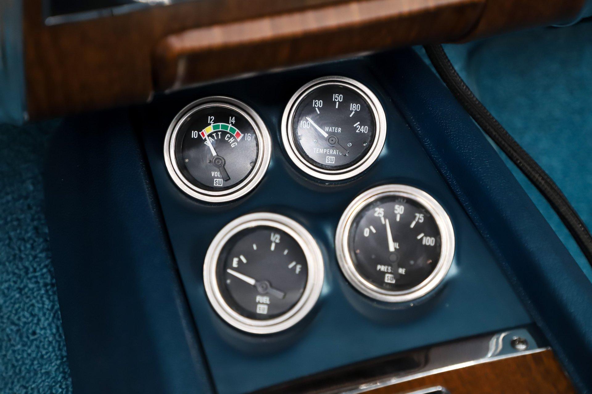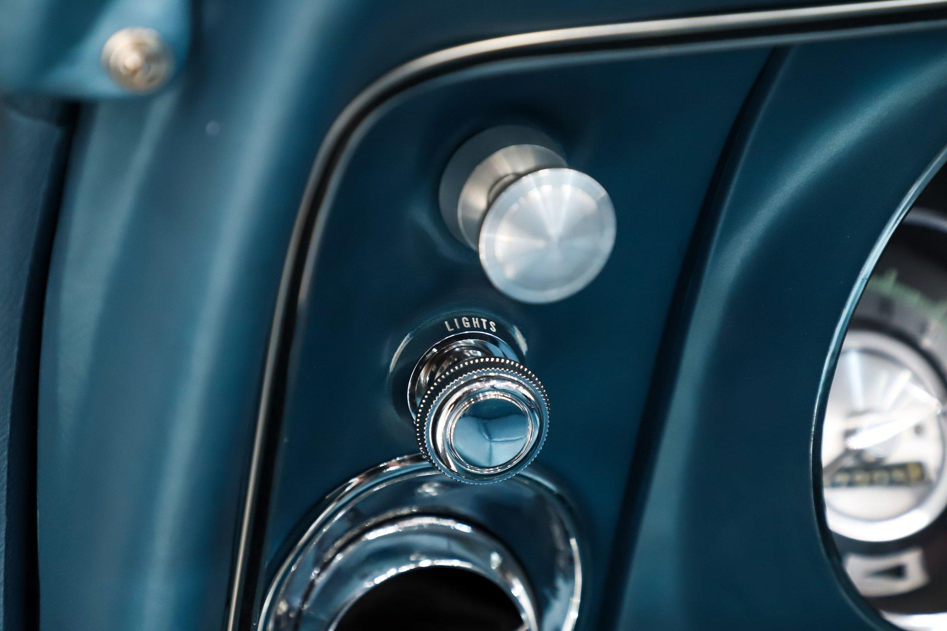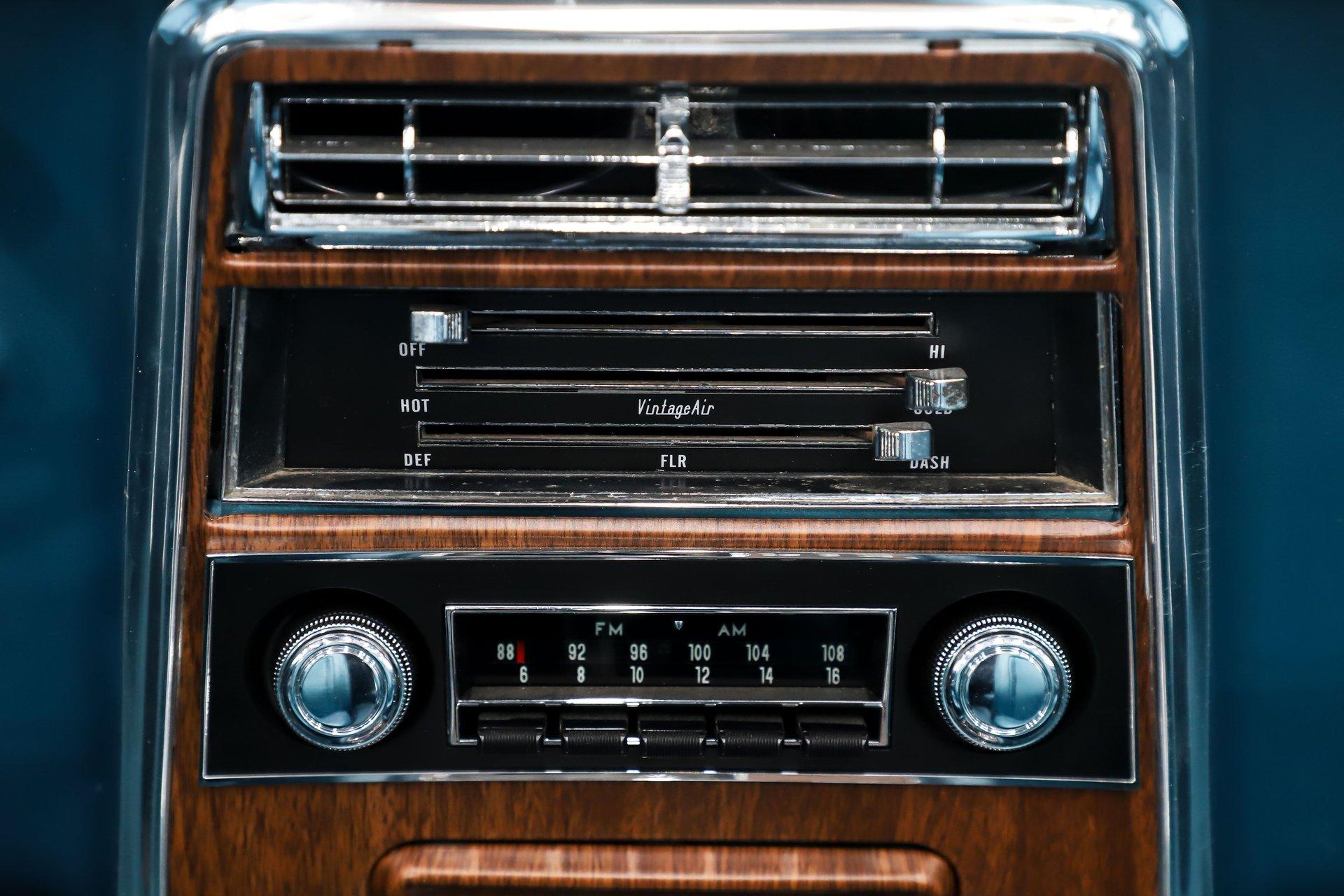 INTERIOR: The bright blue interior really pops in this car! It's a deluxe which includes molded door panels and upgraded upholstery. The front seats have TMI custom bolstered cushions that are really comfortable. The carpet has been replaced and also has embroidered mats. New dash pad and steering wheel. It has a factory tick tock tachometer and a center console with upgraded gauges. Upgraded with Vintage Air electric slide controls and a retro AM/FM stereo that looks original. The speakers also look factory in the kick panels.