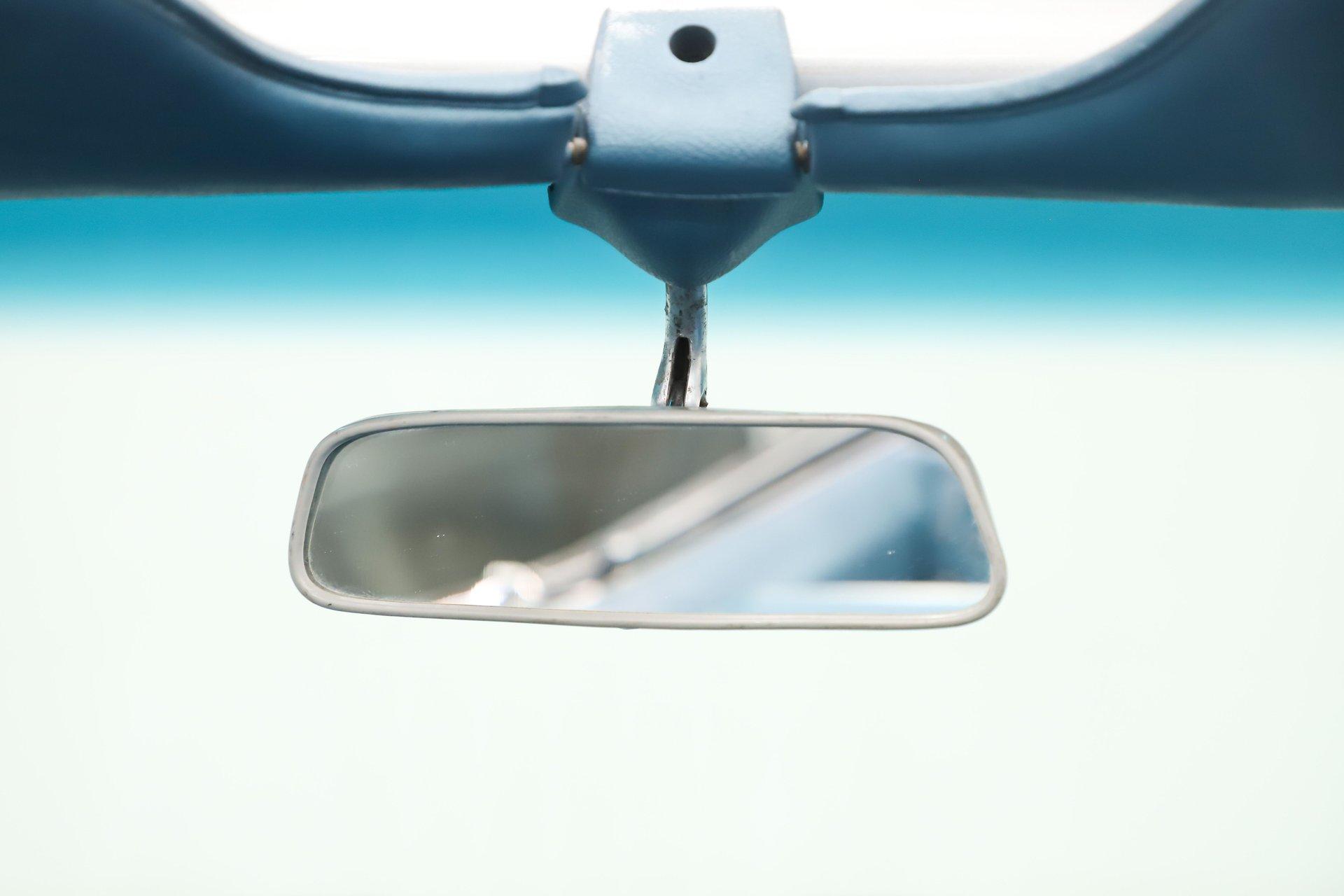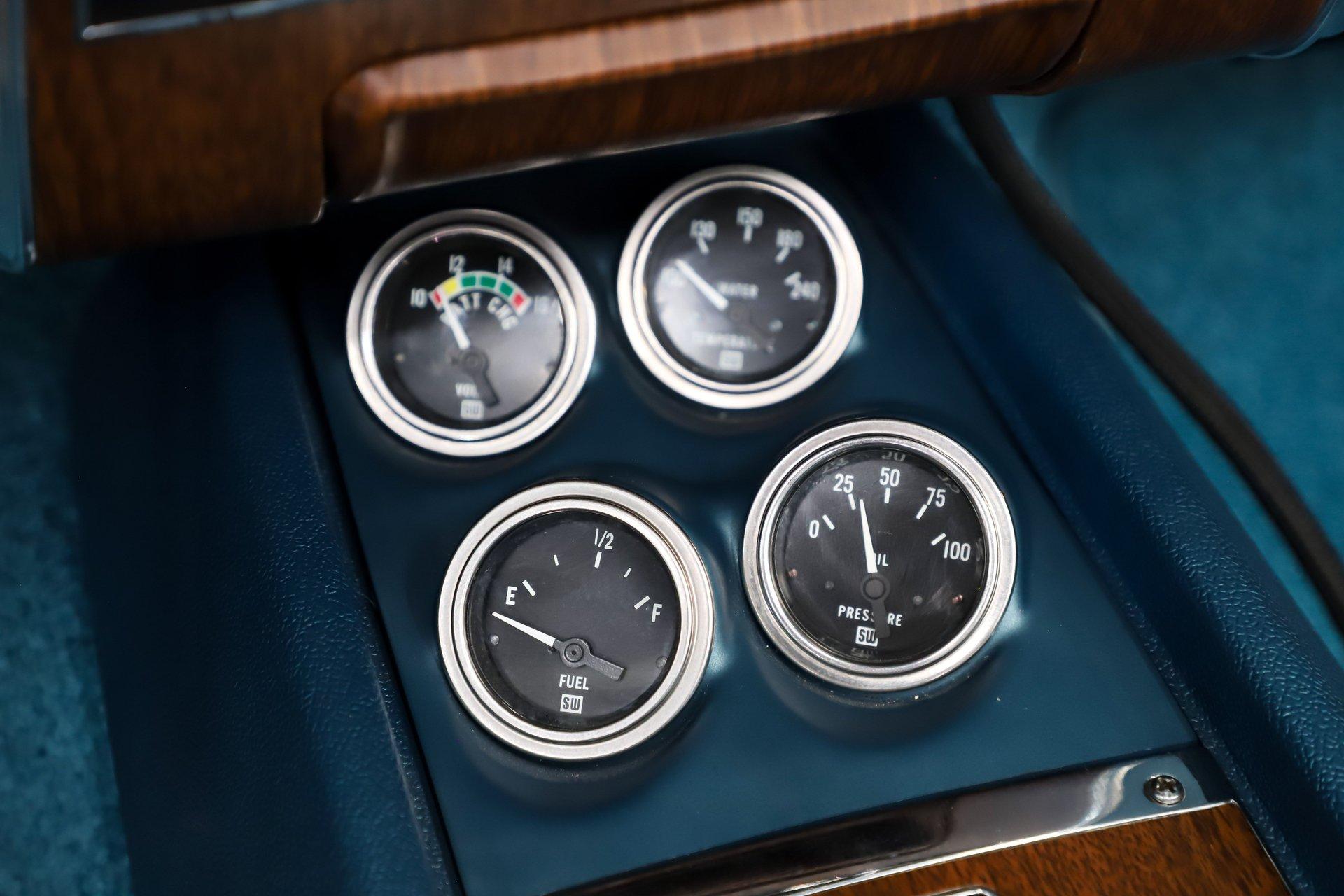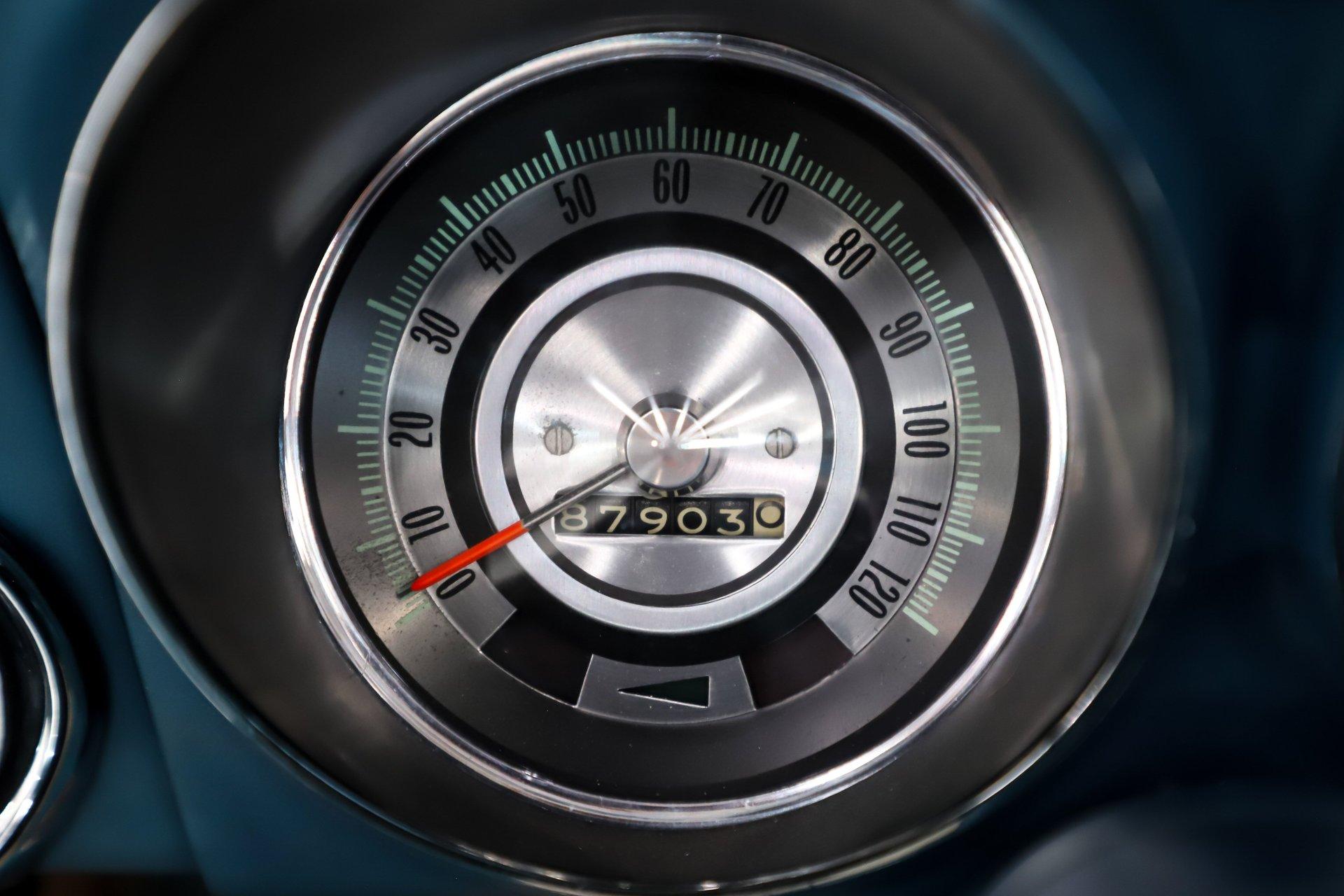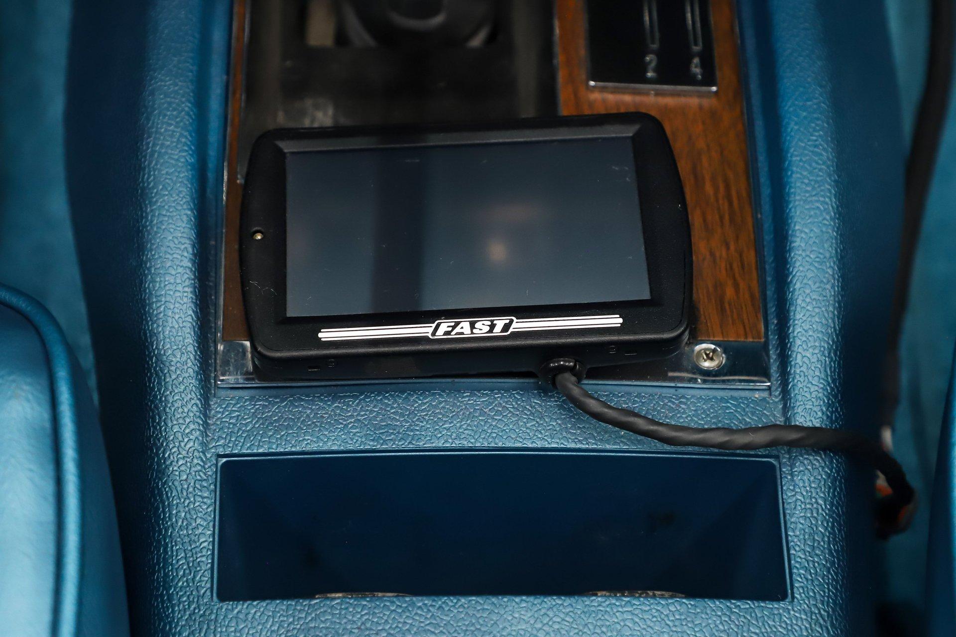 INTERIOR: The bright blue interior really pops in this car! It's a deluxe which includes molded door panels and upgraded upholstery. The front seats have TMI custom bolstered cushions that are really comfortable. The carpet has been replaced and also has embroidered mats. New dash pad and steering wheel. It has a factory tick tock tachometer and a center console with upgraded gauges. Upgraded with Vintage Air electric slide controls and a retro AM/FM stereo that looks original. The speakers also look factory in the kick panels.