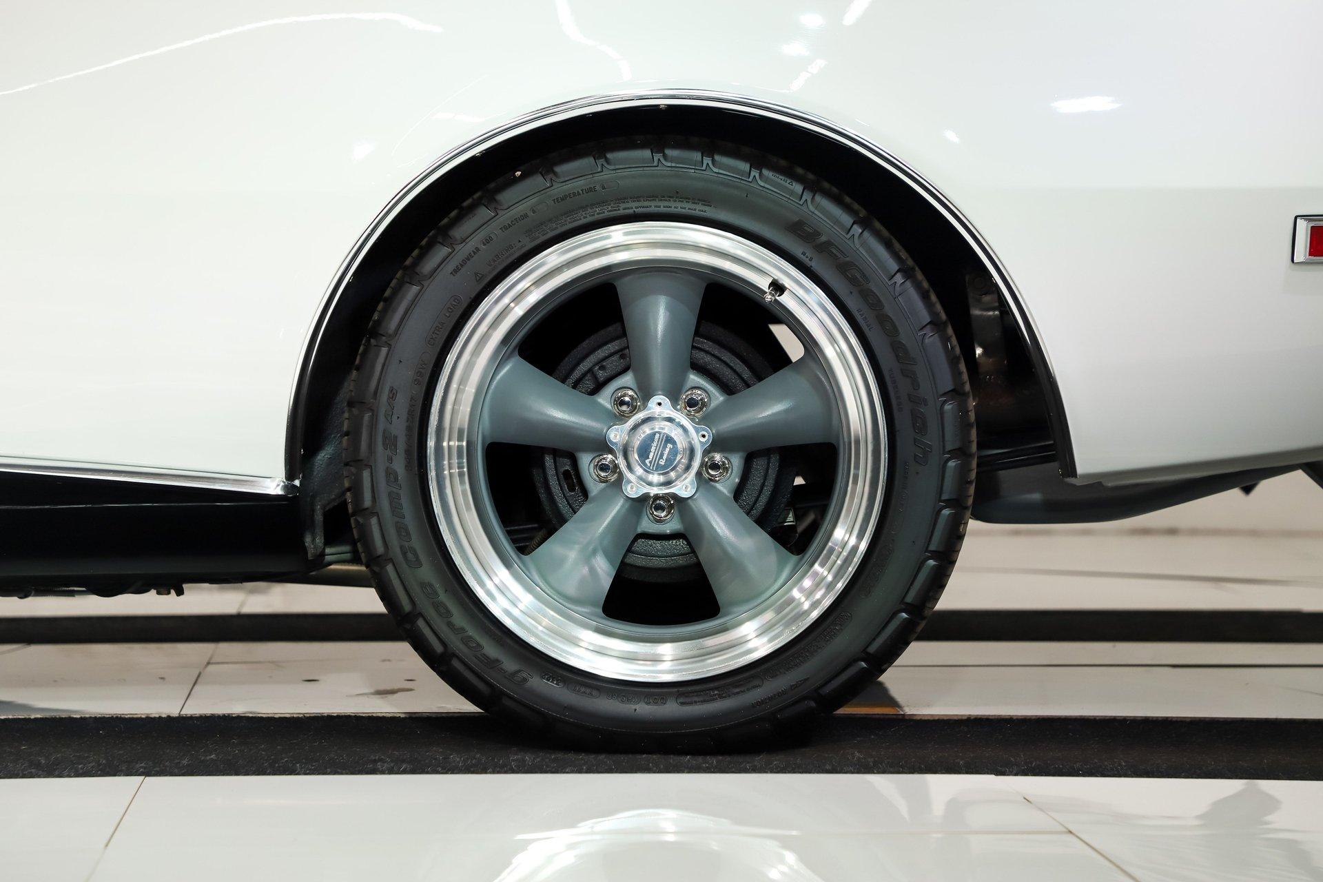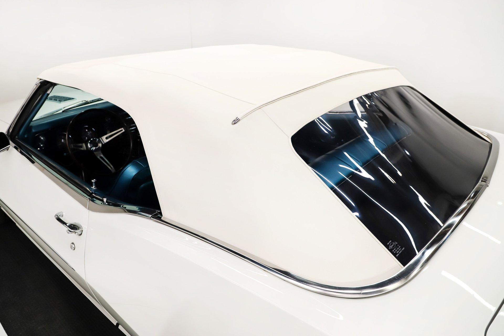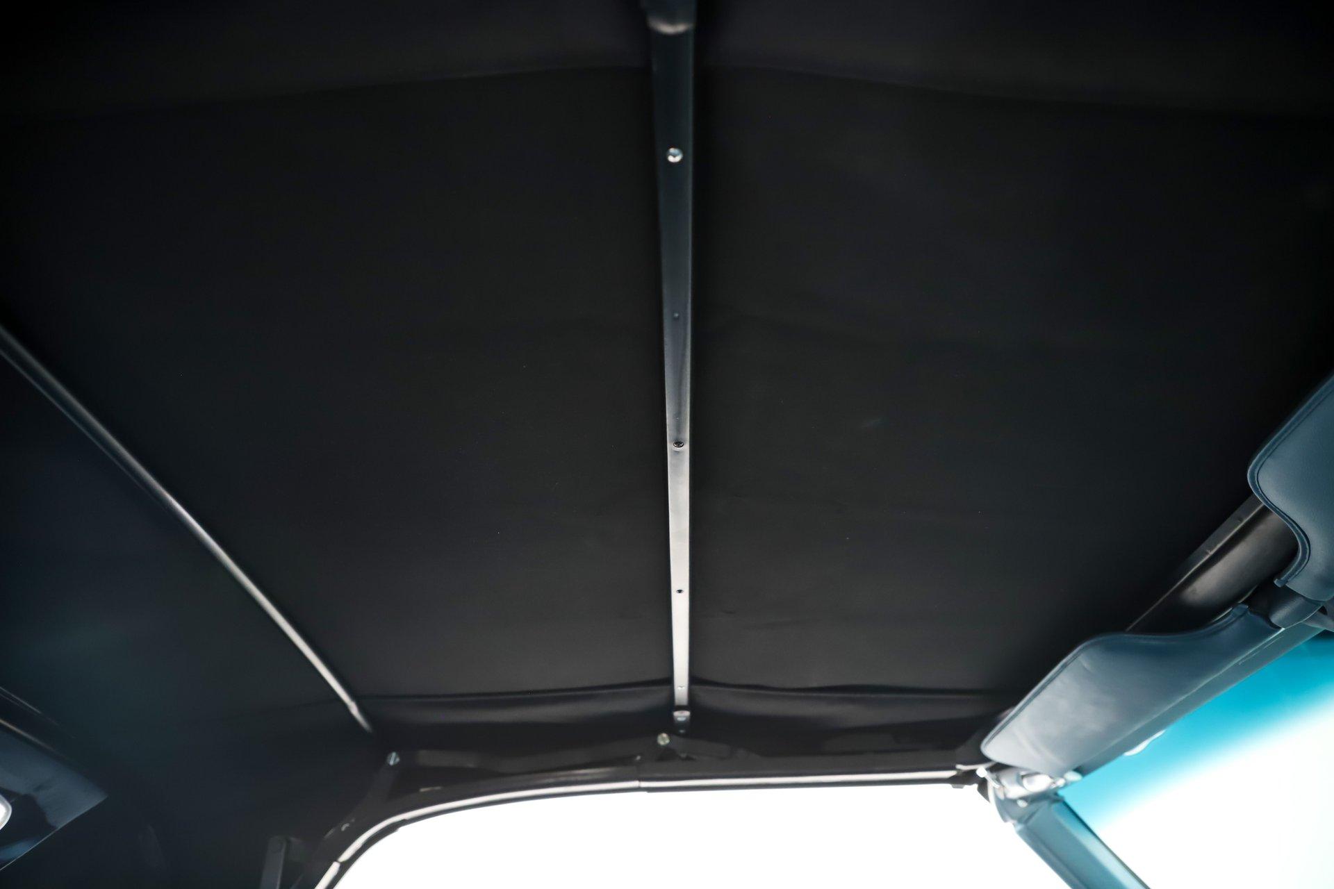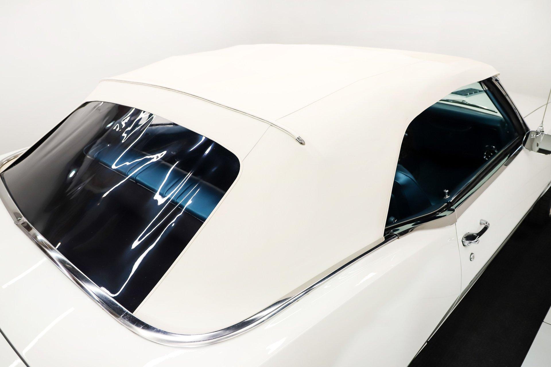 EXTERIOR: It is claimed to have its original metal and it looks clean! It's straight and smooth from the rockers up. Repainted its original Ermine White and has a glossy finish. The dark blue metallic stripe is a nice touch and it is smooth too. The power top has an all new convertible top frame, weatherstrips and white top. It's sitting real pretty and a set of 17 inch Torque Thrust wheels wrapped in G-Force performance tires, a little bit wider in the back.