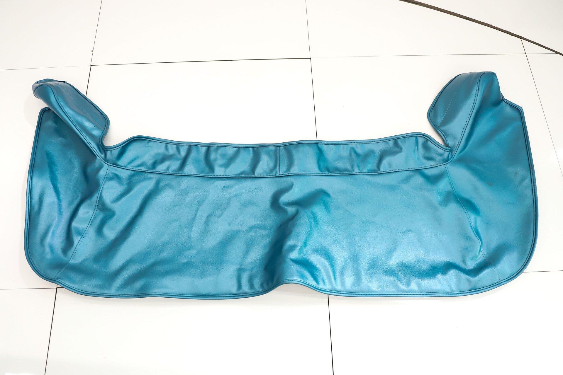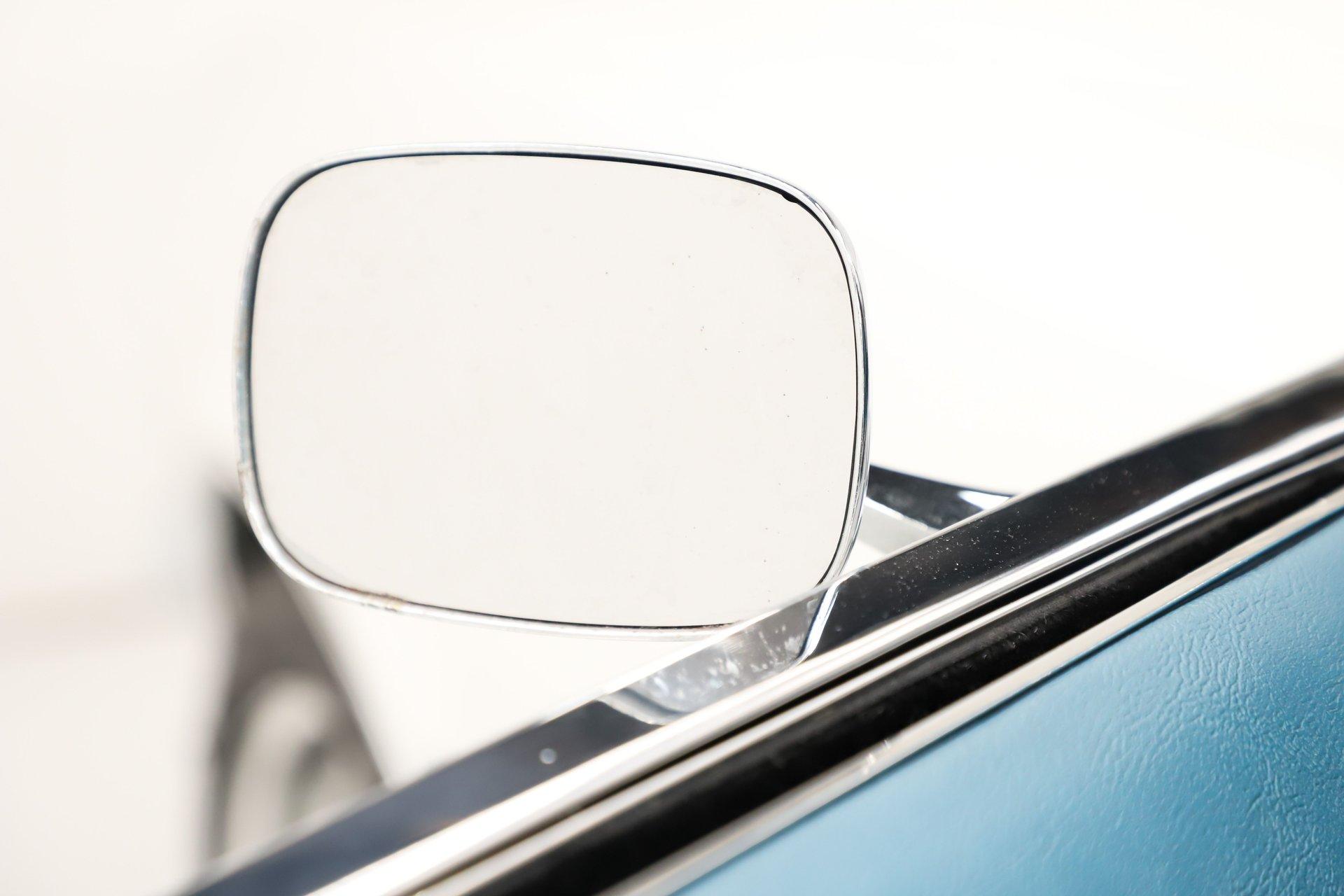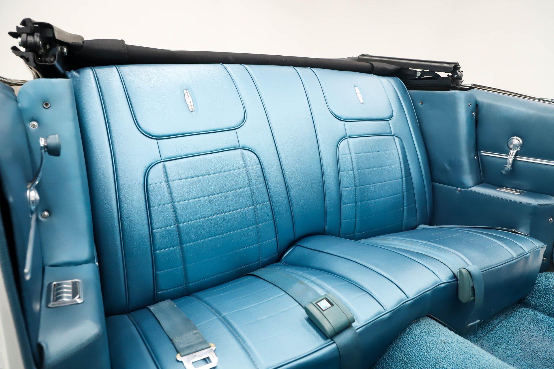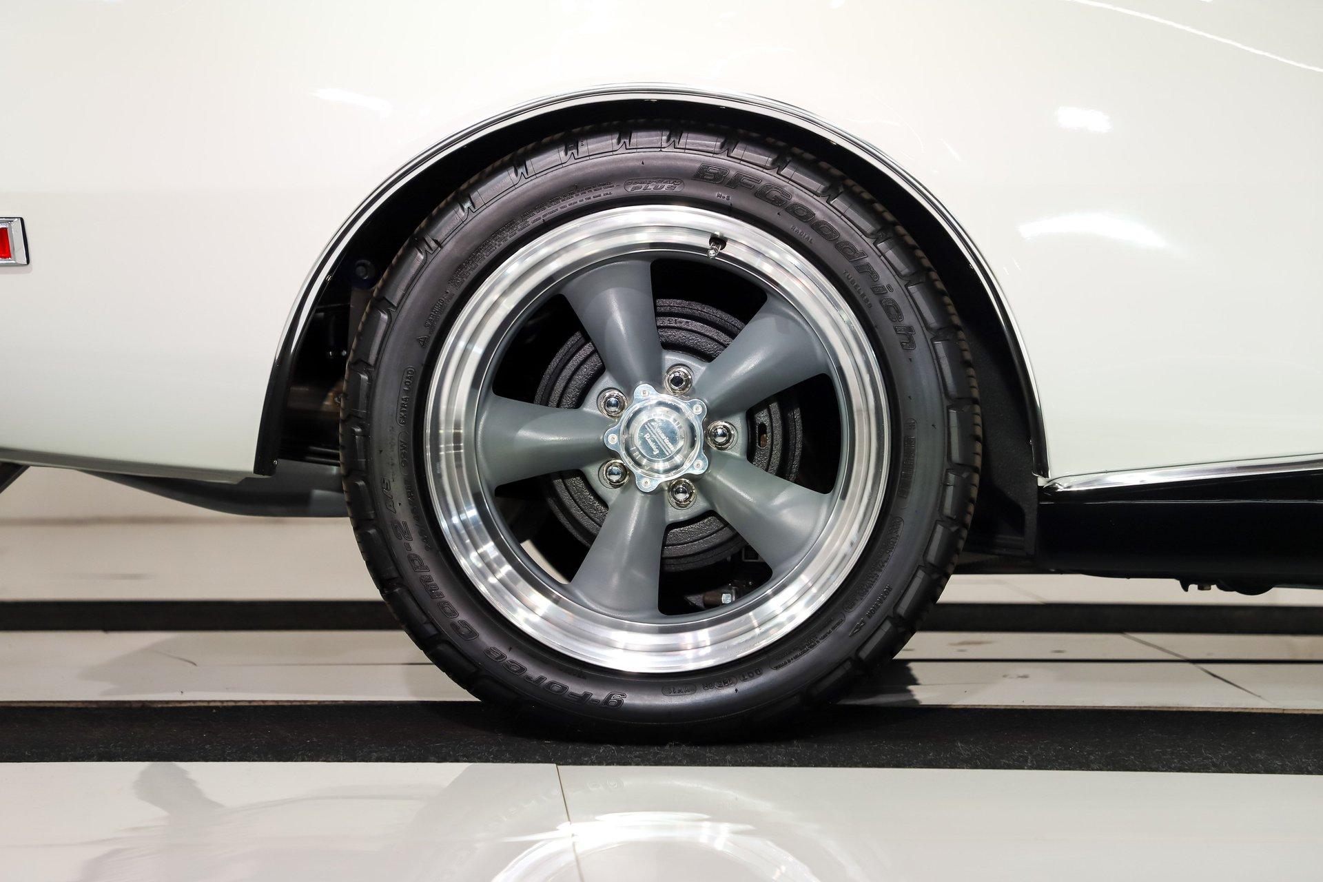 EXTERIOR: It is claimed to have its original metal and it looks clean! It's straight and smooth from the rockers up. Repainted its original Ermine White and has a glossy finish. The dark blue metallic stripe is a nice touch and it is smooth too. The power top has an all new convertible top frame, weatherstrips and white top. It's sitting real pretty and a set of 17 inch Torque Thrust wheels wrapped in G-Force performance tires, a little bit wider in the back.