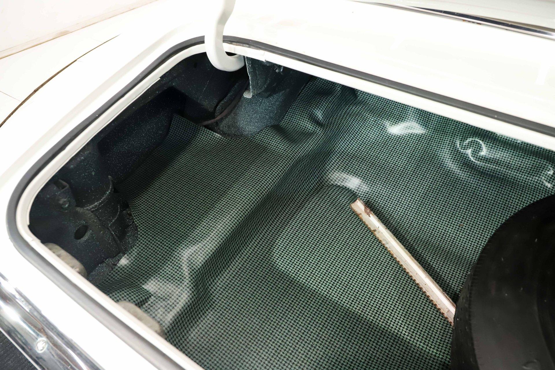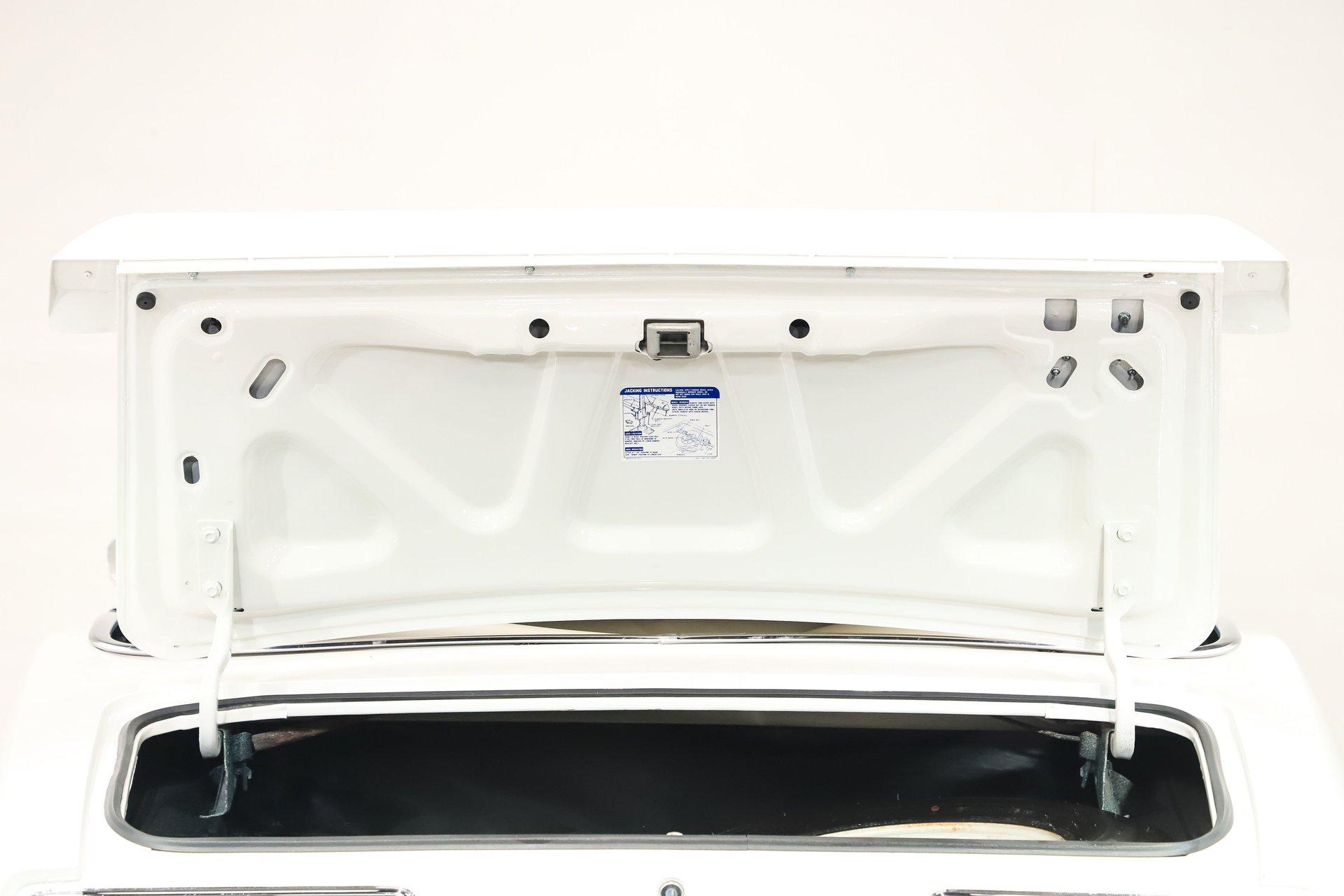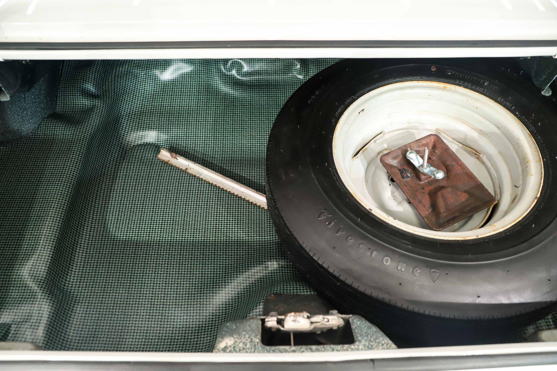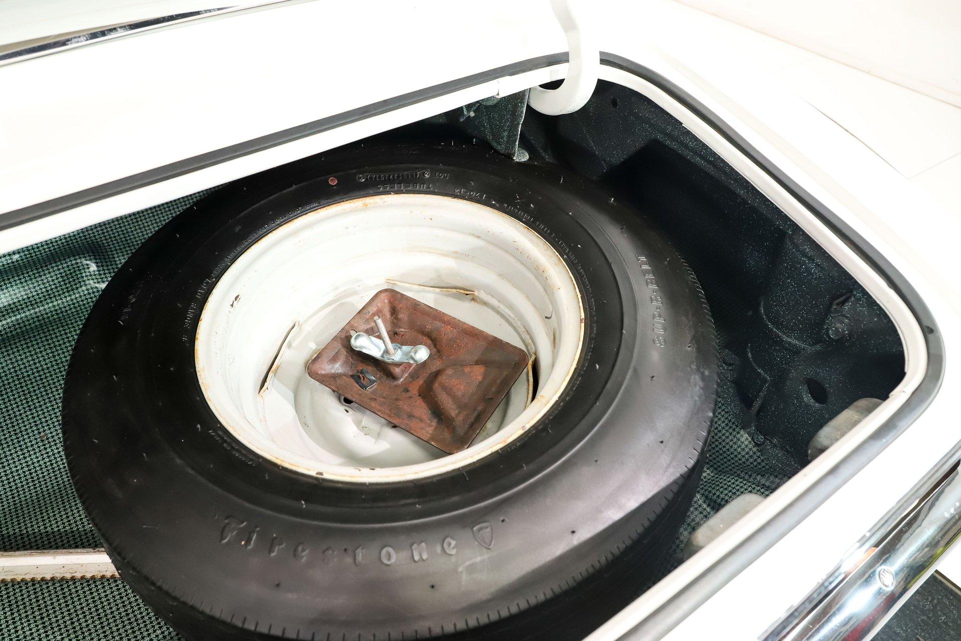 TRUNK COMPARTMENT: It is clean and complete! Under the lid and the jamb are painted slick, the weatherstrip, decal and mat were replaced. Inside is solid metal with a spatter finish and the original shaker cans. It's complete with a Firestone reproduction tire that's never been used and a jack assembly.