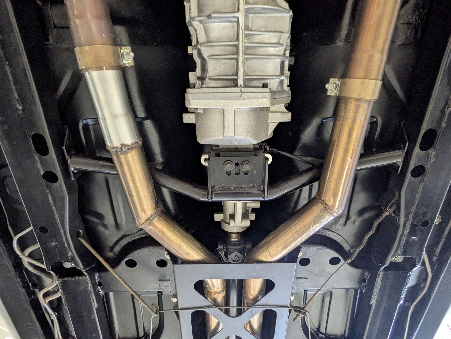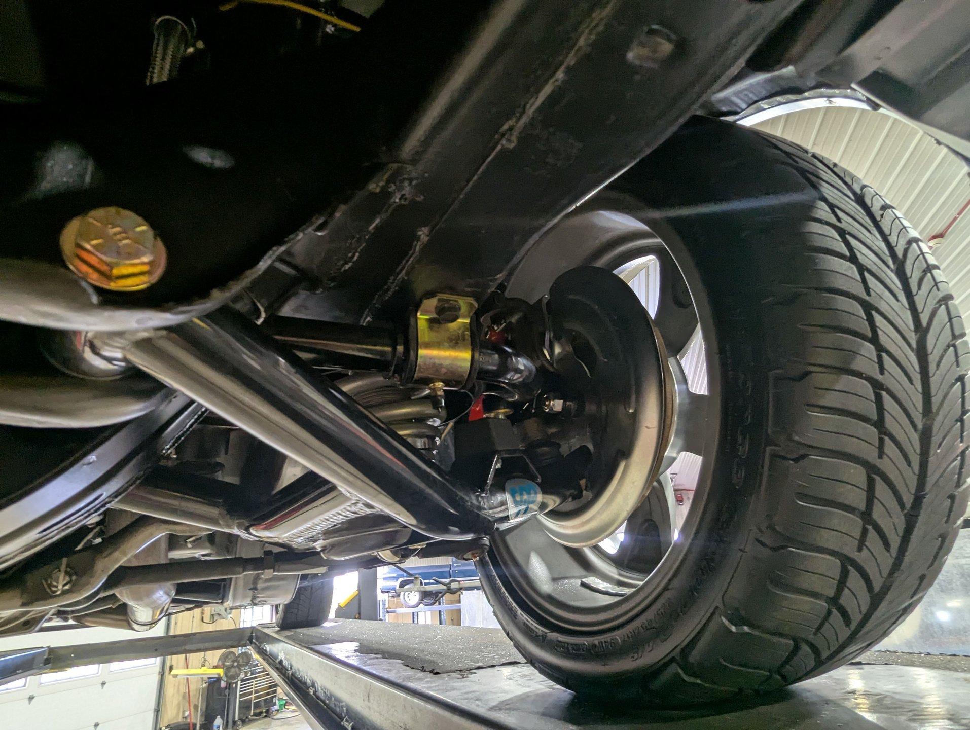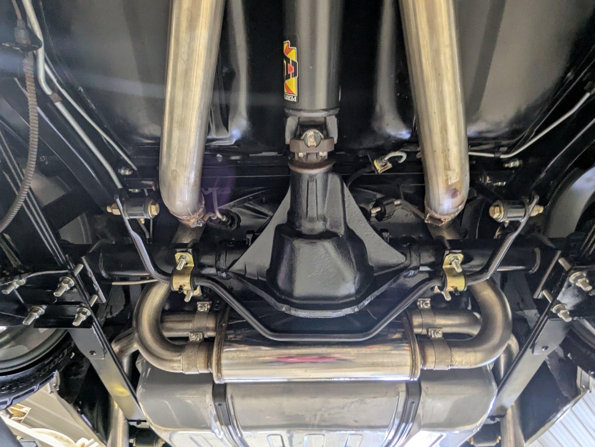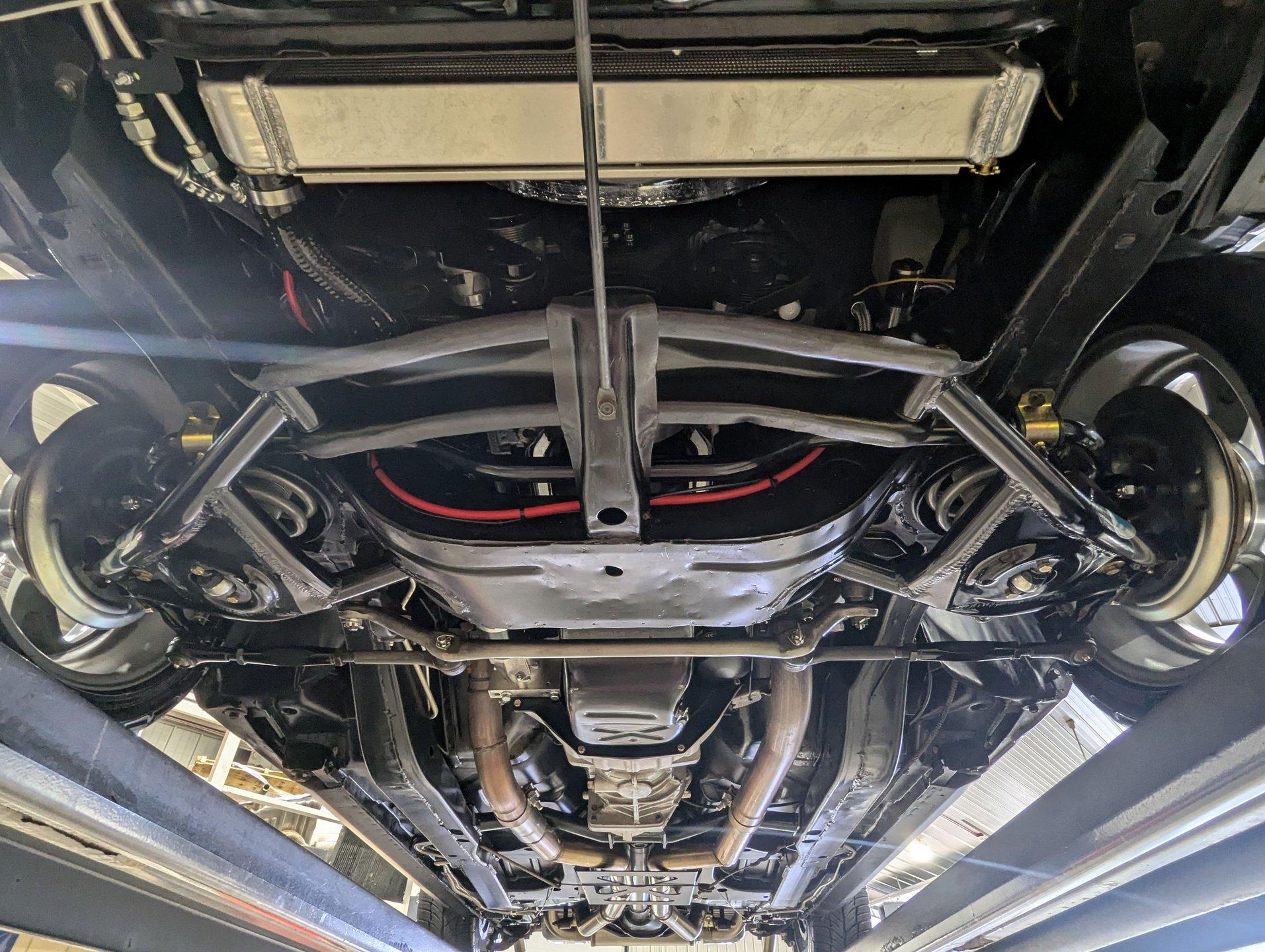 UNDERSIDE: The front end suspension is completely replaced and upgraded with CPP tubular upper and lower control arms, coilover adjustable gas shocks, and heavy duty swaybar. The steering components were all replaced. It has countersunk welded frame connectors and in back it has new springs, bushings, Bilstein shocks and a swaybar. New fuel system including the tank, sending unit and lines. The dual exhaust is stainless with a polished transverse muffler. The brakes were rebuilt. Upgraded with Wilwood drilled and slotted disc in front, all new braided hoses, lines and e-brake are hooked up. Looking up at the motor it still looks brand new, the GM part number tag is still attached and it has a high torque starter. Upgraded with a TKX Tremec 5-speed transmission and a new drive shaft leads back to the 10 bolt rear end. The floors look spotless, clean metal painted semi-gloss black. Everything underneath here looks fresh.