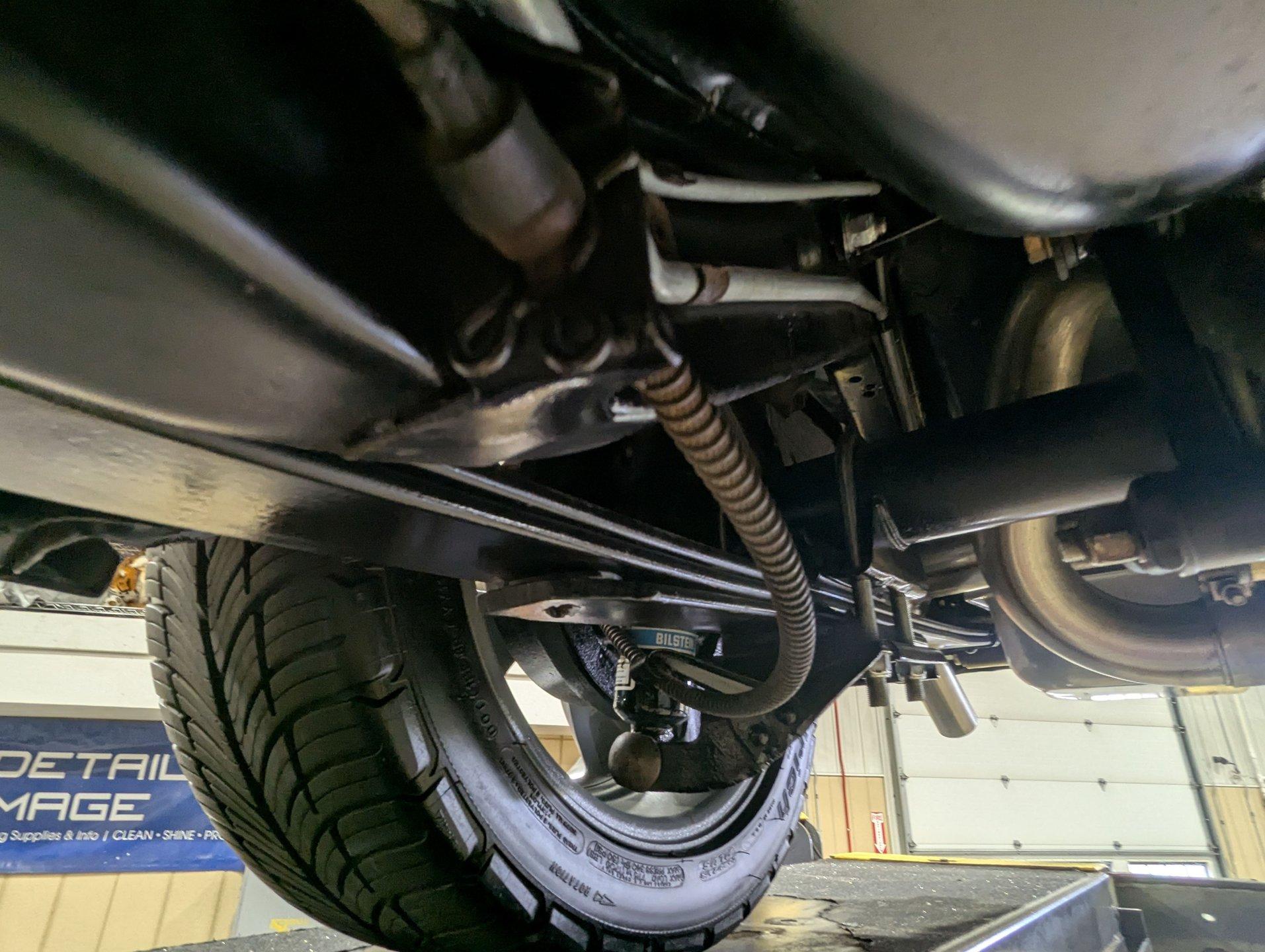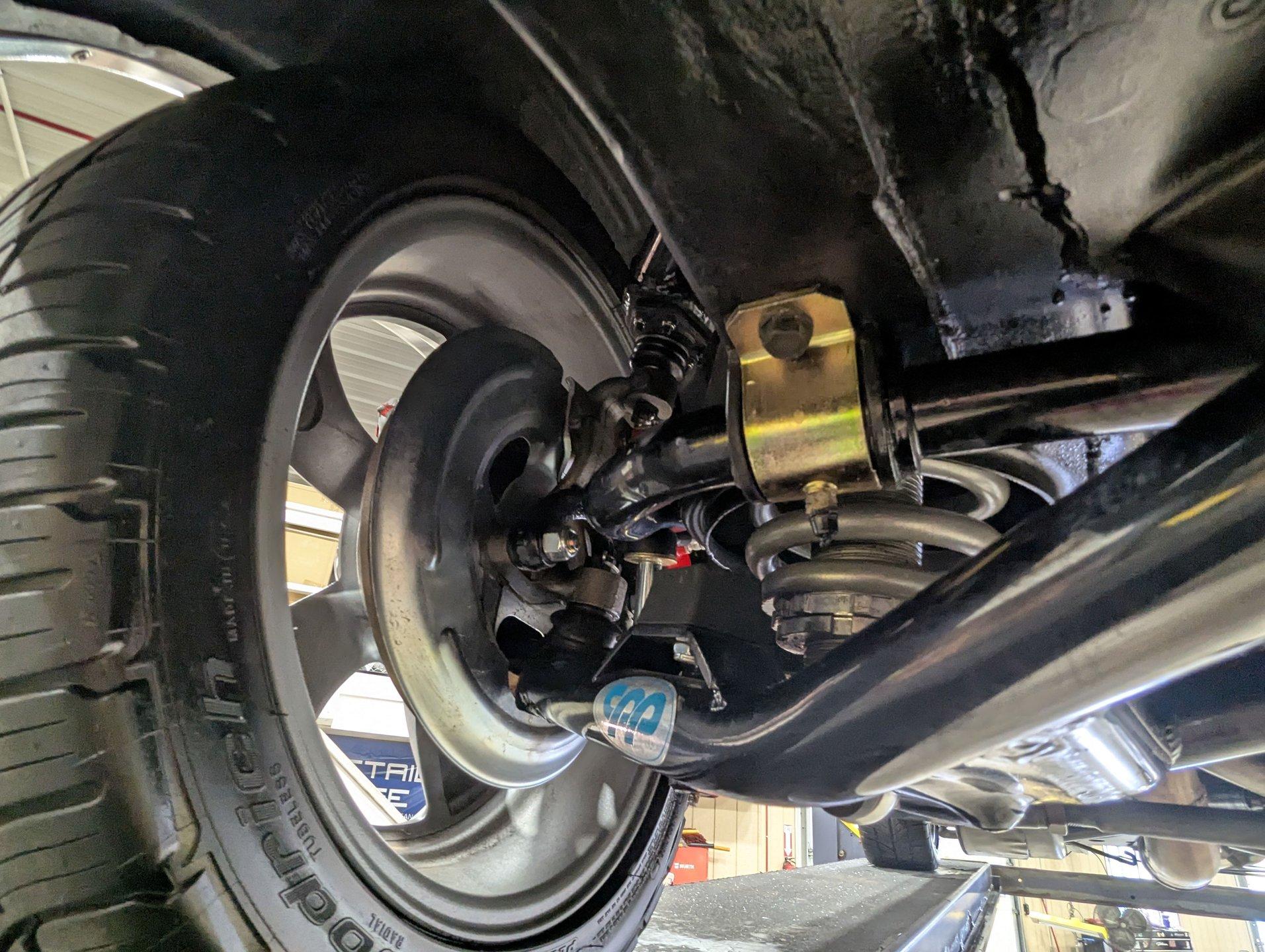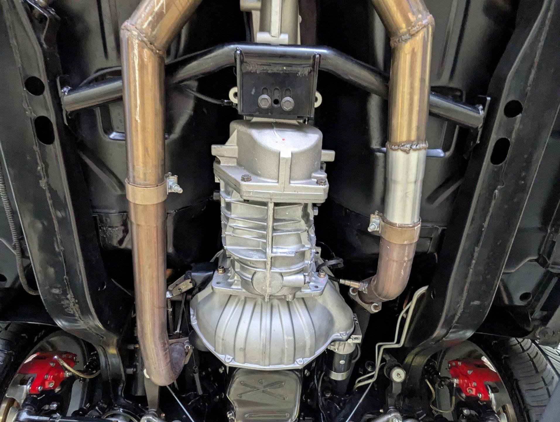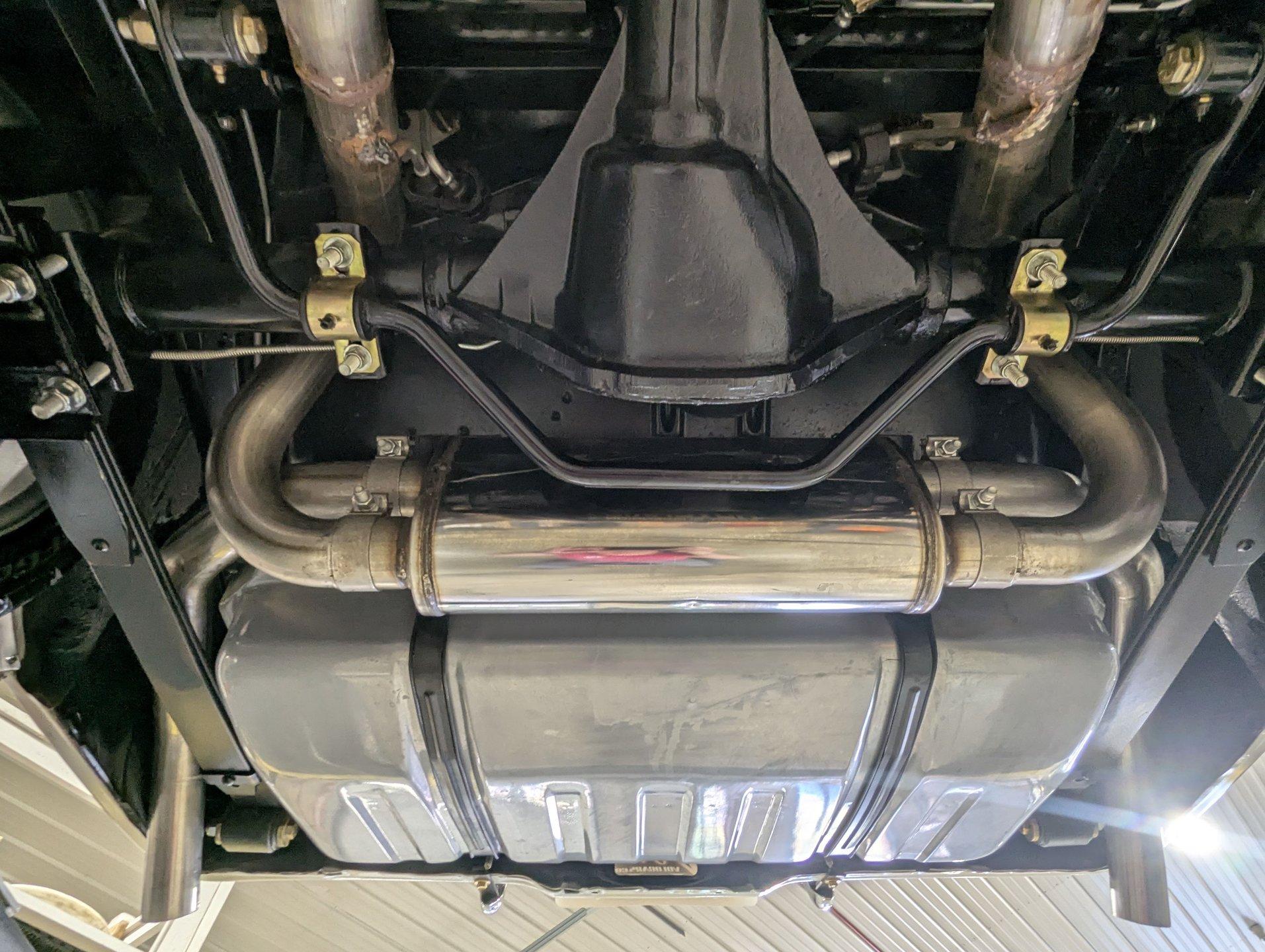 UNDERSIDE: The front end suspension is completely replaced and upgraded with CPP tubular upper and lower control arms, coilover adjustable gas shocks, and heavy duty swaybar. The steering components were all replaced. It has countersunk welded frame connectors and in back it has new springs, bushings, Bilstein shocks and a swaybar. New fuel system including the tank, sending unit and lines. The dual exhaust is stainless with a polished transverse muffler. The brakes were rebuilt. Upgraded with Wilwood drilled and slotted disc in front, all new braided hoses, lines and e-brake are hooked up. Looking up at the motor it still looks brand new, the GM part number tag is still attached and it has a high torque starter. Upgraded with a TKX Tremec 5-speed transmission and a new drive shaft leads back to the 10 bolt rear end. The floors look spotless, clean metal painted semi-gloss black. Everything underneath here looks fresh.