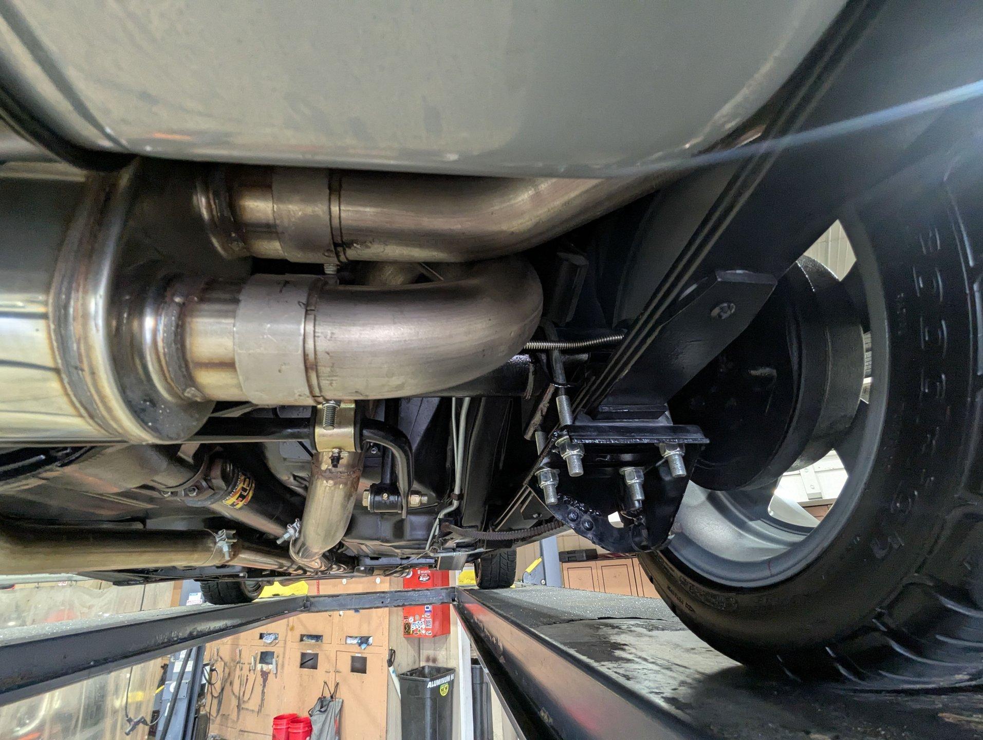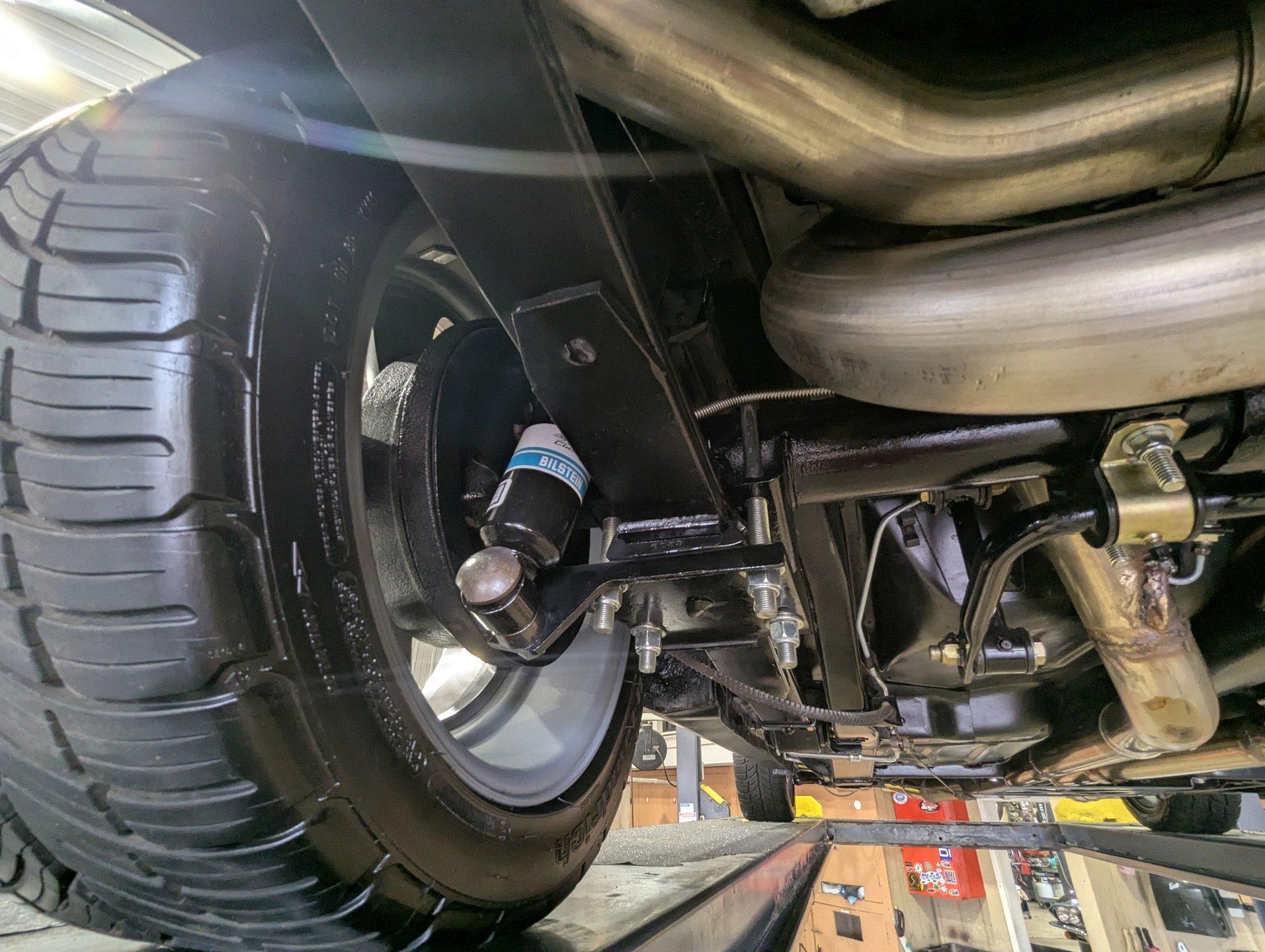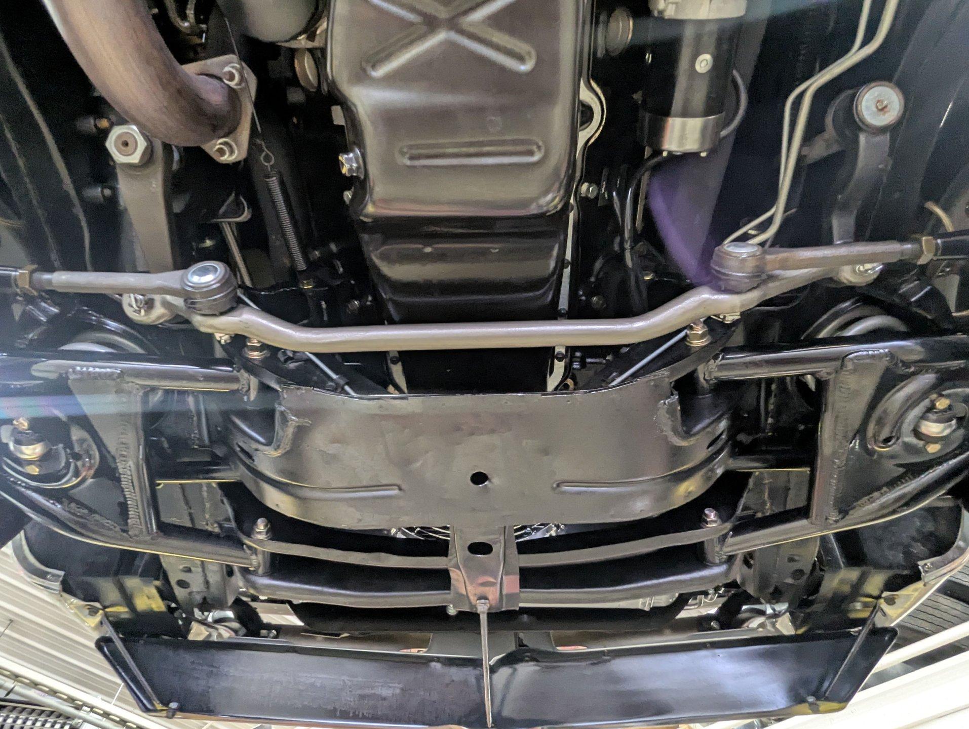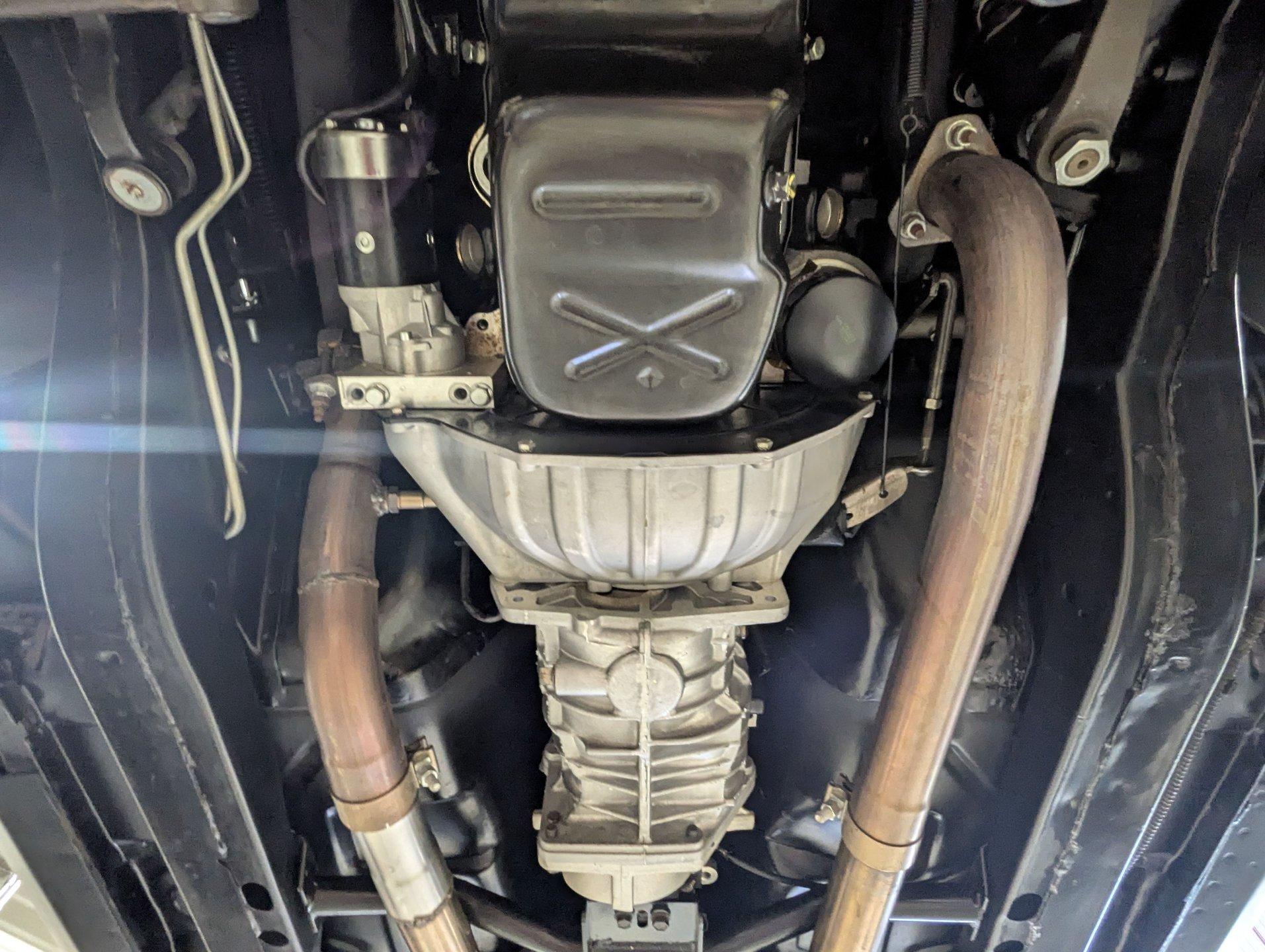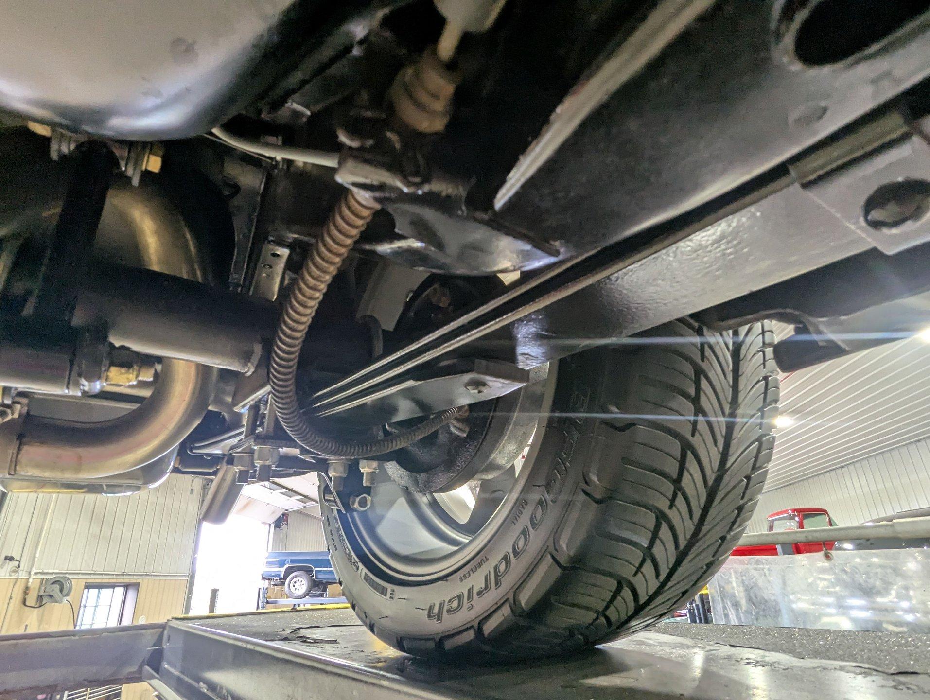 UNDERSIDE: The front end suspension is completely replaced and upgraded with CPP tubular upper and lower control arms, coilover adjustable gas shocks, and heavy duty swaybar. The steering components were all replaced. It has countersunk welded frame connectors and in back it has new springs, bushings, Bilstein shocks and a swaybar. New fuel system including the tank, sending unit and lines. The dual exhaust is stainless with a polished transverse muffler. The brakes were rebuilt. Upgraded with Wilwood drilled and slotted disc in front, all new braided hoses, lines and e-brake are hooked up. Looking up at the motor it still looks brand new, the GM part number tag is still attached and it has a high torque starter. Upgraded with a TKX Tremec 5-speed transmission and a new drive shaft leads back to the 10 bolt rear end. The floors look spotless, clean metal painted semi-gloss black. Everything underneath here looks fresh.
