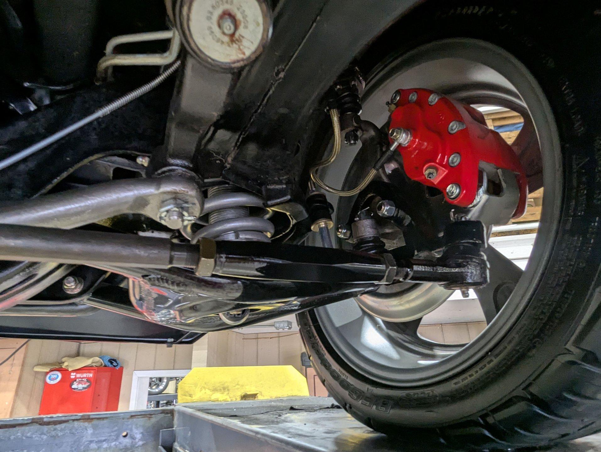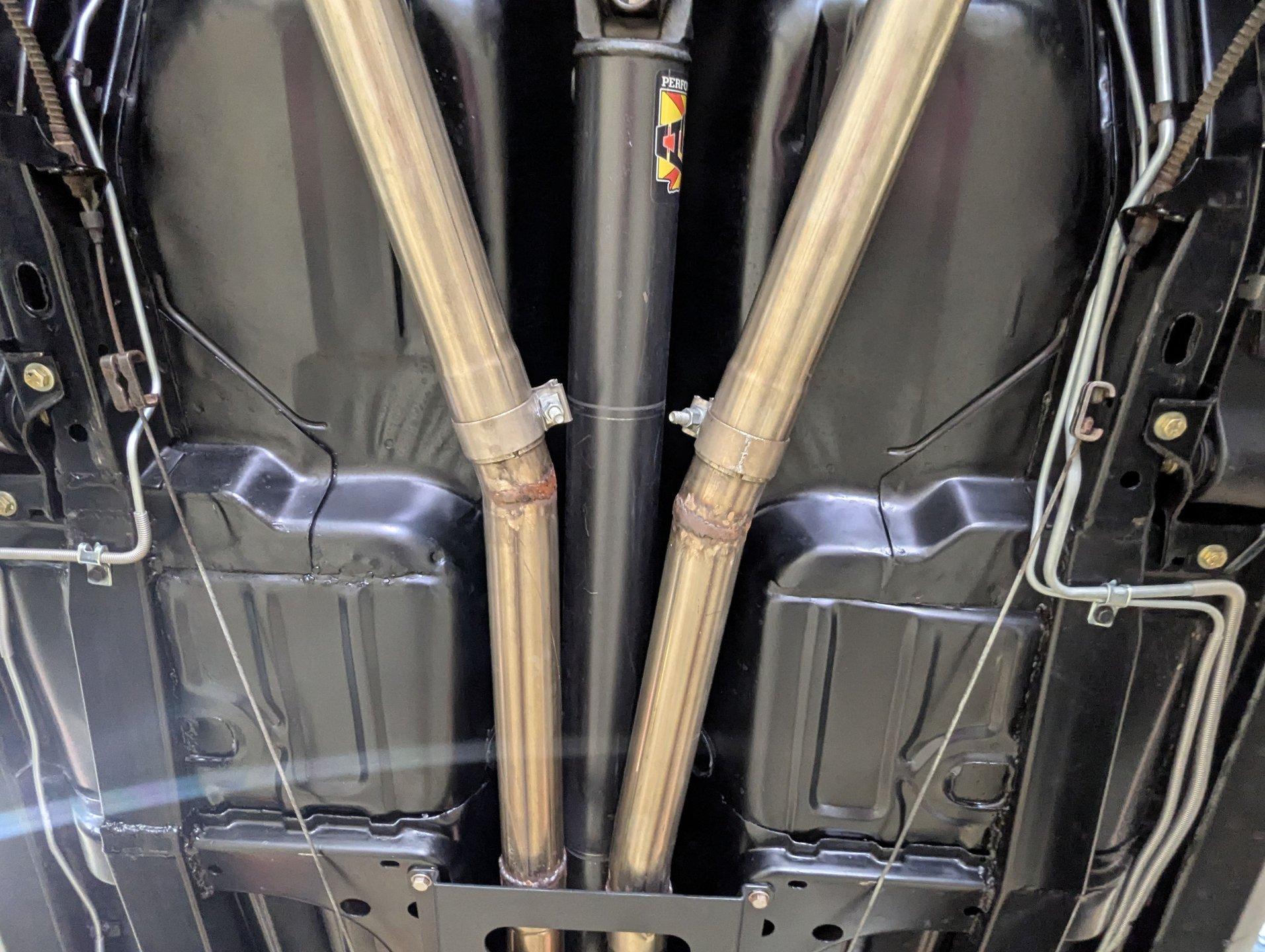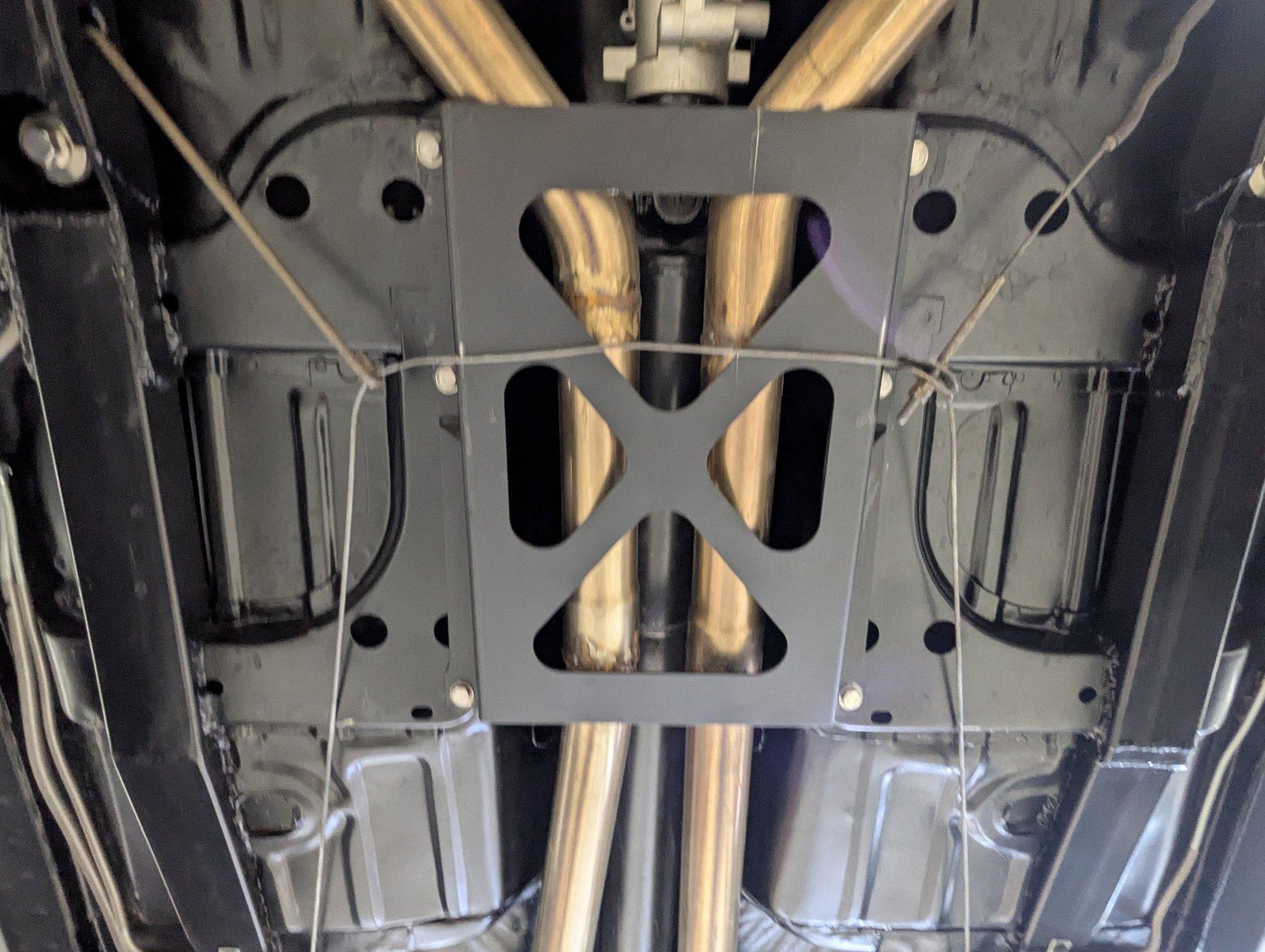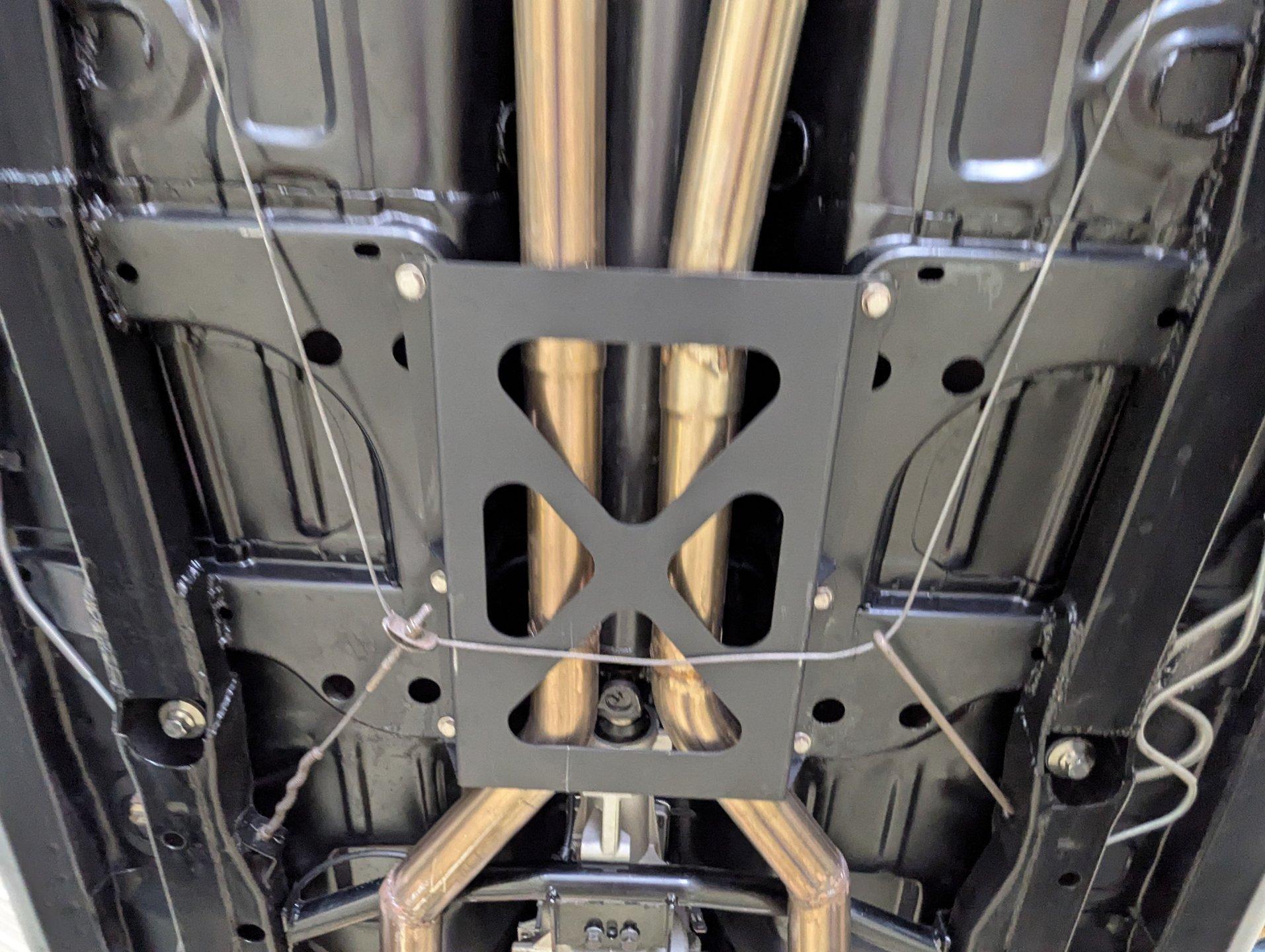 UNDERSIDE: The front end suspension is completely replaced and upgraded with CPP tubular upper and lower control arms, coilover adjustable gas shocks, and heavy duty swaybar. The steering components were all replaced. It has countersunk welded frame connectors and in back it has new springs, bushings, Bilstein shocks and a swaybar. New fuel system including the tank, sending unit and lines. The dual exhaust is stainless with a polished transverse muffler. The brakes were rebuilt. Upgraded with Wilwood drilled and slotted disc in front, all new braided hoses, lines and e-brake are hooked up. Looking up at the motor it still looks brand new, the GM part number tag is still attached and it has a high torque starter. Upgraded with a TKX Tremec 5-speed transmission and a new drive shaft leads back to the 10 bolt rear end. The floors look spotless, clean metal painted semi-gloss black. Everything underneath here looks fresh.