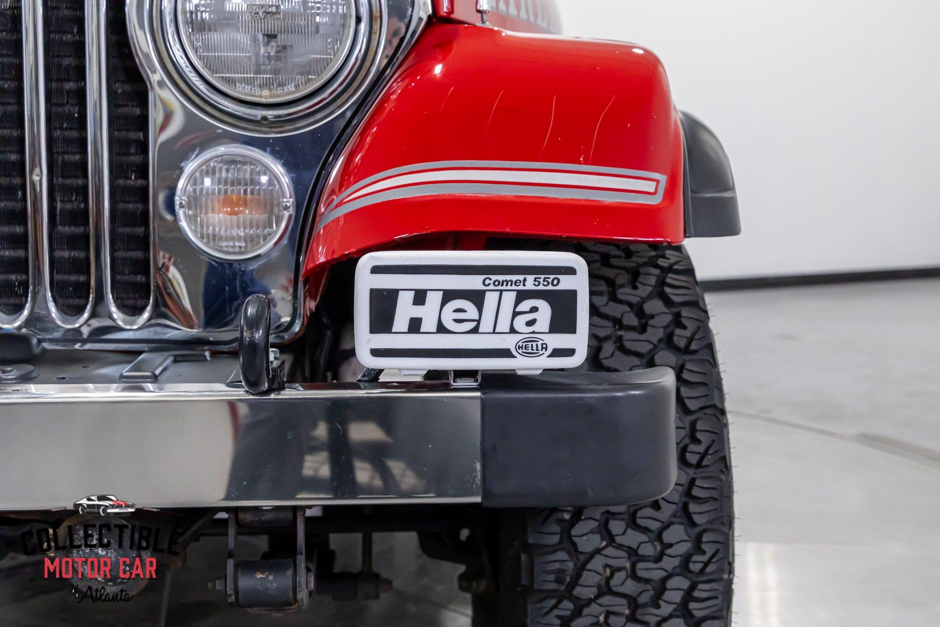 Up front, the Jeep has the classic CJ face with chrome grille surround, round headlights, and a set of Hella auxiliary lights mounted on the front bumper for added vintage off-road style. From every angle, this Jeep looks like what it is - a real CJ7 Laredo with honest presentation and unmistakable character.