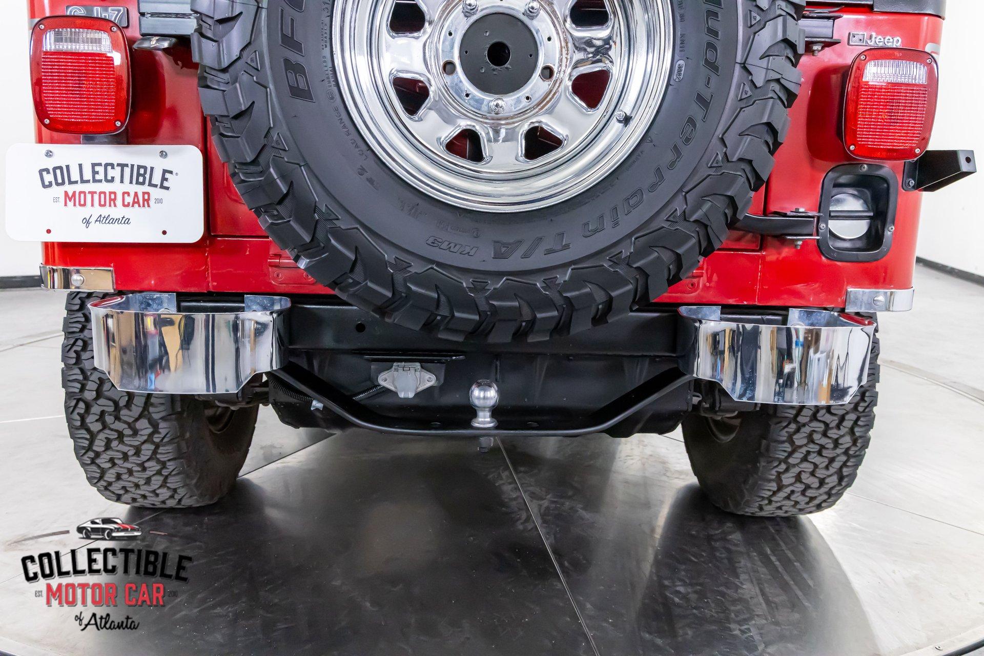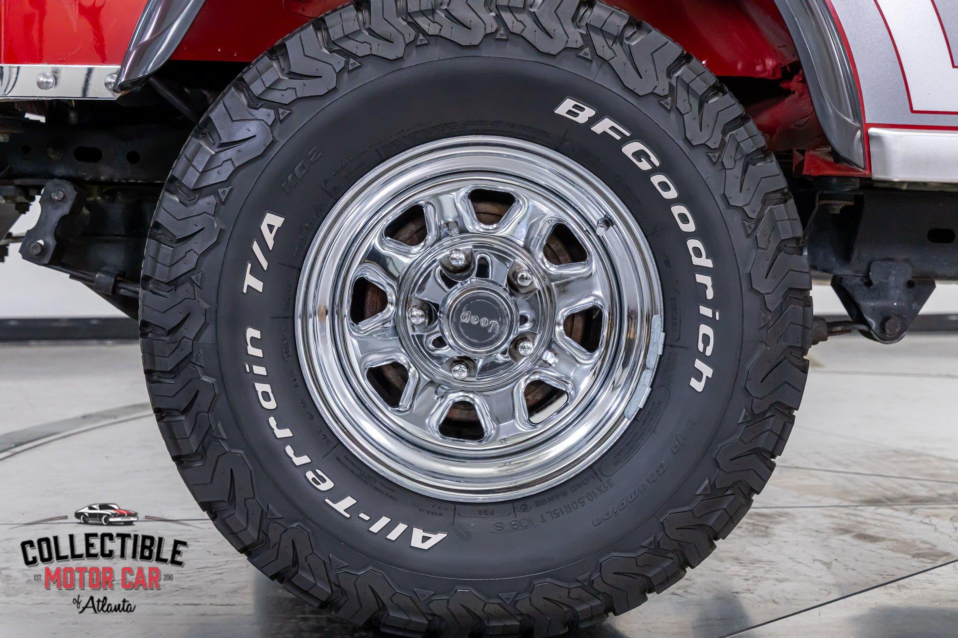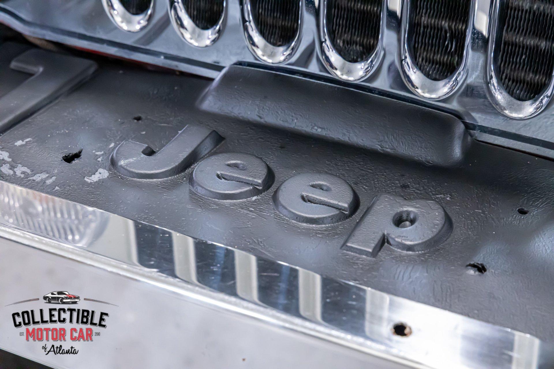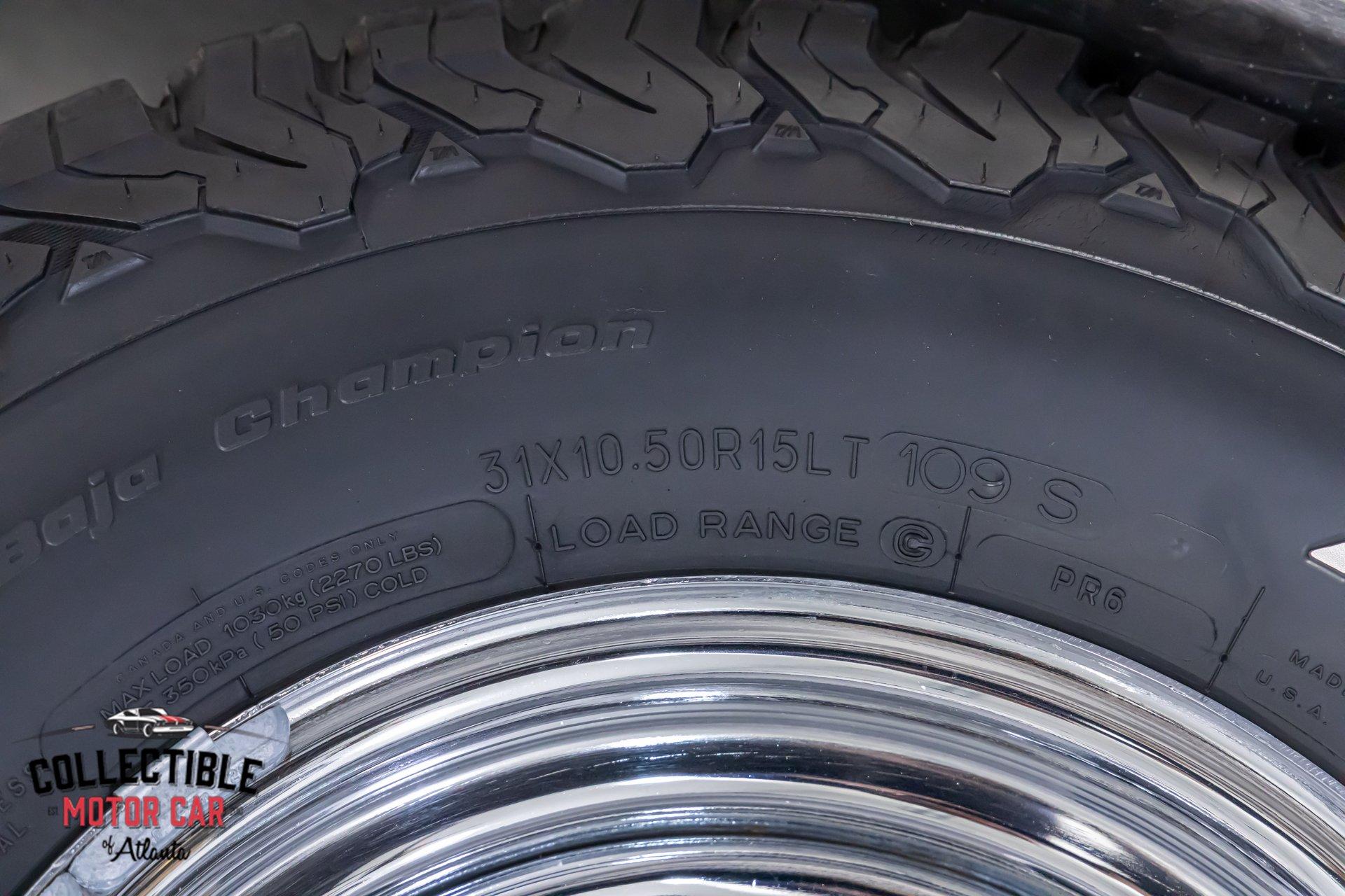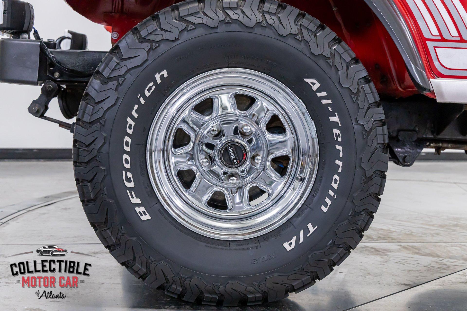This CJ sits right with the classic Jeep look enthusiasts want. It rides on polished Jeep wheels wrapped in BFGoodrich All-Terrain T/A tires sized: