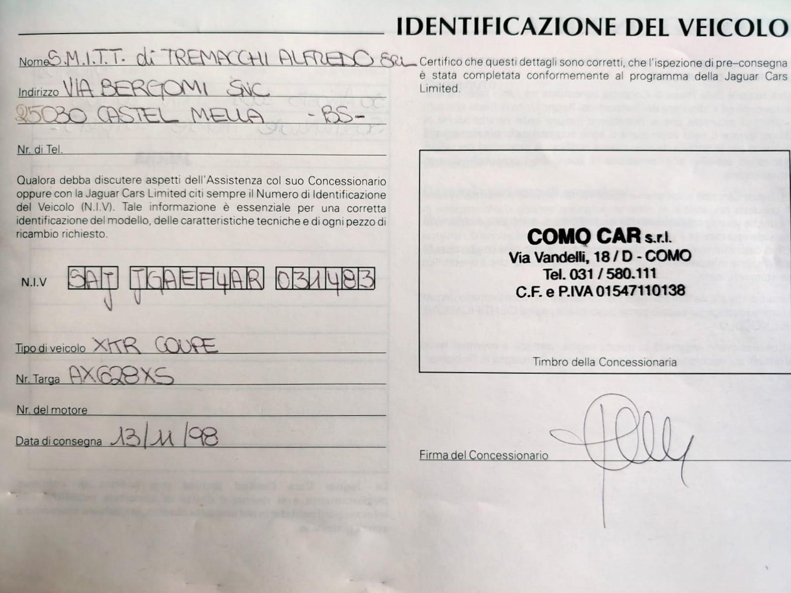 Sold new by the Jaguar dealership in Como on November 13, 1998, to its first and only owner, a prominent entrepreneur from Brescia. Although the car was registered to different companies within his group over the years for fiscal reasons, it remained his exclusive personal vehicle for over 25 years.