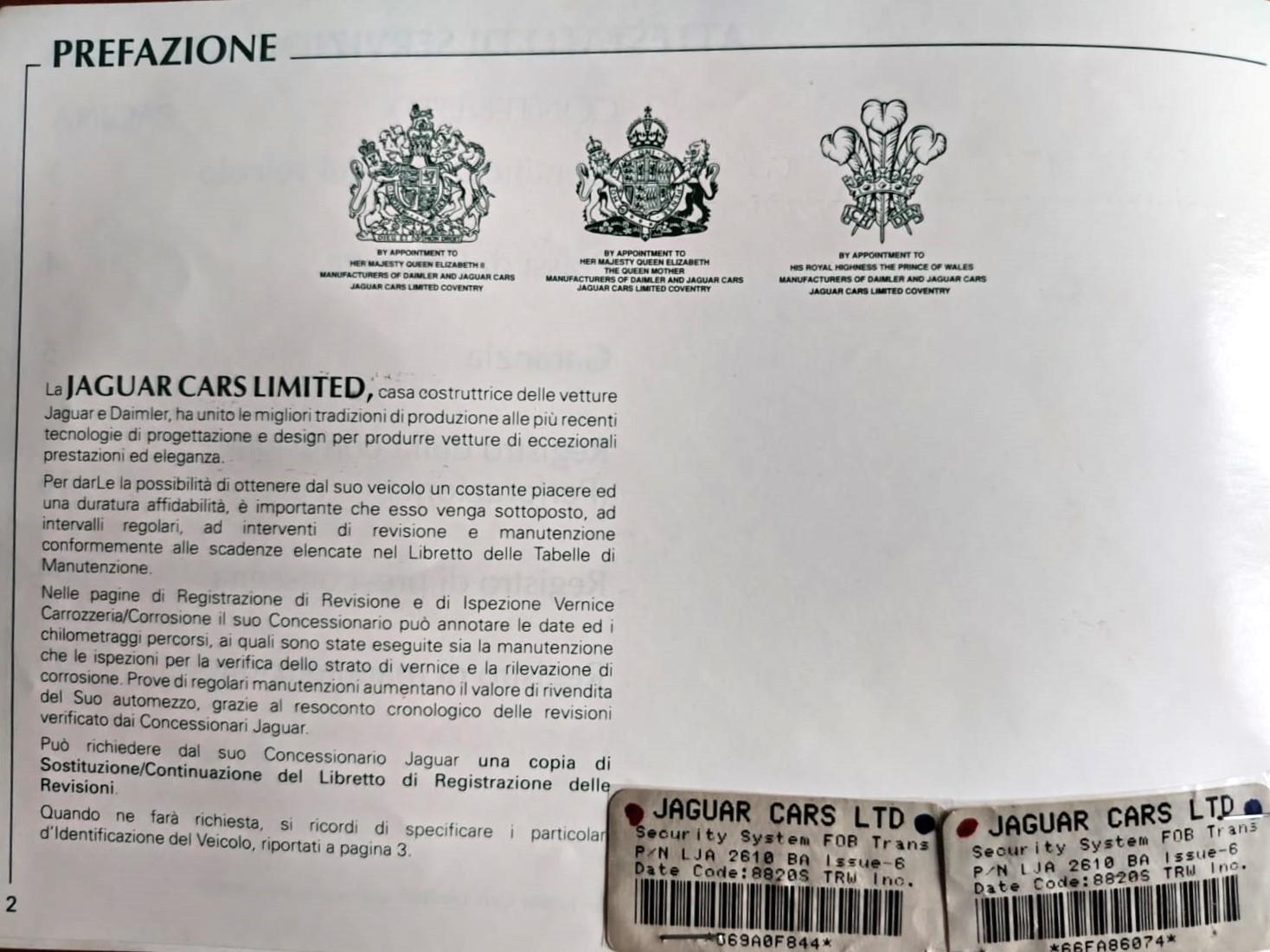 The car comes complete with its original service, maintenance, and warranty books, all housed in the original Jaguar leather wallet. It still retains its original 1998 license plates and registration document. It has been regularly submitted to biennial mandatory technical inspections (MOT/Revisione) throughout its life; the latest inspection is valid until September 2027.