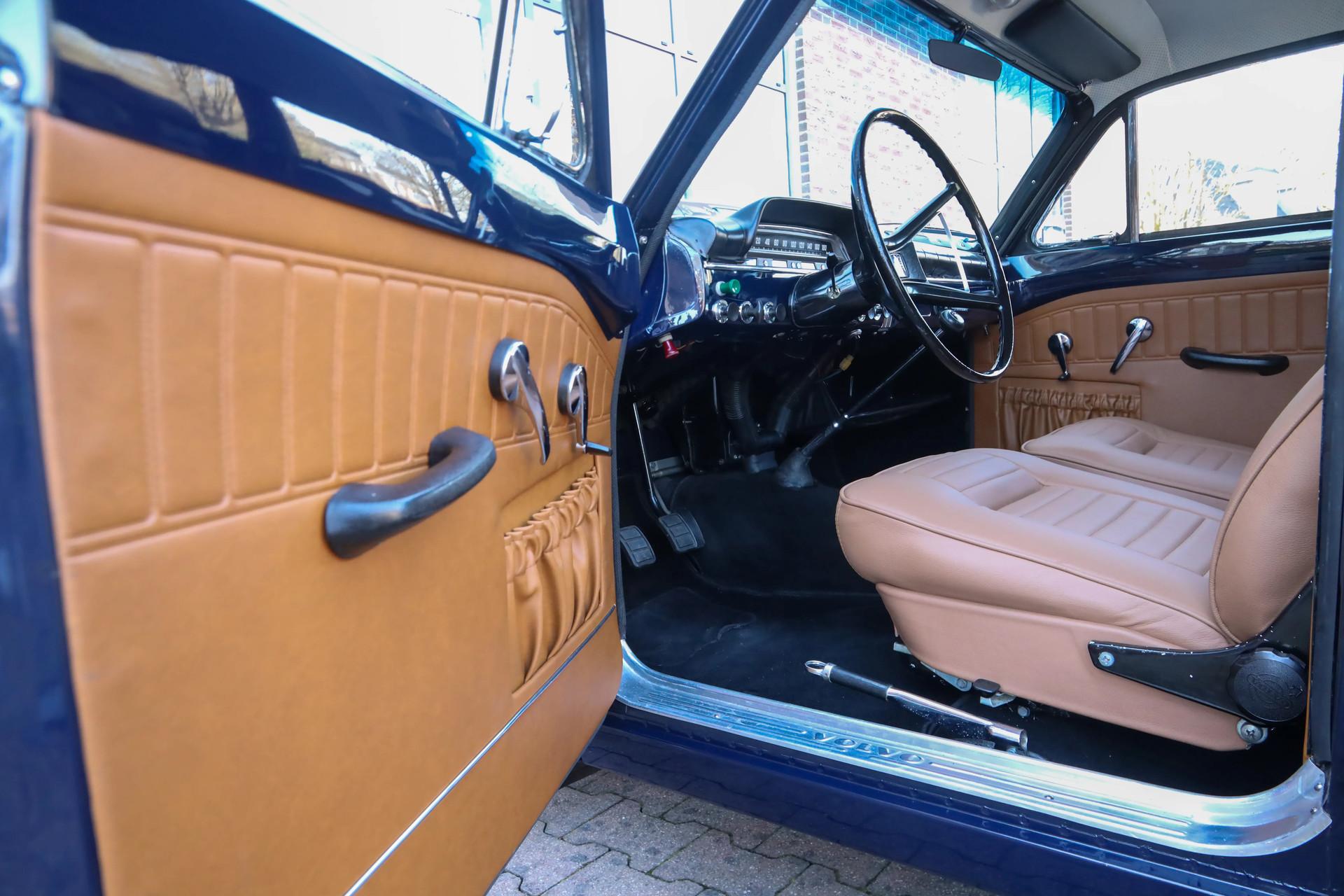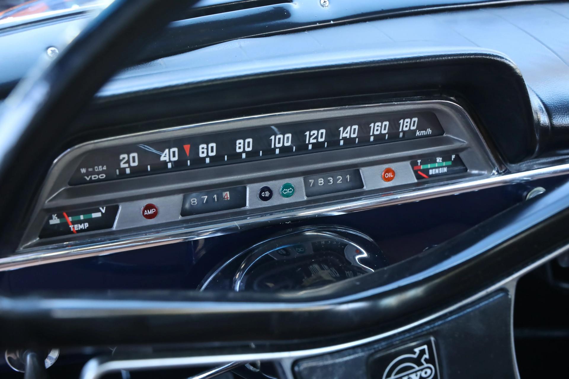 The interior of the car was completely reupholstered during the restoration. The colour scheme is a beautiful combination consisting of black carpets and red upholstery on the seats and rear seat. The seats have been refilled and not only look beautiful but also sit very well. The headliner is also in very good condition. The dashboard is an example of an understated and functional Swedish design and houses clearly legible instruments. The instruments and controls all function as they should and look neatly cared for.