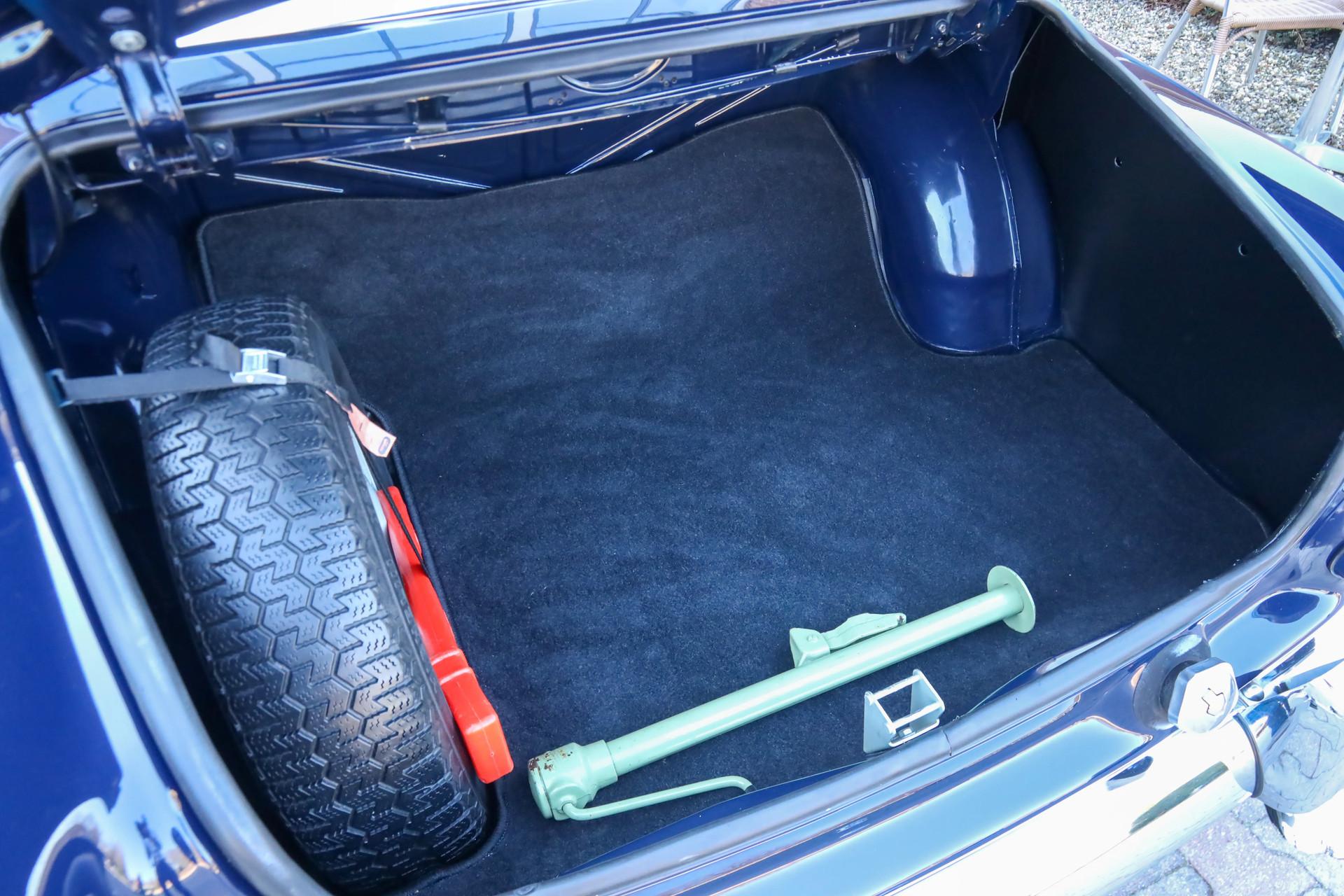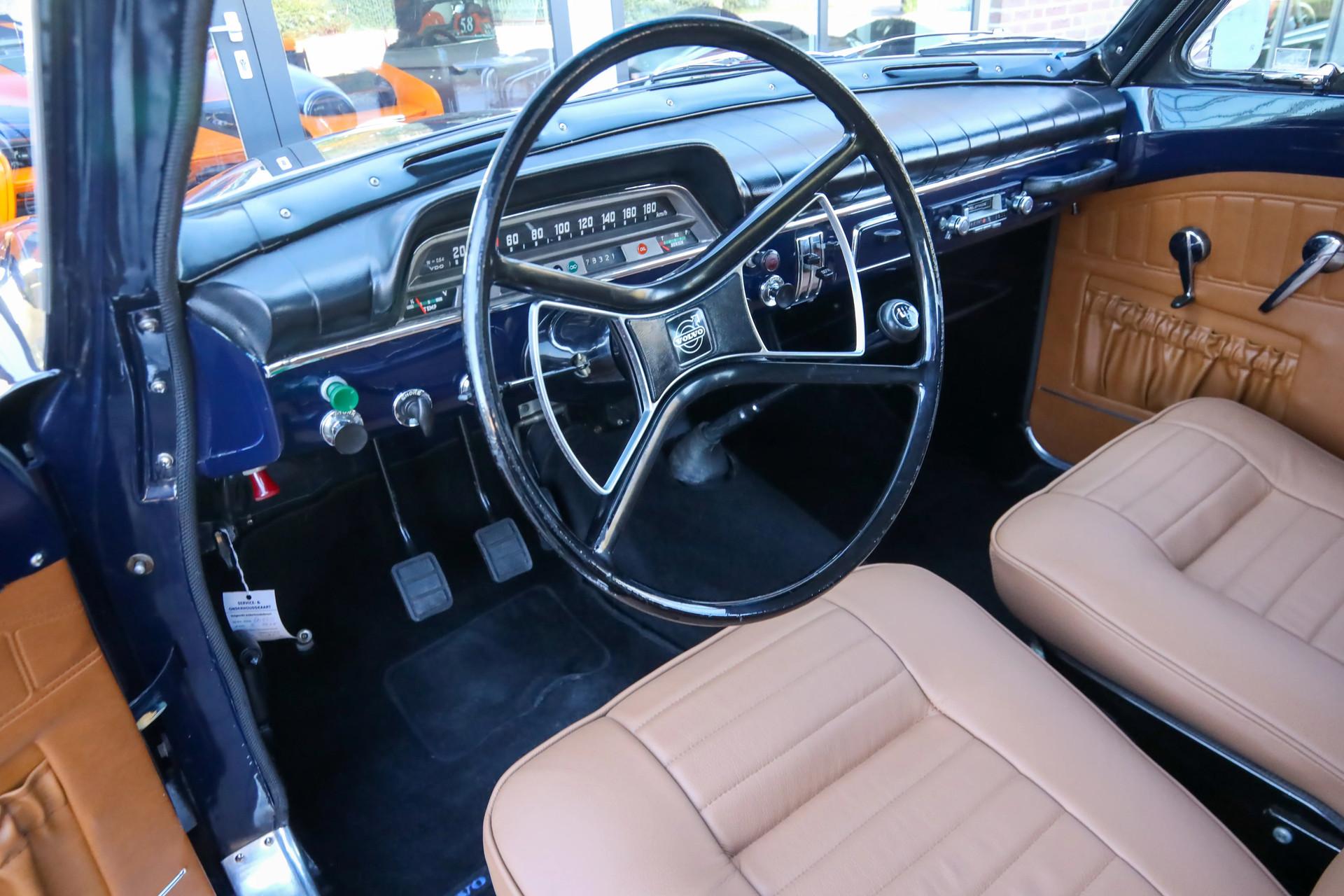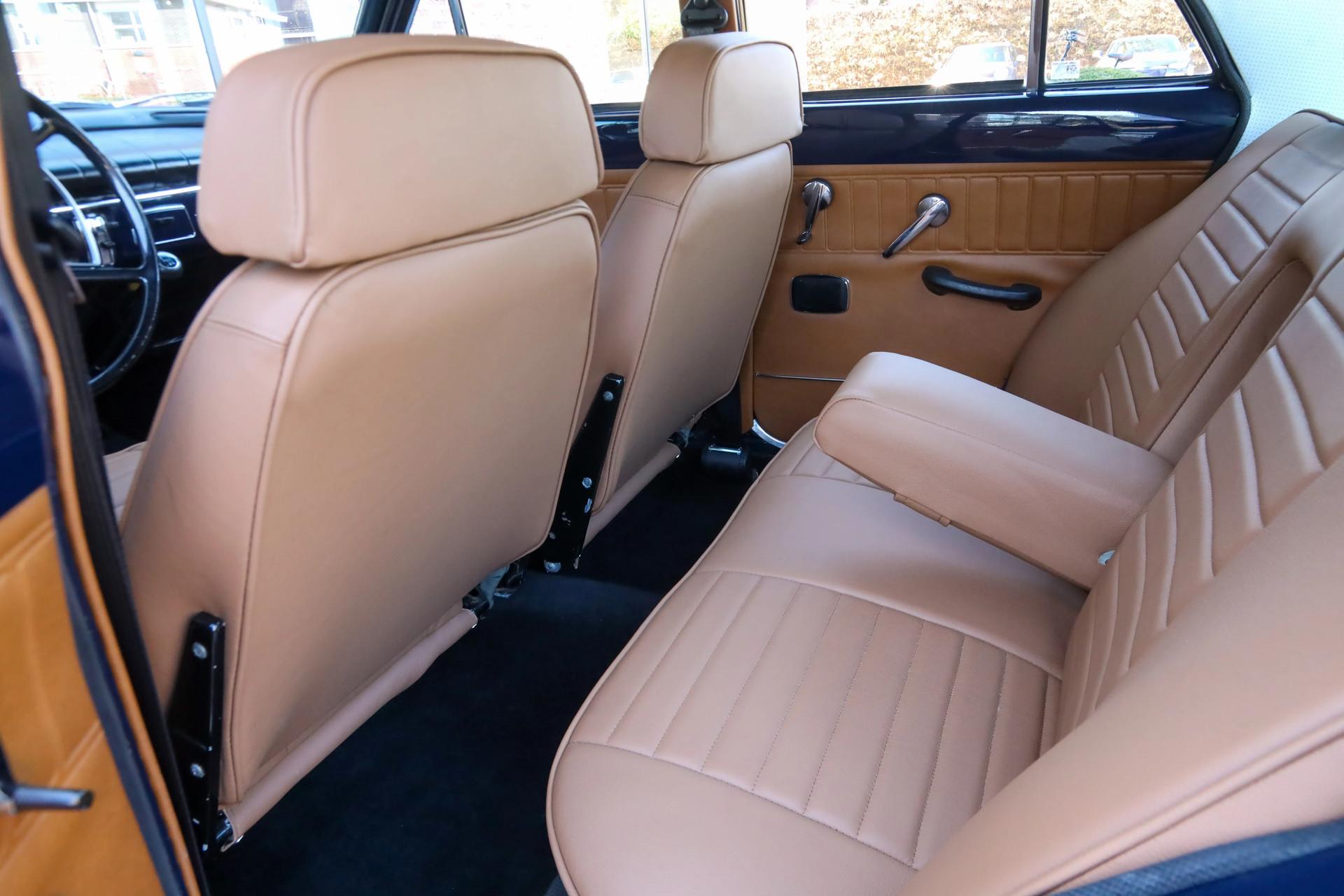 During the restoration, the car was completely reduced to bare metal. Where necessary, the sheet metal was repaired and the underside of the car was also completely stripped and later painted in the colour of the car. The body of the car, therefore, looks beautiful. The sheet metal is nice and thin everywhere and the fits are correct. The mouldings were all renewed during the restoration, as were the window and door rubbers. The car was repainted in its original colour. The dark blue paint has been well sprayed and has a beautiful shine. The car stands on original steel wheels surrounded by good tires in the correct sizes. The rims are fitted with beautifully chromed hubcaps. The bumpers were re-chromed during the restoration and the lighting also looks beautiful.