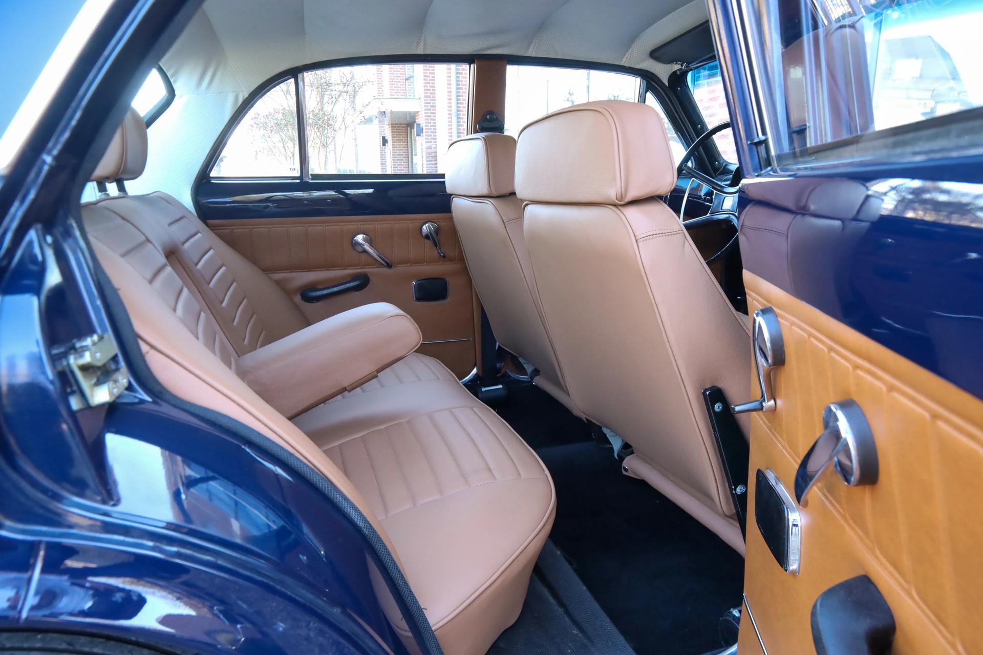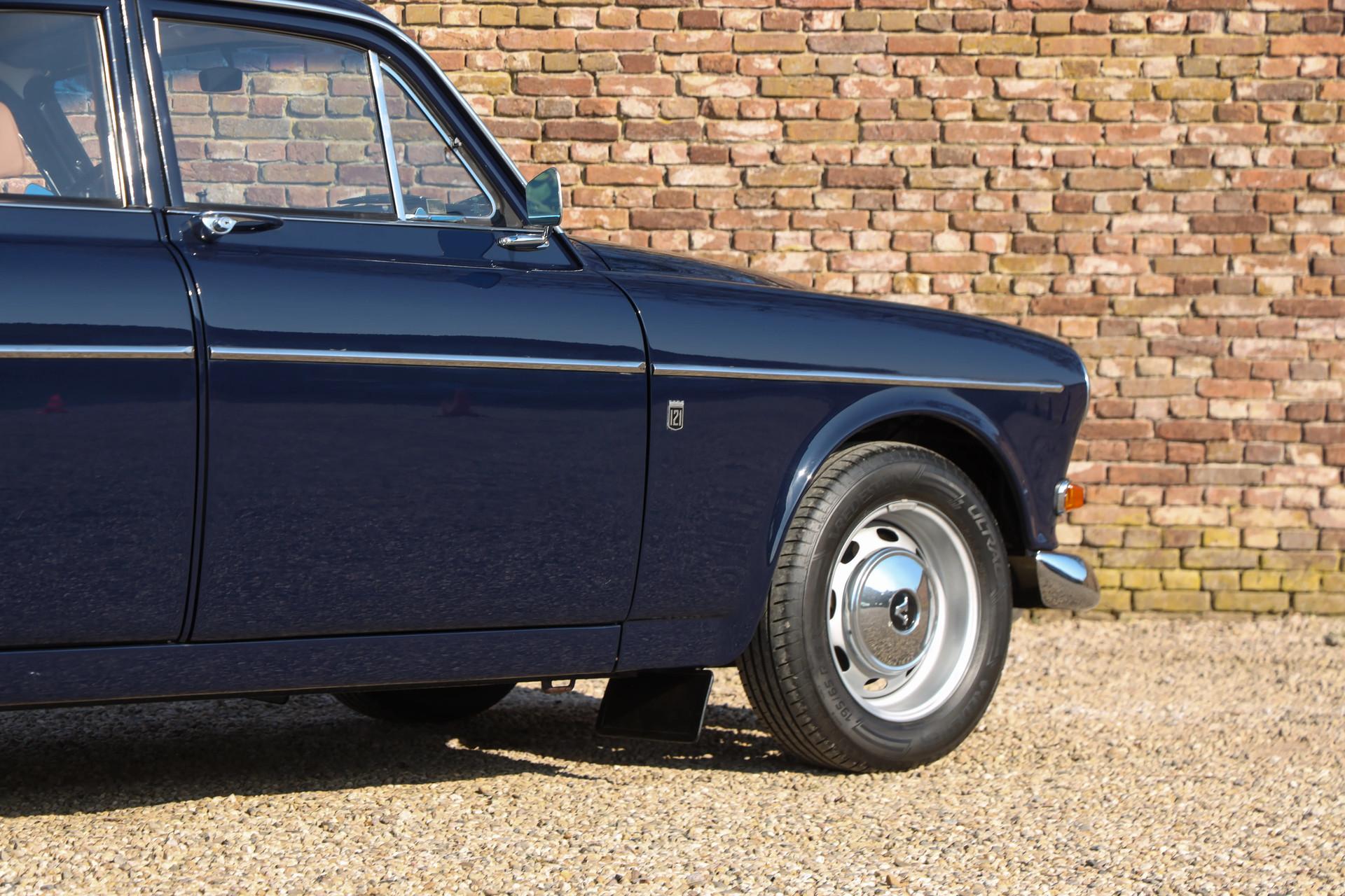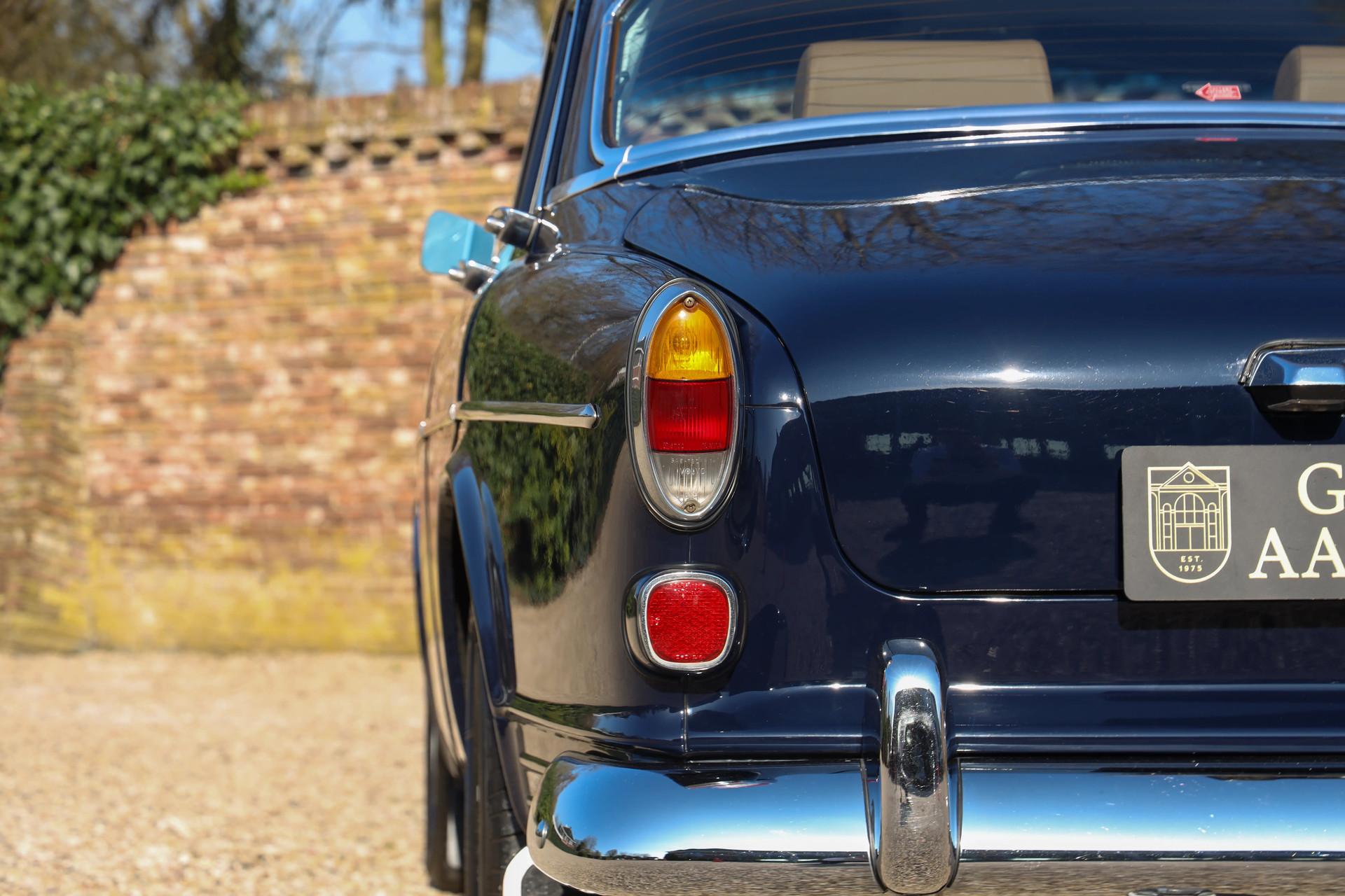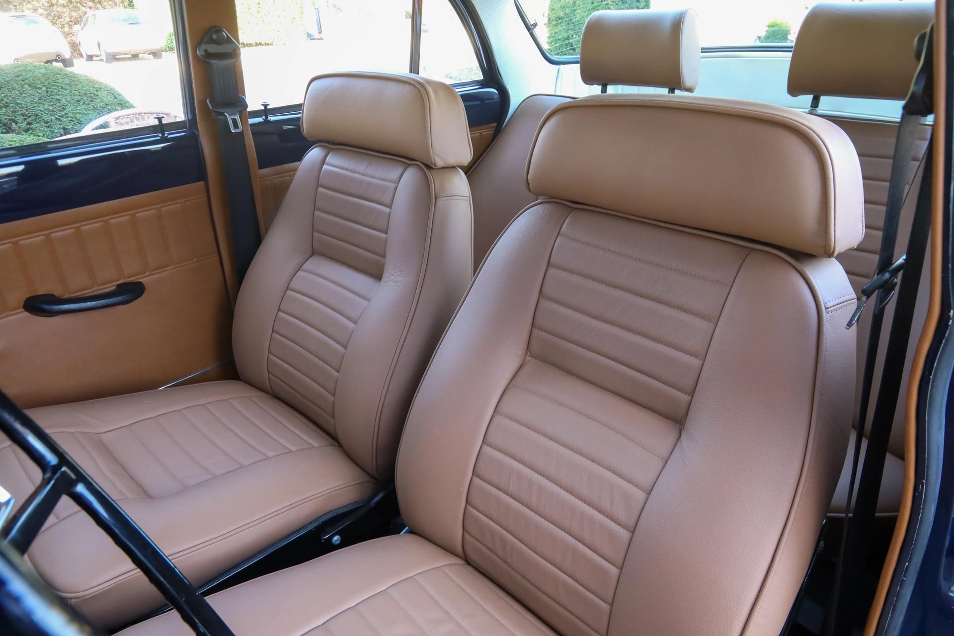 During the restoration, the car was completely reduced to bare metal. Where necessary, the sheet metal was repaired and the underside of the car was also completely stripped and later painted in the colour of the car. The body of the car, therefore, looks beautiful. The sheet metal is nice and thin everywhere and the fits are correct. The mouldings were all renewed during the restoration, as were the window and door rubbers. The car was repainted in its original colour. The dark blue paint has been well sprayed and has a beautiful shine. The car stands on original steel wheels surrounded by good tires in the correct sizes. The rims are fitted with beautifully chromed hubcaps. The bumpers were re-chromed during the restoration and the lighting also looks beautiful.