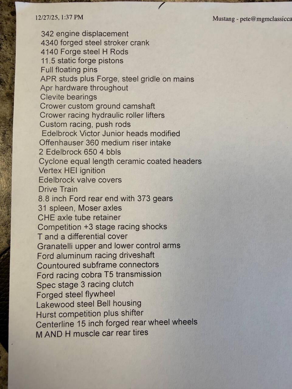 1984 Ford Mustang The Instigator Built 342 Stroker Engine 342 CID Stroker (5.6L) Bottom End 342 cubic inch displacement (stroked 302 platform) 4340 forged steel stroker crank 4140 forged steel H-beam rods 11.5:1 static compression forged pistons Full floating wrist pins APR studs throughout Forged steel main girdle Clevite performance bearings Valvetrain Crower custom-ground camshaft Crower racing hydraulic roller lifters Custom racing pushrods Top End / Induction Edelbrock Victor Jr. heads (modified) Offenhauser 360 medium riser intake Dual Edelbrock 650 CFM 4-barrel carburetors Cyclone equal-length ceramic coated headers Vertex HEI ignition Edelbrock valve covers With 11.5:1 compression and dual quads, this combination is clearly tuned for high-octane fuel and aggressive cam timing. Depending on cam specs and tuning, a build like this typically produces 450500+ horsepower naturally aspirated in a lightweight Fox Body. Drivetrain Ford 8.8\ rear end 3.73 gears 31-spline Moser axles CHE axle tube retainers T/A differential cover Granatelli upper & lower control arms Competition +3 stage racing shocks Contoured subframe connectors Ford aluminum racing driveshaft Ford Racing Cobra T5 transmission SPEC Stage 3 racing clutch Forged steel flywheel Lakewood steel bellhousing Hurst Competition Plus shifter 3.73 gears + T5 + 342 stroker = extremely aggressive acceleration, especially with sticky tires. Wheels & Tires Centerline 15\ forged rear wheels M&H Muscle Car rear tires Classic drag-style setup lightweight wheels and serious rear bite. Overall Character of The Instigator This is a: High-compression naturally aspirated stroker Dual-quad carb street/strip build Reinforced drivetrain for hard launches Traditional hot-rod style Fox Body It?s built to: Hook hard Rev strong Sound absolutely vicious Run mid-to-low 11s (potentially quicker depending on weight and tuning Financing & Delivery is available!