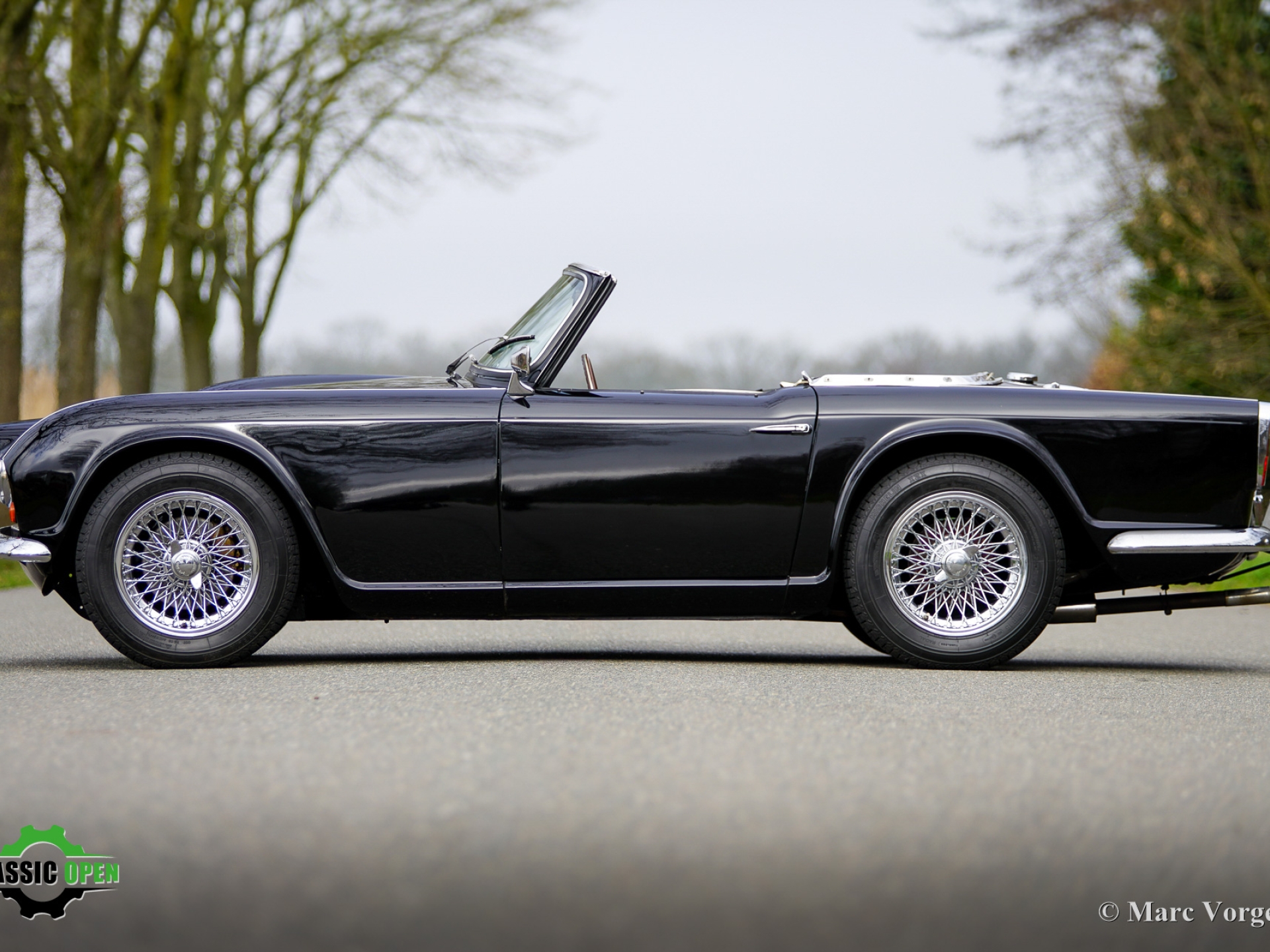This magnificent Triumph TR4 is finished in an elegant black on black colour scheme, featuring a black body, black faux leather interior and matching black carpeting.