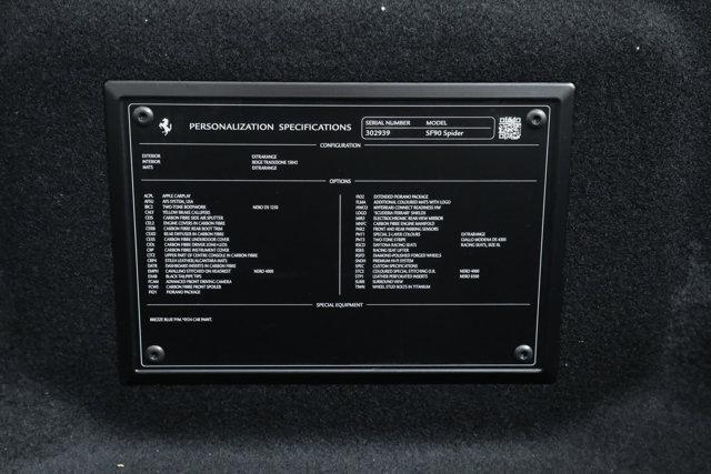 Ferrari SF90 Spider Assetto Fiorano- $843,273 MSRP - NEARLY $267,000 IN OPTIONAL EQUIPMENT -- FERRARI CERTIFIED PRE-OWNED - AVAILABLE EXTENDED FERRARI WARRANTY -- Blu Brezze over Beige - ONE OWNER - Very Low Miles - Pristine Condition - Many Fine Options - Sold as New by Our Dealership - Expertly Maintained by Our Factory Trained Technicians - Ferrari Factory Warranty to 3/7/27 - Complimentary Ferrari Genuine Maintenance Service to 3/7/31 -Factory Options:- Fiorano Package- Special 2-Layer Paint Color- Two-Tone Bodywork- Two-Tone Racing Stripe in Giallo Modena and Argento Nurburgring- Carbon Fiber Front Spoiler- Carbon Fiber Side Air Splitters- Carbon Fiber Engine Manifold- Carbon Fiber Engine Covers- Carbon Fiber Rear Boot Trim- Carbon Fiber Rear Diffuser- Carbon Fiber Underdoor Covers- Carbon Fiber Driver Zone with LED Steering Wheel- Carbon Fiber Dashboard Inserts- Carbon Fiber Instrument Cover- Carbon Fiber Upper Center Console- Carbon Fiber Daytona Racing Seats- Diamond-Polished Forged Wheels- Titanium Wheel Bolts- Yellow Brake Calipers- Scuderia Ferrari Shields- Racing Seat Lifter- Daytona Seat Perforated Inserts in Nero- Cavallino Stitched to Headrests in Nero- Special Stitching in Nero- Leather and Alcantara Floor Mats in Nero- Premium HiFi Sound System- Apple CarPlay- Surround View- Advanced Frontlight System (AFS)- Advanced Front Driving Camera- Electrochromic Rearview Mirror- Front and Rear Parking Sensors- Black Tailpipe TipsThis Ferrari has passed a multi-point inspection performed by our factory trained technicians, and has been enrolled in the Ferrari Approved Certified Pre-Owned Program. The Certified program makes available up to two years of additional Ferrari Power Approved Warranty coverage. Please see dealer for more details.