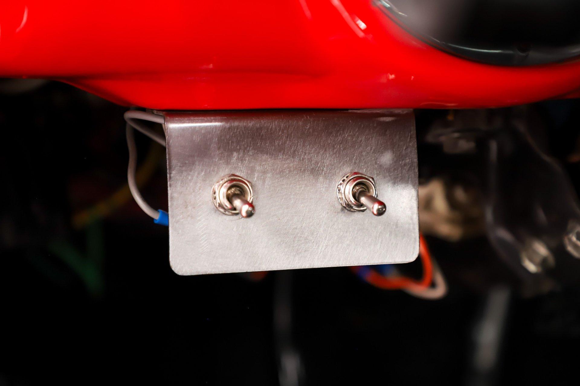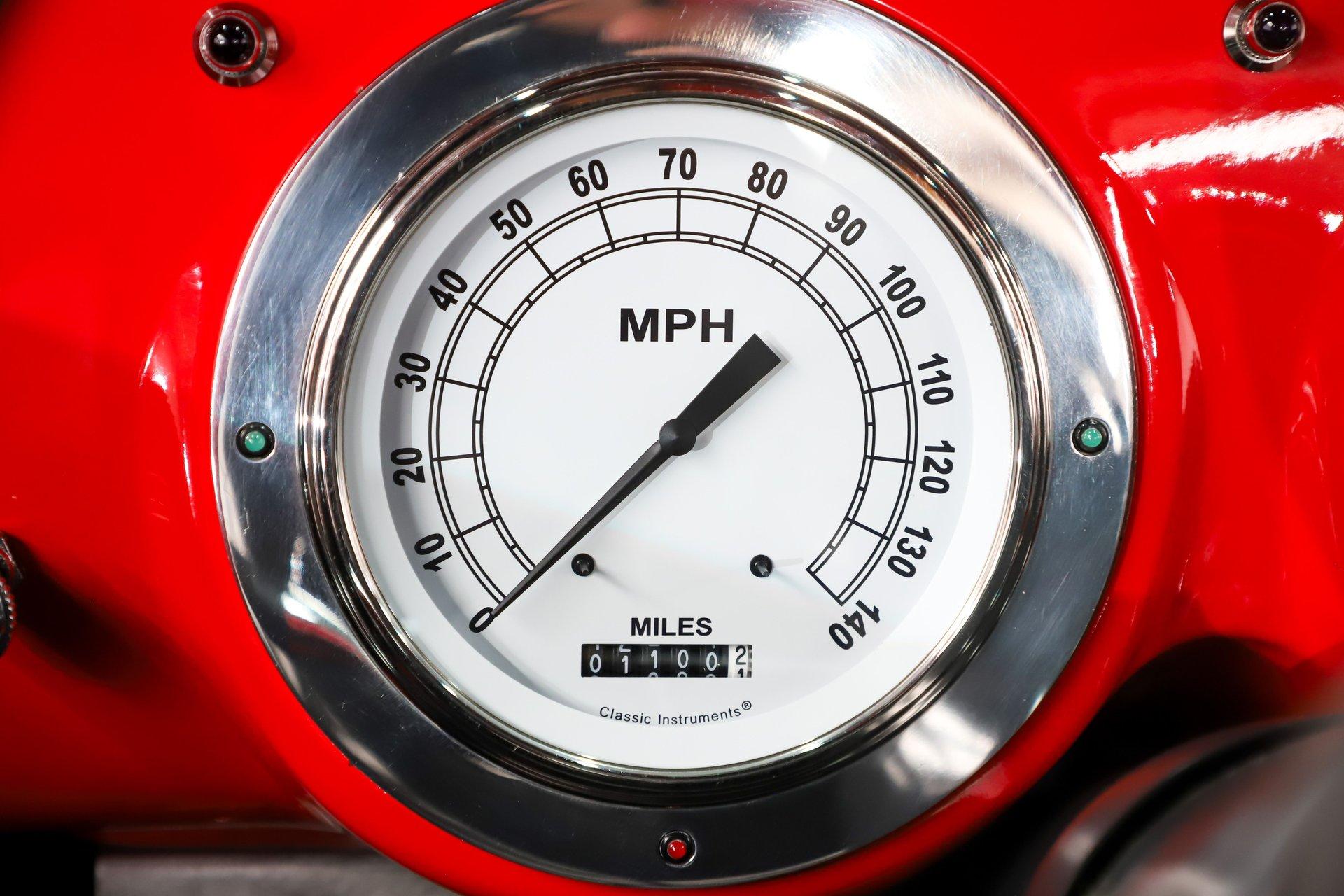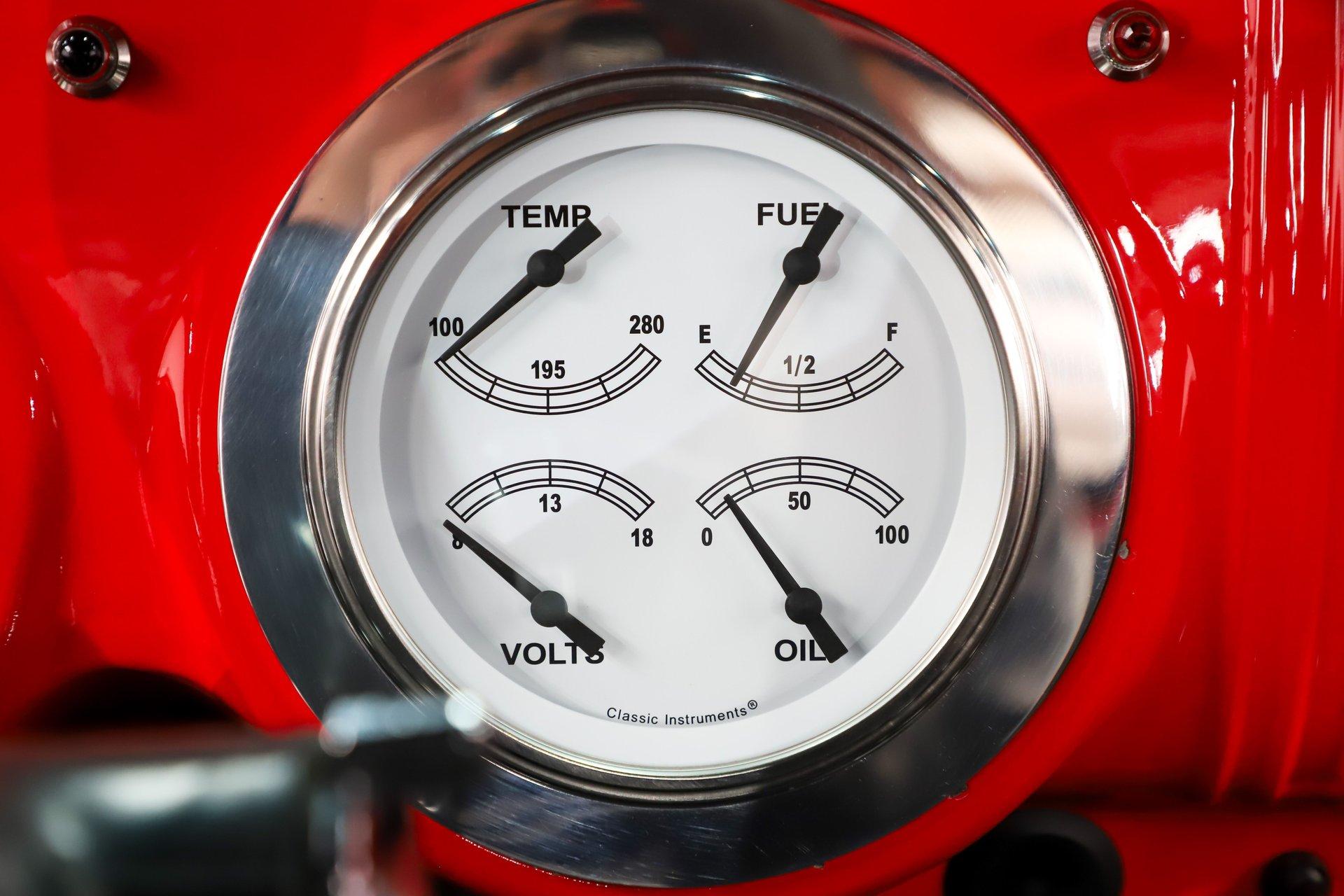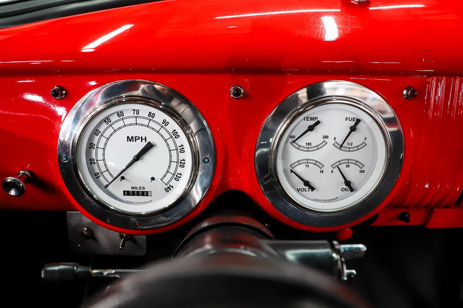 INTERIOR: It was gutted and painted red. It went back together with a 20 circuit Summit Racing fuse box. It also has a 1936 Chevy cabin heater with defrost. The door panels and headliner were replaced. Seat was reupholstered, carpet put on the floor. It also has Lokar shifter and chrome e-brake handle on the floor. Behind the tilt wheel is a set of white face gauges.