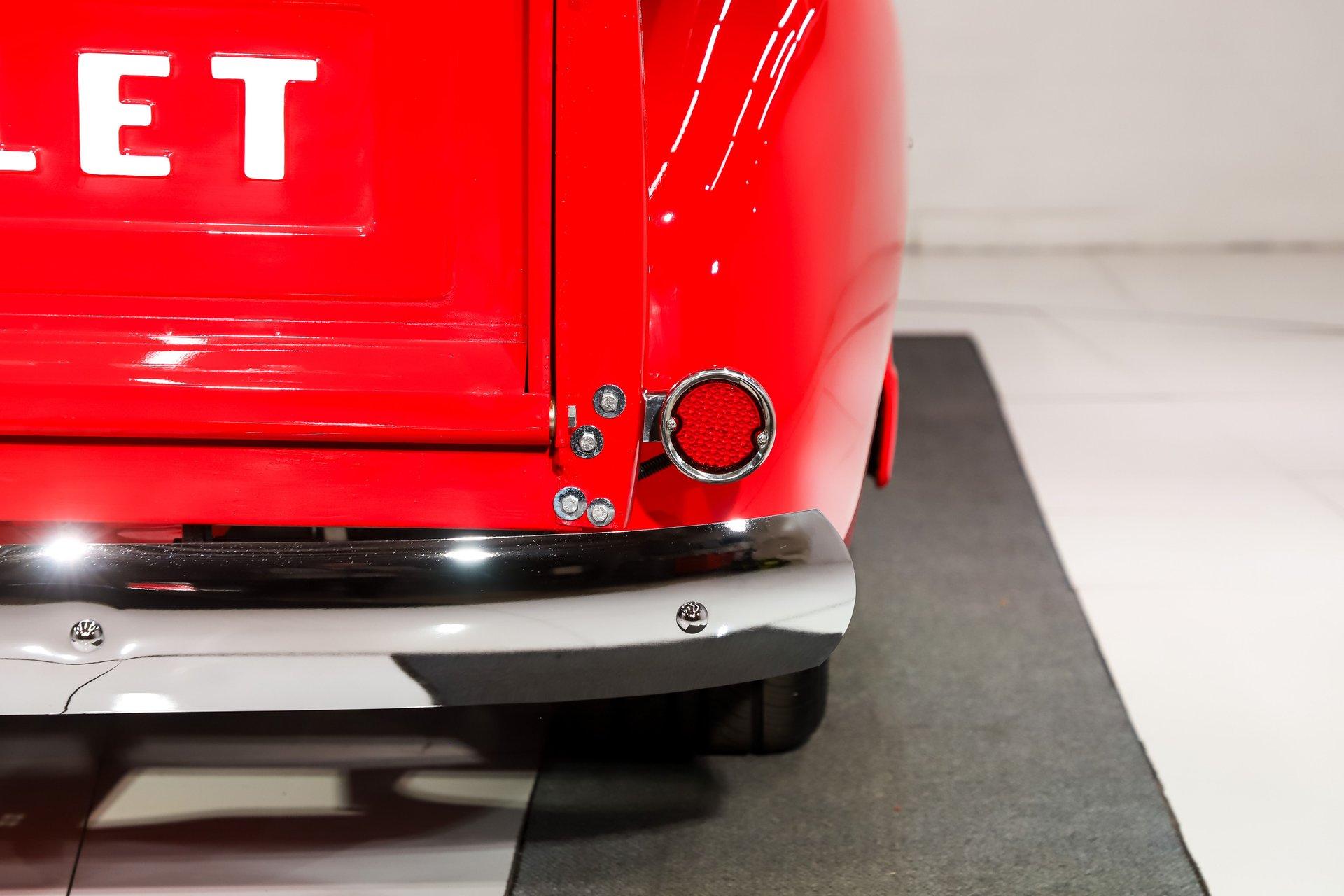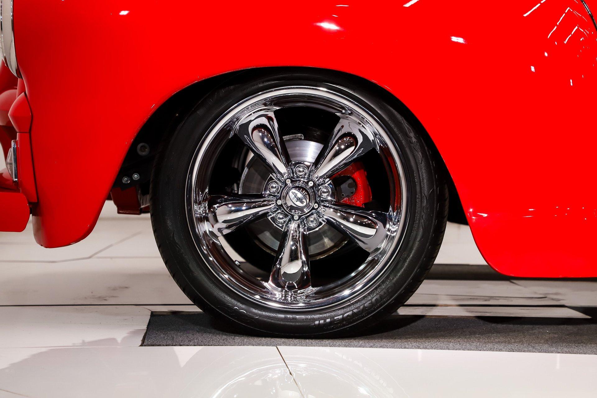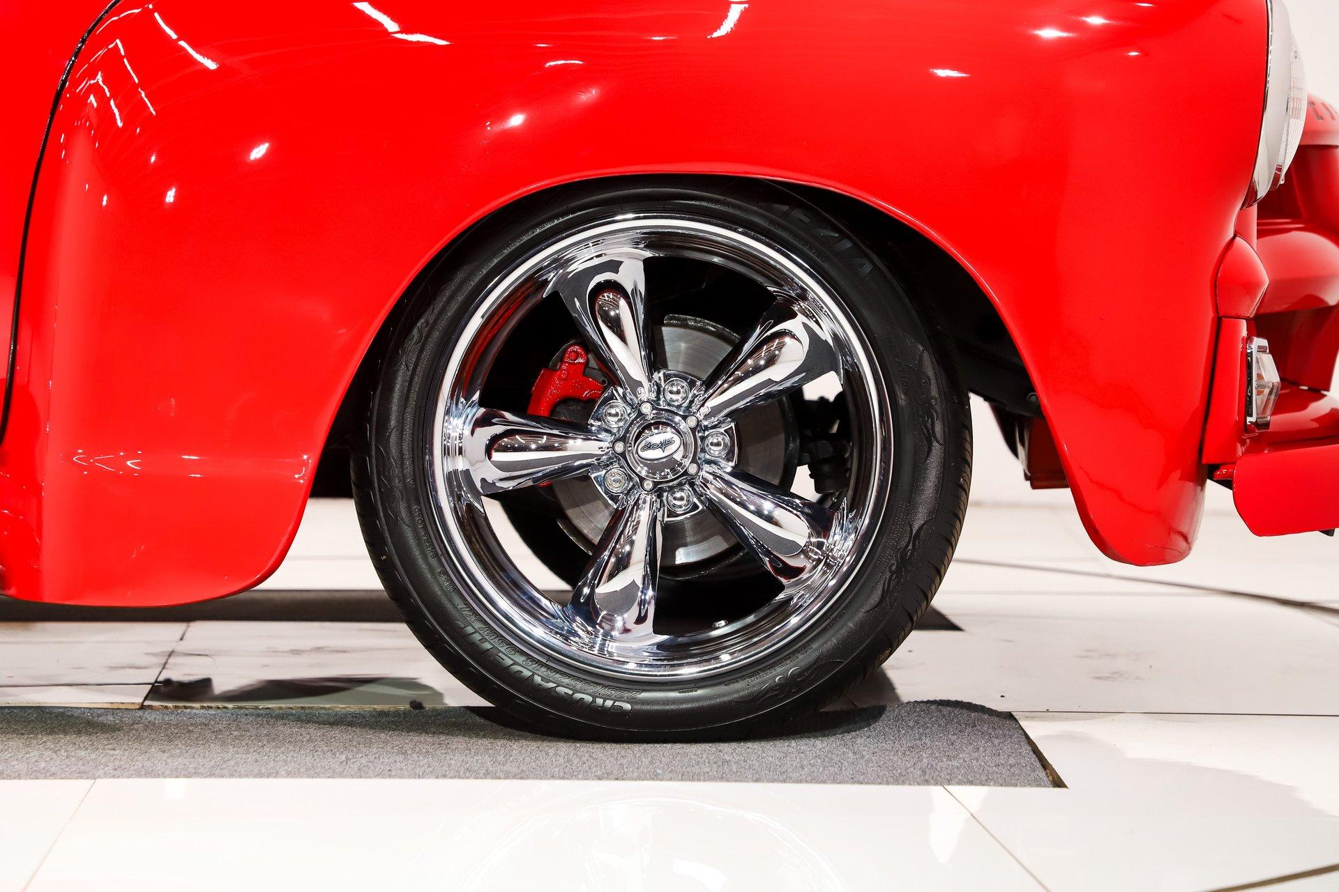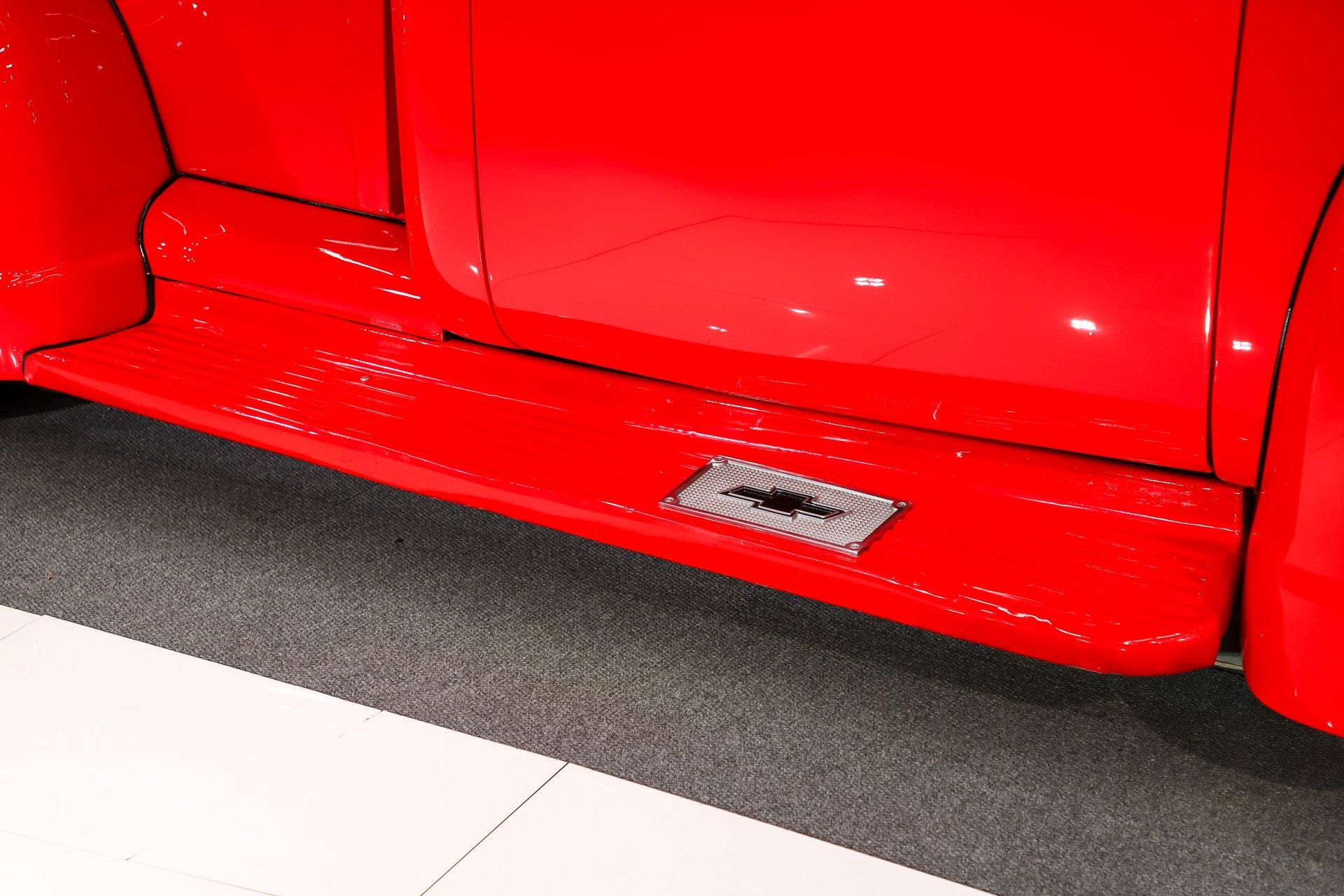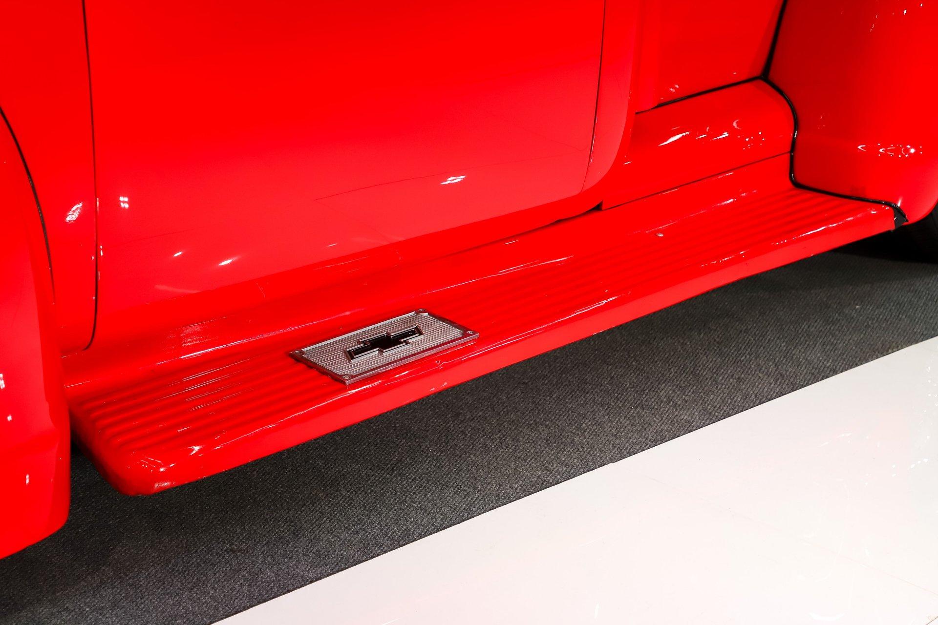 EXTERIOR: The color, stance and wheels gets this truck noticed. All metal body and fenders. It is straight, I did not find any damage or rust in my inspection. It looks like it was dipped in red nail polish with a smooth glossy bright red finish. The vent windows were removed for a cleaner look. All the glass and gaskets were replaced. Newport Speed electric wiper system. It has deluxe chrome trim around the door windows. The emblems, handles, mirrors and rear bumper look new. It has Chevrolet step plates on the running boards. LED tailights in back. It is lowered and sitting on a big set of chrome Coys wheels wrapped in performance tires.