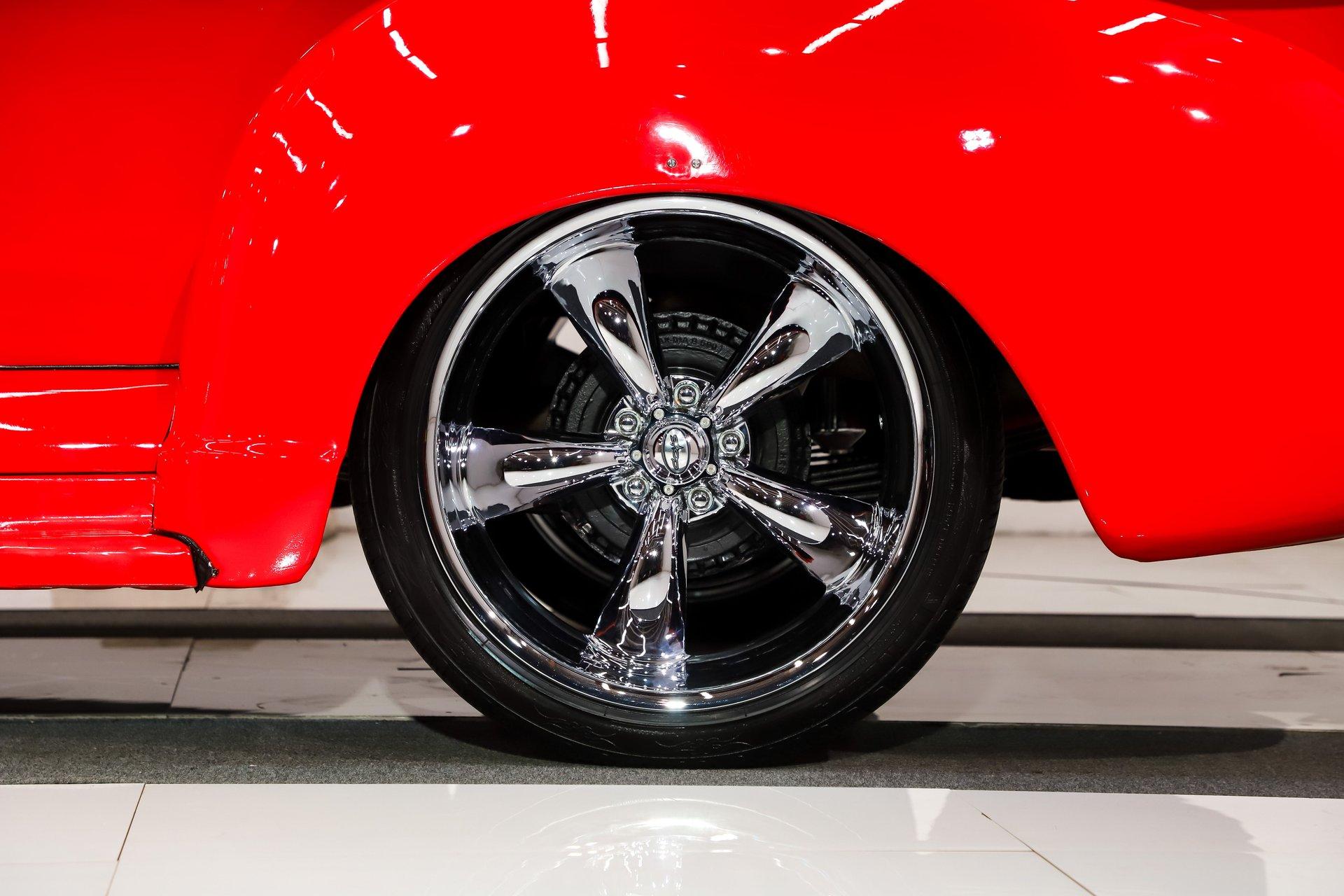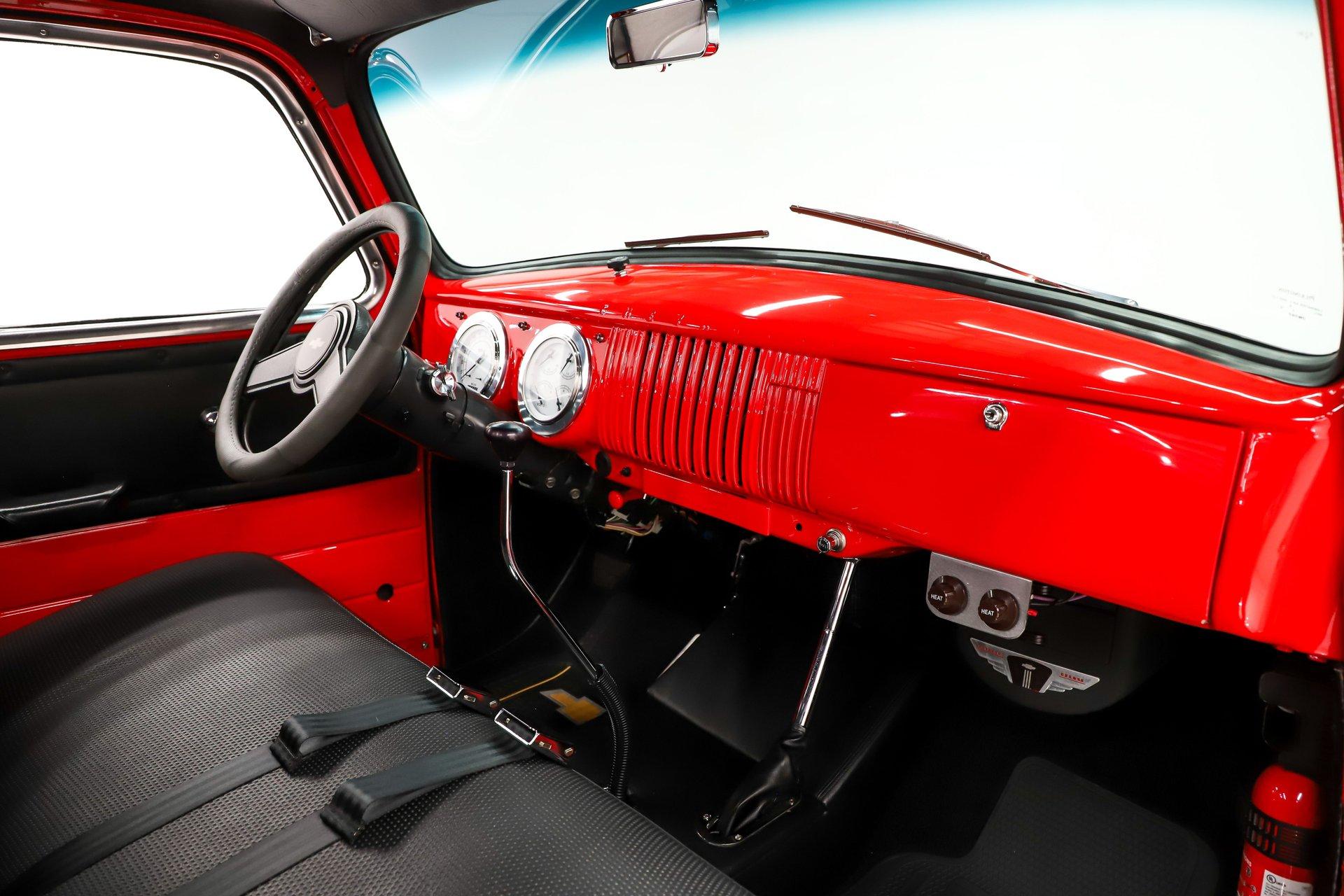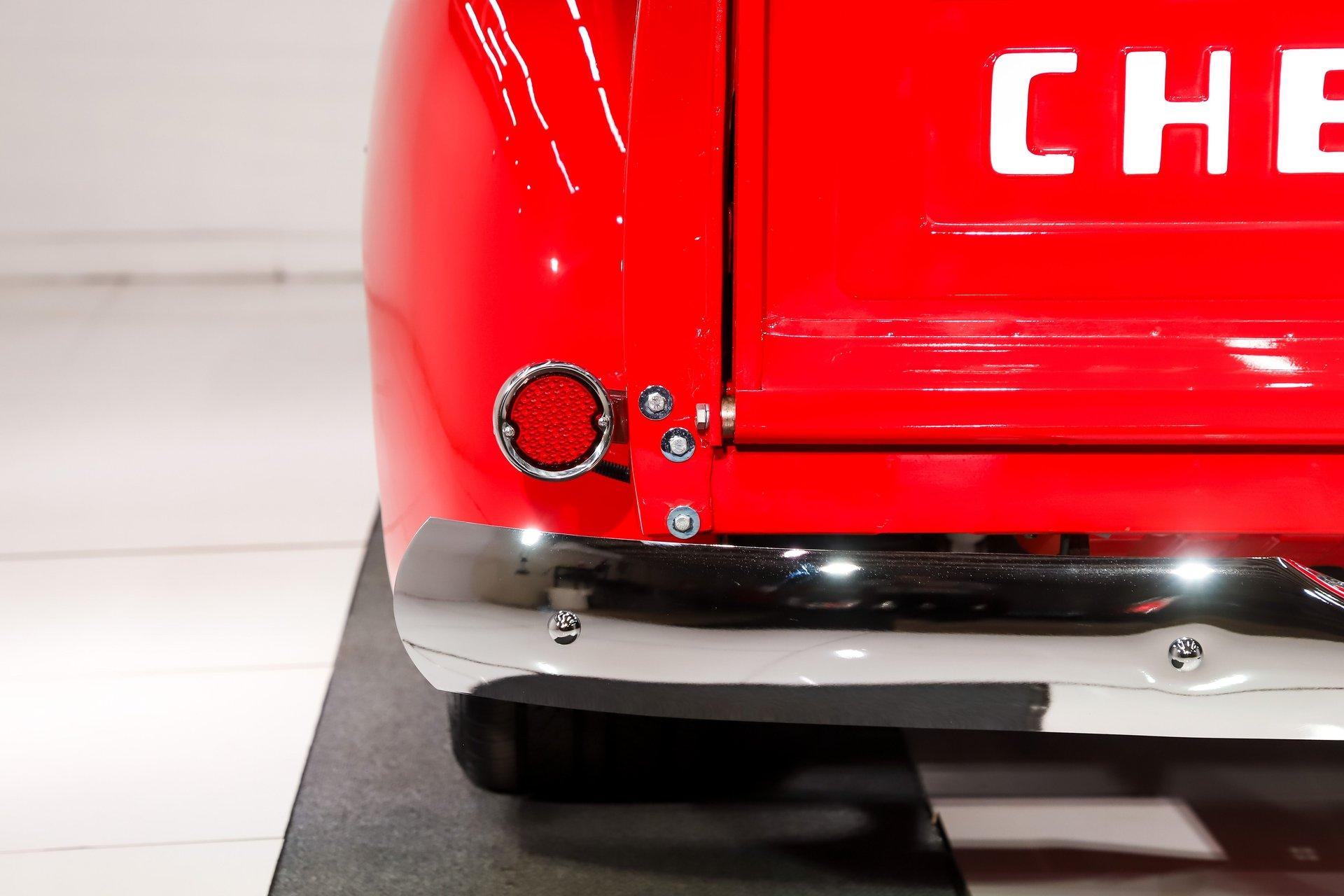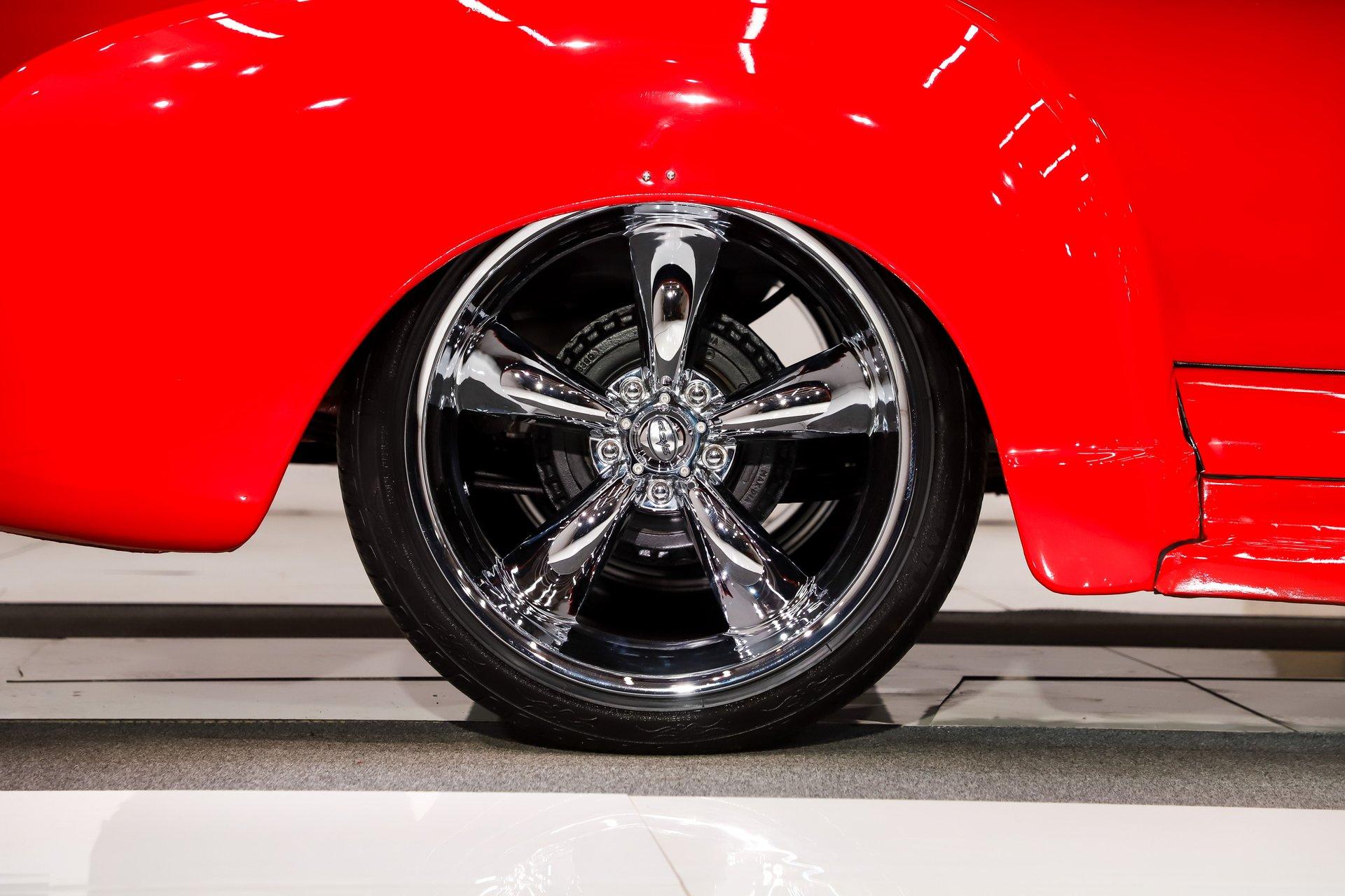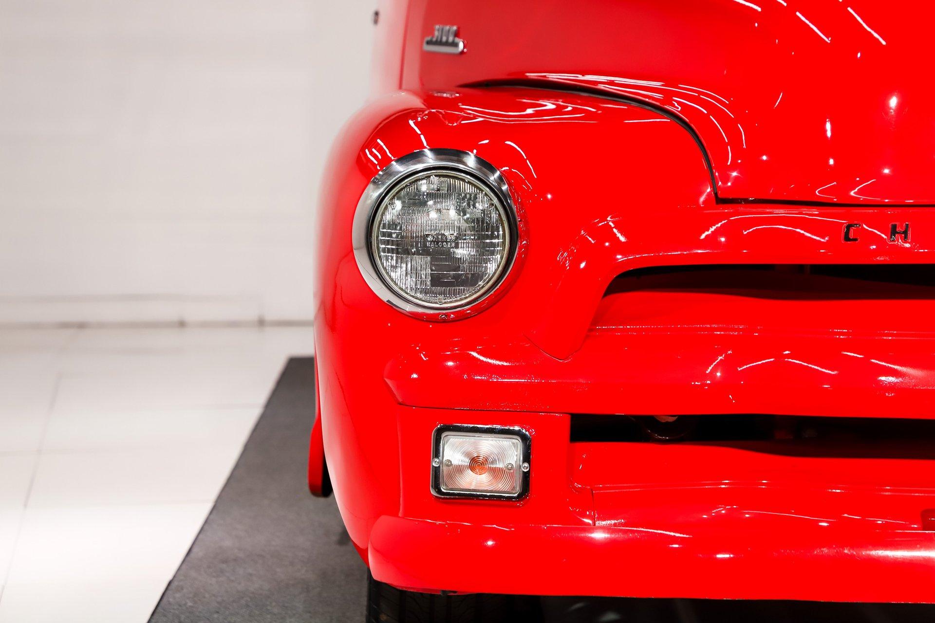 EXTERIOR: The color, stance and wheels gets this truck noticed. All metal body and fenders. It is straight, I did not find any damage or rust in my inspection. It looks like it was dipped in red nail polish with a smooth glossy bright red finish. The vent windows were removed for a cleaner look. All the glass and gaskets were replaced. Newport Speed electric wiper system. It has deluxe chrome trim around the door windows. The emblems, handles, mirrors and rear bumper look new. It has Chevrolet step plates on the running boards. LED tailights in back. It is lowered and sitting on a big set of chrome Coys wheels wrapped in performance tires.