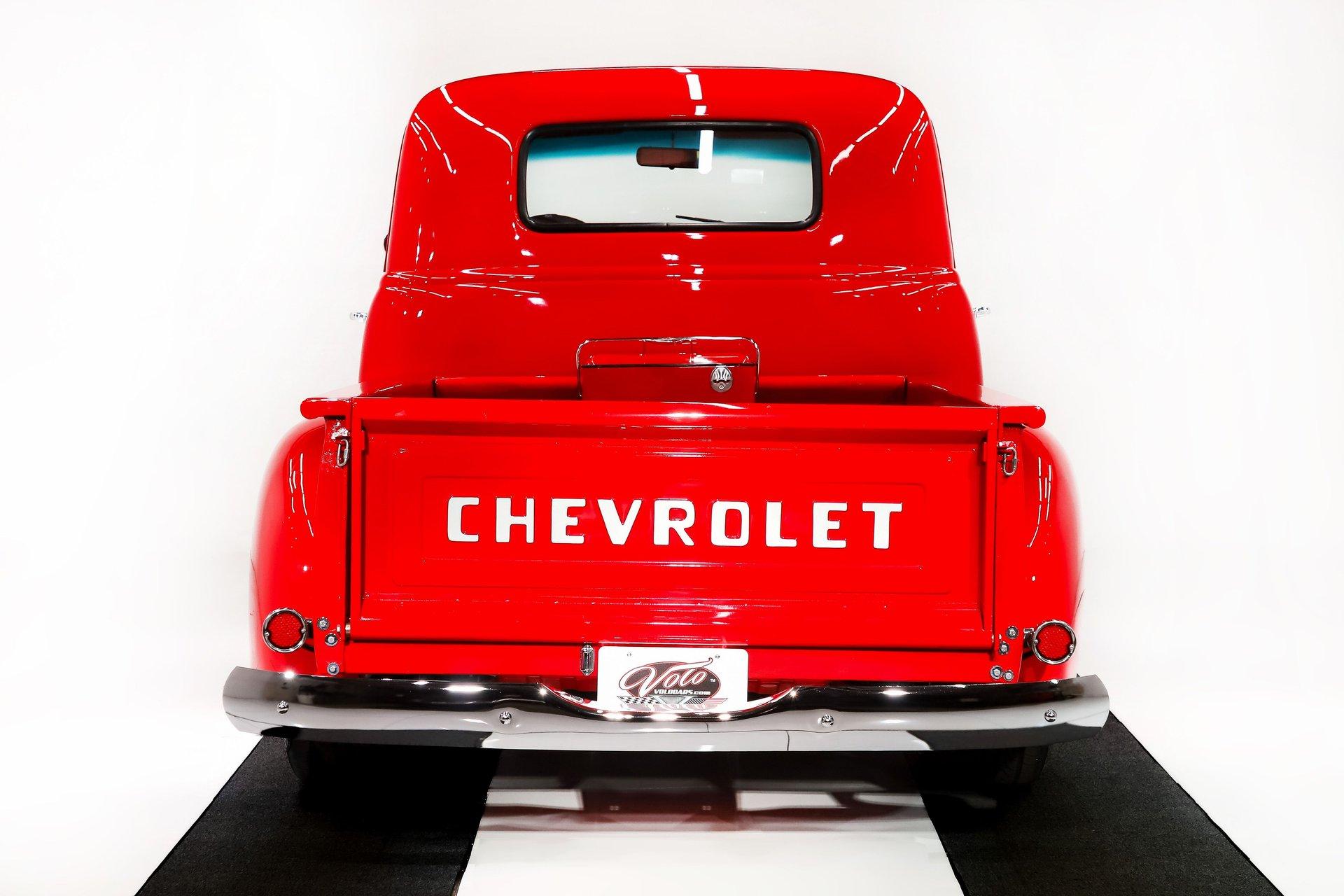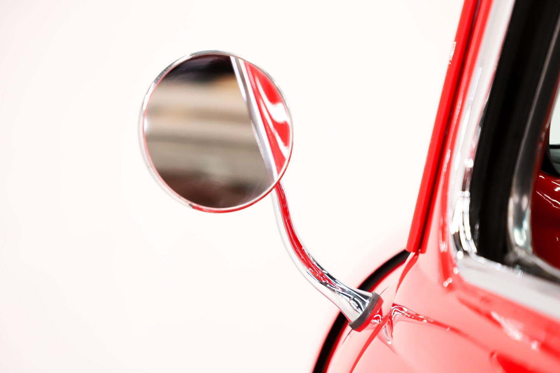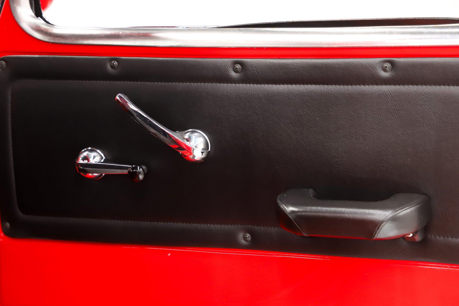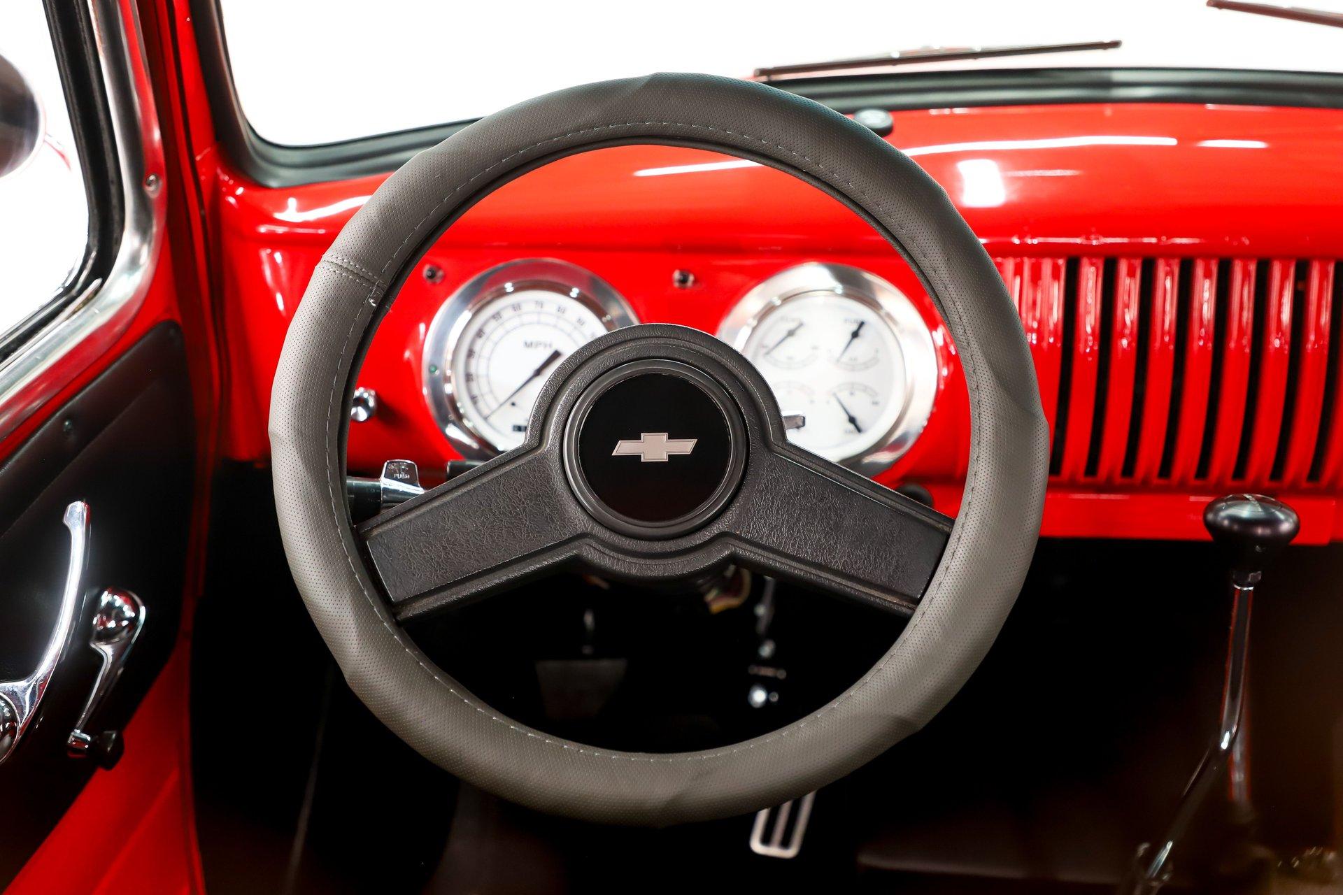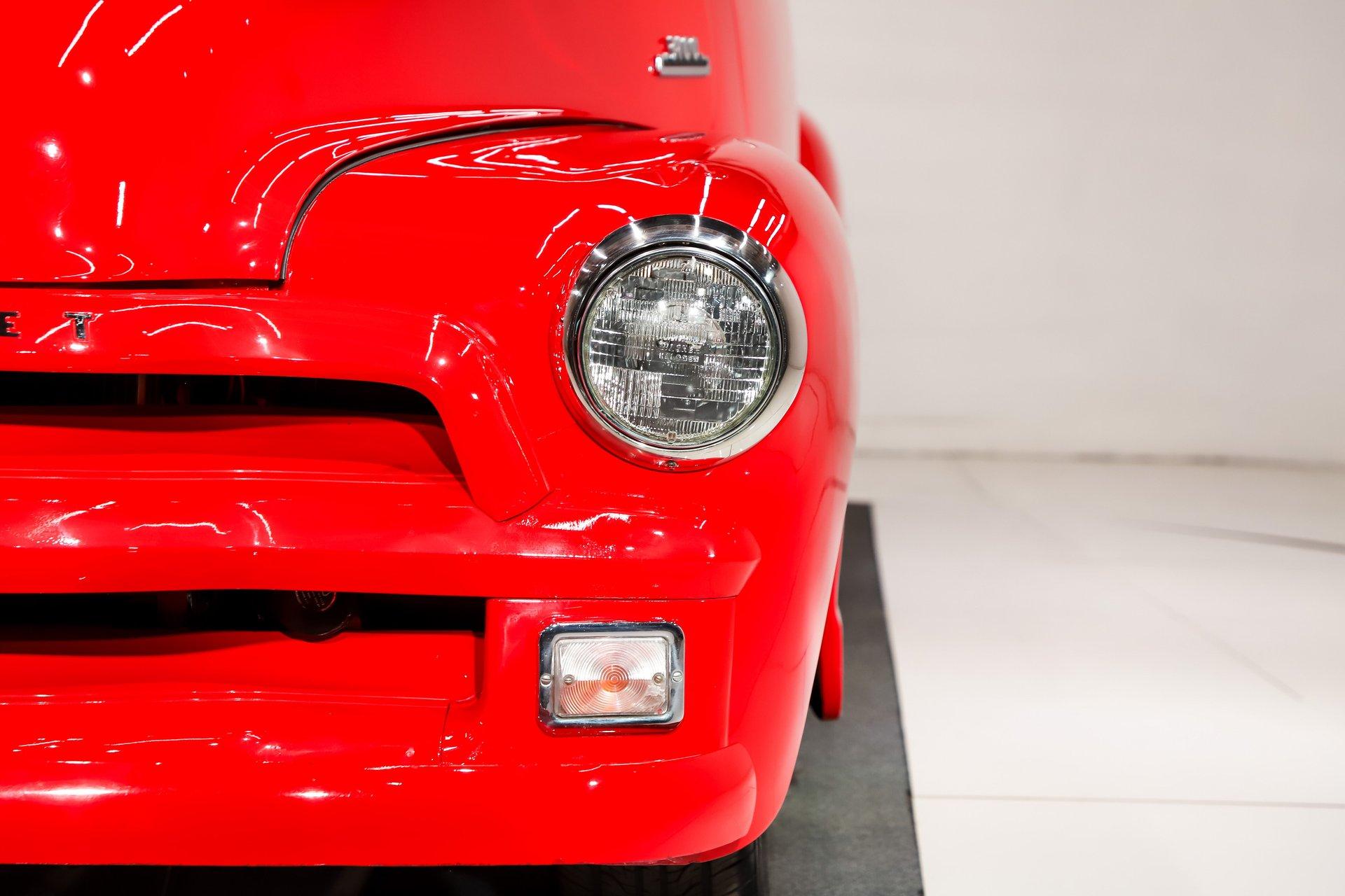 EXTERIOR: The color, stance and wheels gets this truck noticed. All metal body and fenders. It is straight, I did not find any damage or rust in my inspection. It looks like it was dipped in red nail polish with a smooth glossy bright red finish. The vent windows were removed for a cleaner look. All the glass and gaskets were replaced. Newport Speed electric wiper system. It has deluxe chrome trim around the door windows. The emblems, handles, mirrors and rear bumper look new. It has Chevrolet step plates on the running boards. LED tailights in back. It is lowered and sitting on a big set of chrome Coys wheels wrapped in performance tires.