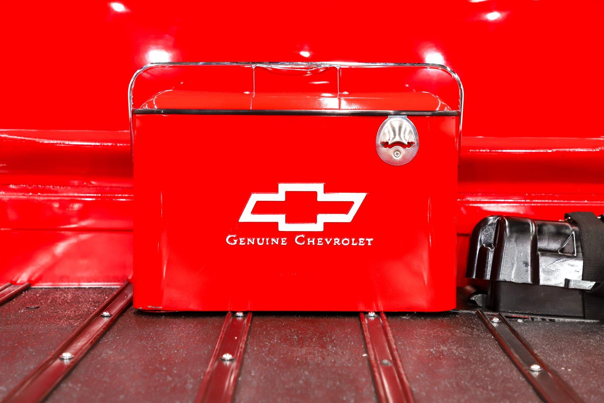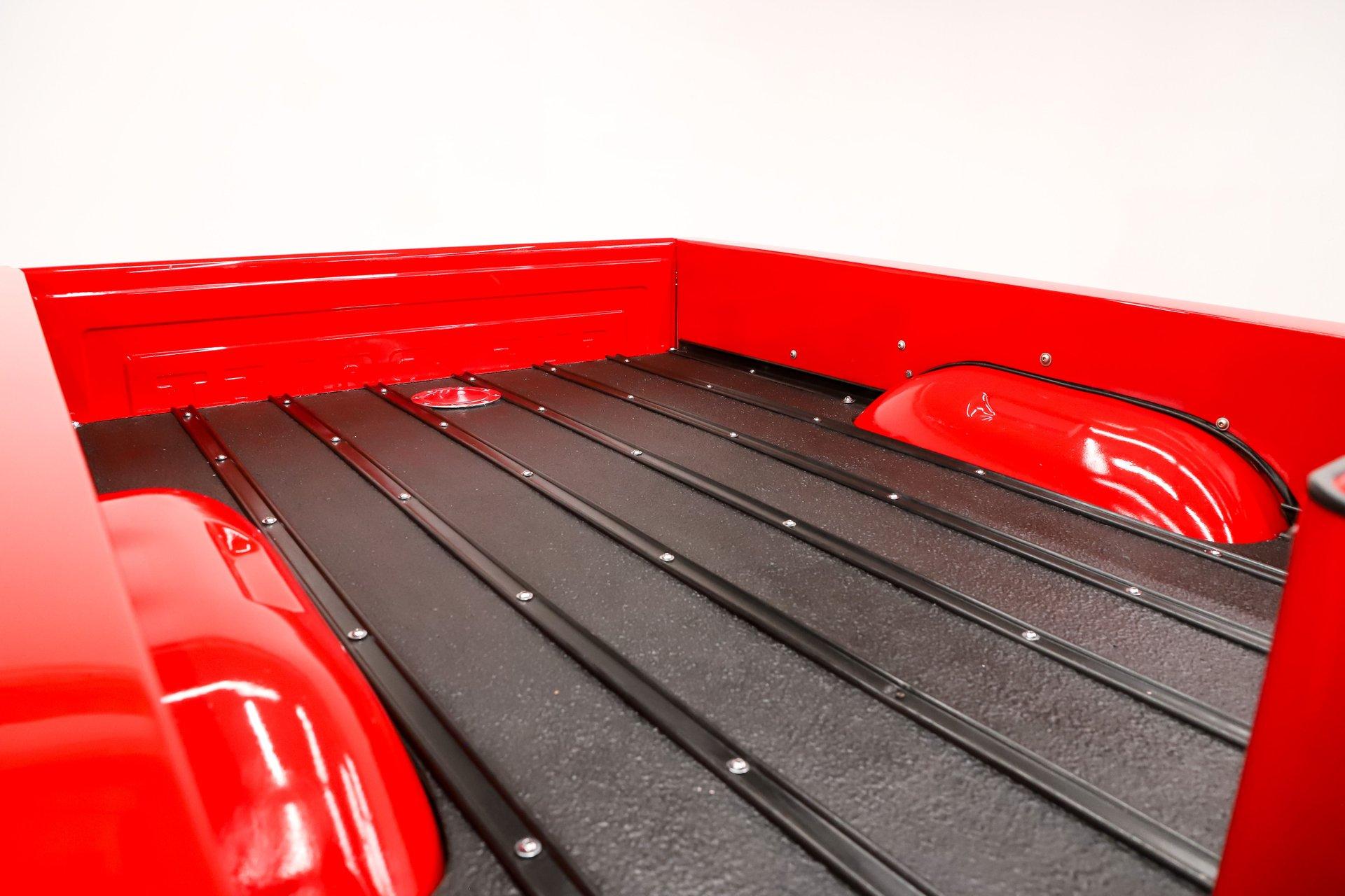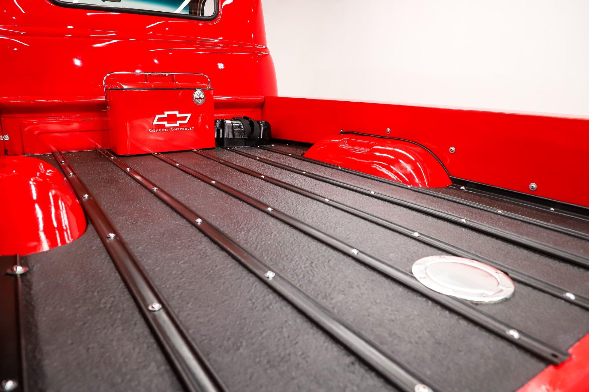 TRUNK COMPARTMENT: The bed floor was raised to accommodate the lowered suspension. It has refinished black boards, metal strips, and chrome hardware. The fuel filler is relocated to the floor. The battery is also relocated to the bed. There is a vintage cooler. The sidewalks are gloss red.